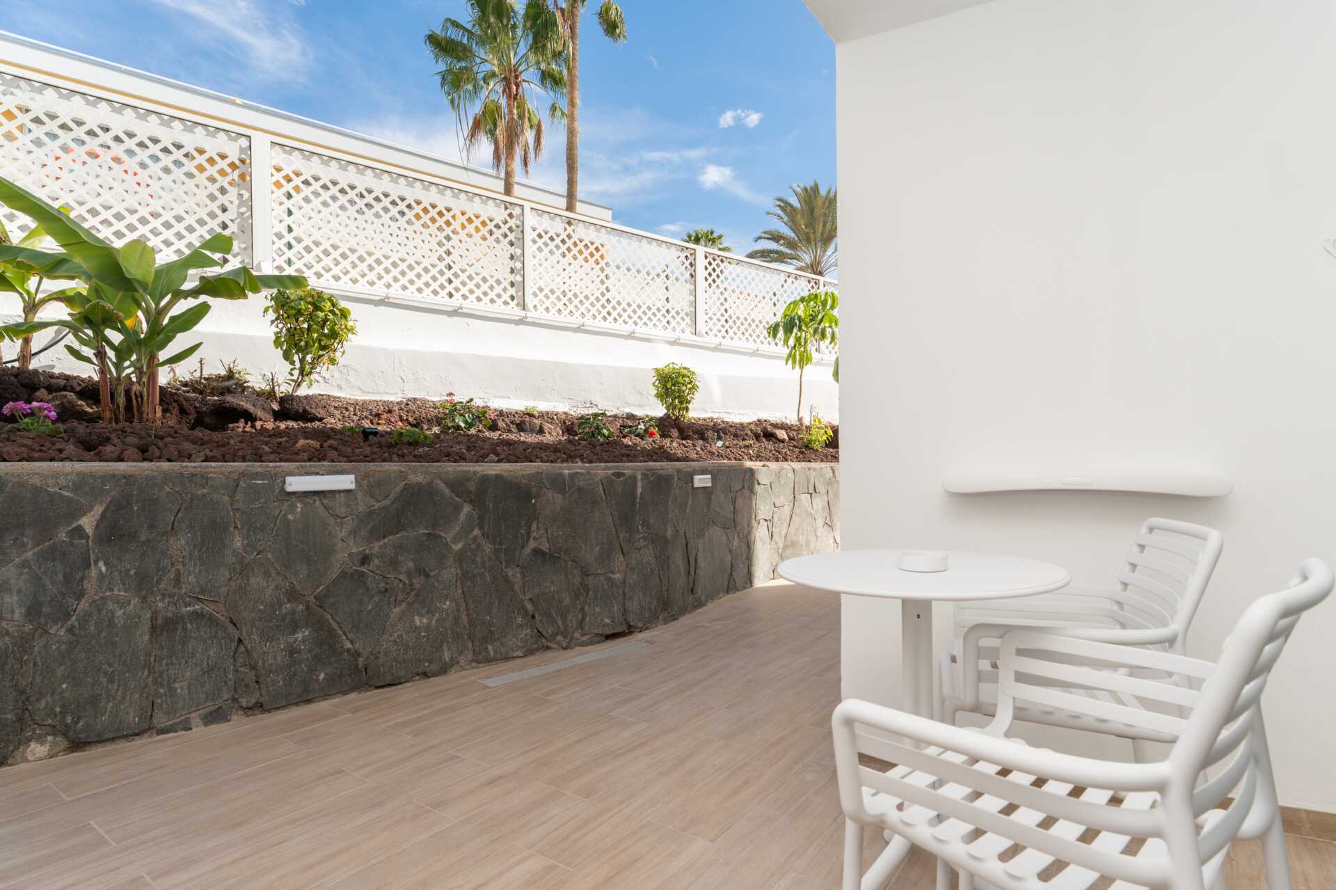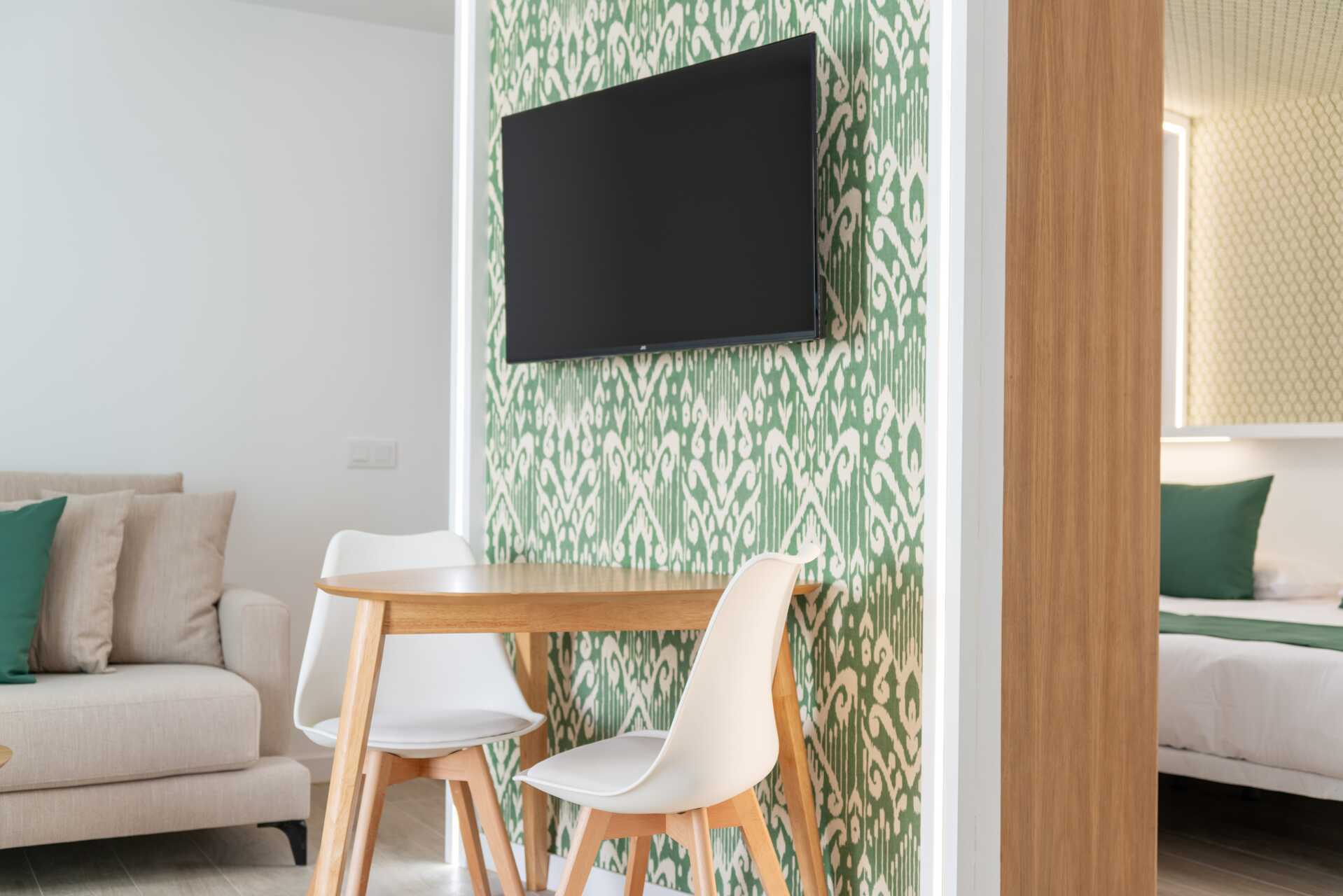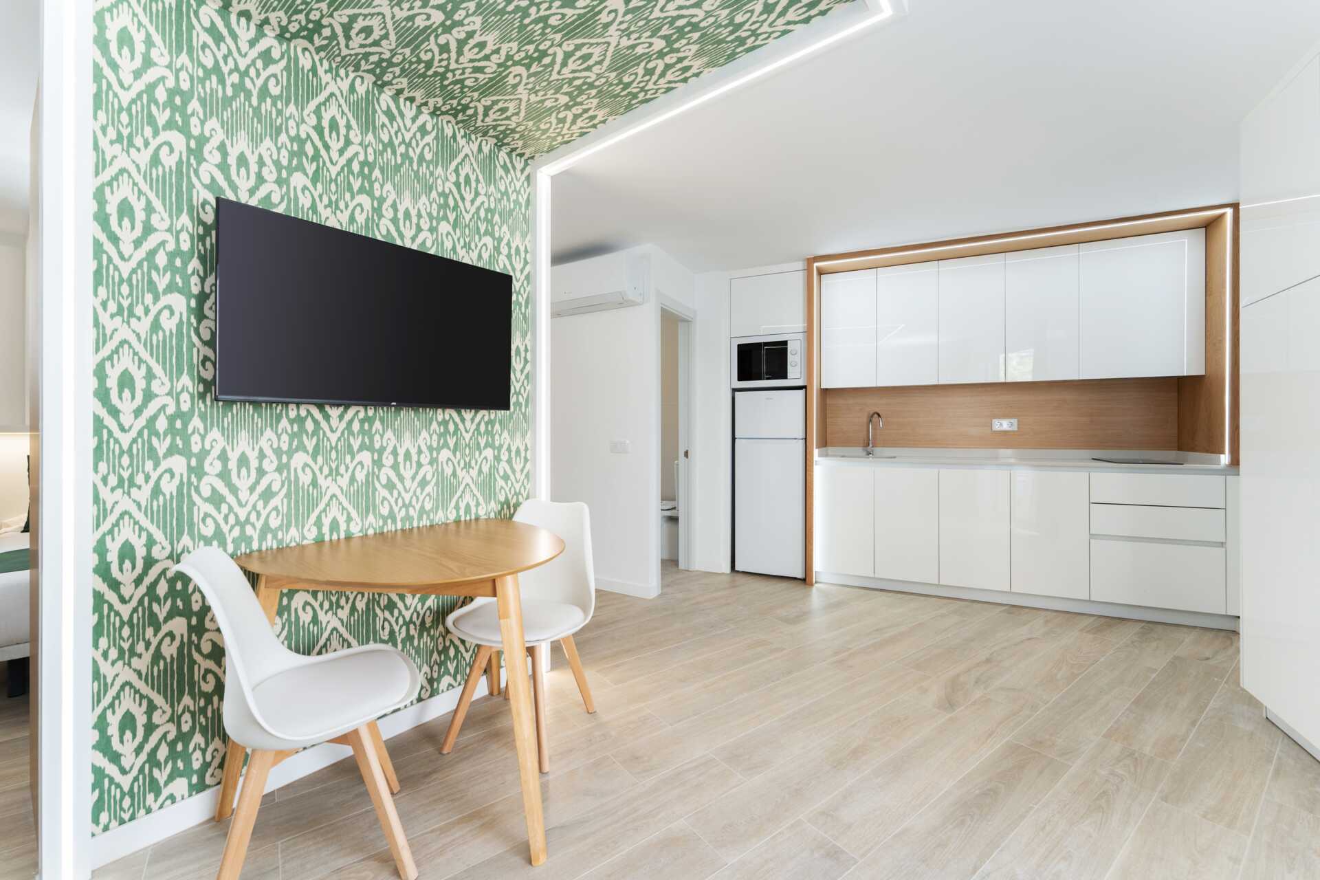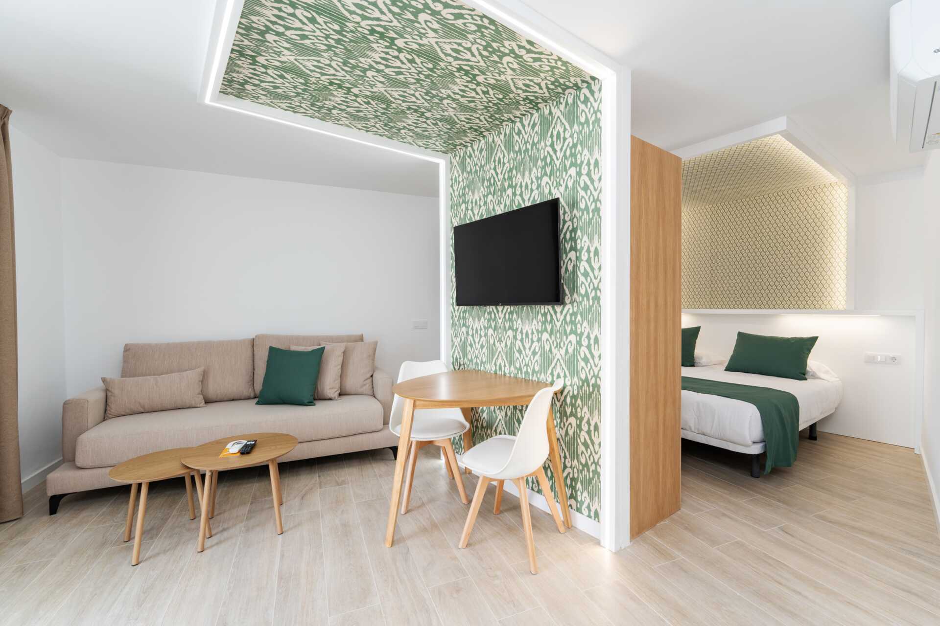 Enrumslägenhet med balkong eller terrass och poolutsikt. Sovrum med kombinerat vardagsrum och minikök. Två enkelsängar och en soffa. Minikök med kokplattor, kylskåp, kaffebryggare, vattenkokare, mikrovågsugn och enkel köksutrustning. Wifi ingår. Deponering mot avgift. Tv. Hårtork. Badrum med dusch och wc. Städning 4 ggr/vecka.