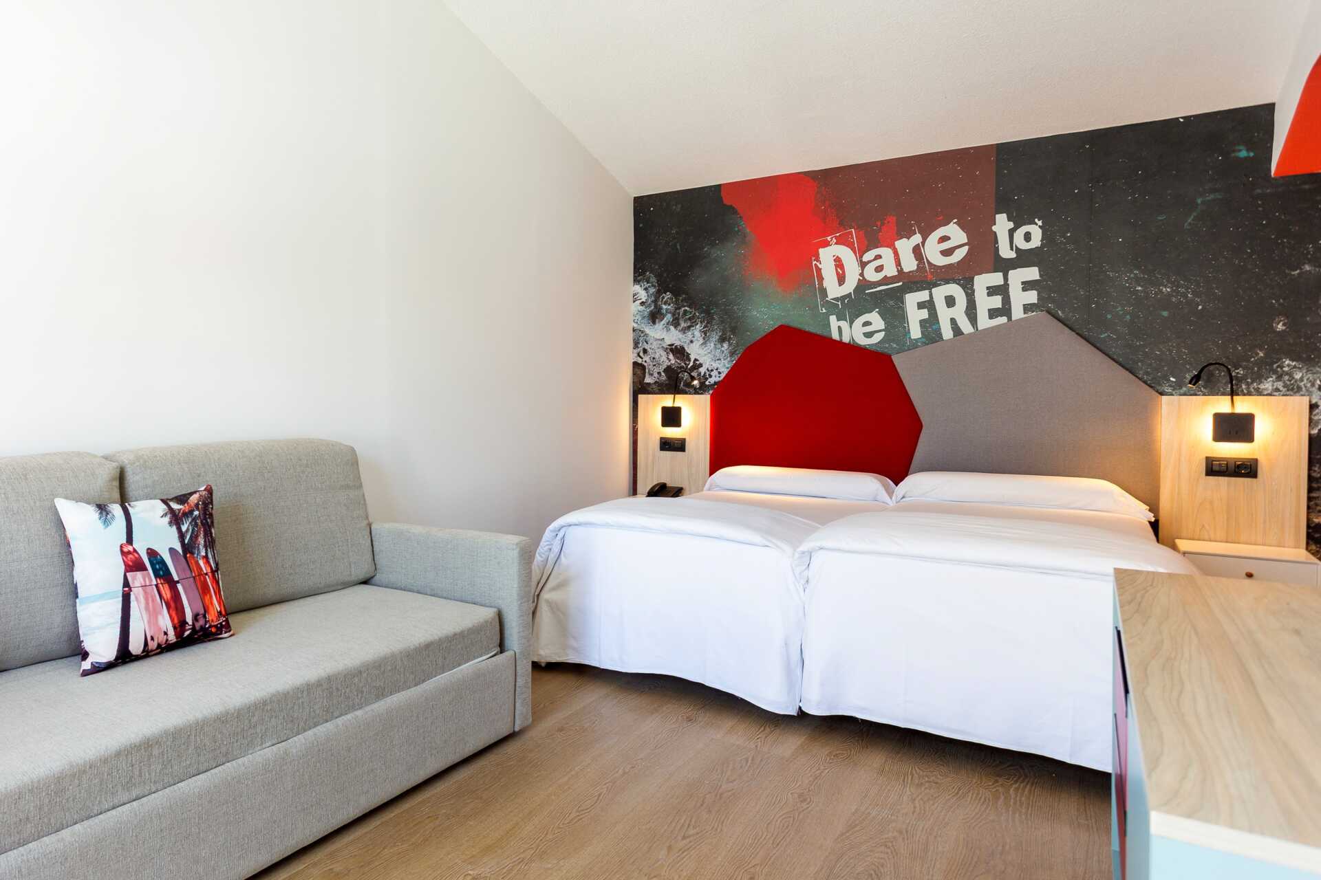 Juniorsvit med delad uteplats. Uteplatsen har två stolar och ett litet bord och är placerad vid en loftgång/passage. Två enkelsängar. Möjlighet till extrabädd i bäddsoffa. Kostnadsfritt wifi. Minibar. Badrum med dush och wc. Städning 3 ggr/vecka. Barn under två år räknas in i max antal personer i rummet.