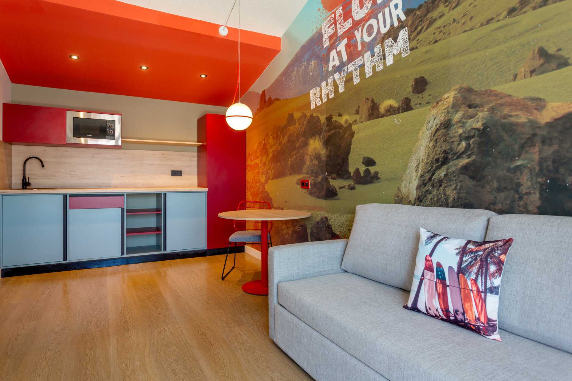 Svit med delad uteplats. Uteplatsen har två stolar och ett litet bord och är placerad vid en loftgång/passage. Sviten består av ett sovrum och ett vardagsrum. Två enkelsängar. Möjlighet till extrabädd i bäddsoffa. Kostnadsfritt wifi. Minibar. Mikrovågsugn. Badrum med dush och wc. Städning 3 ggr/vecka. Barn under två år räknas in i max antal personer i rummet.