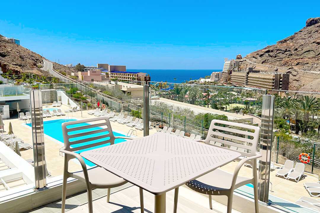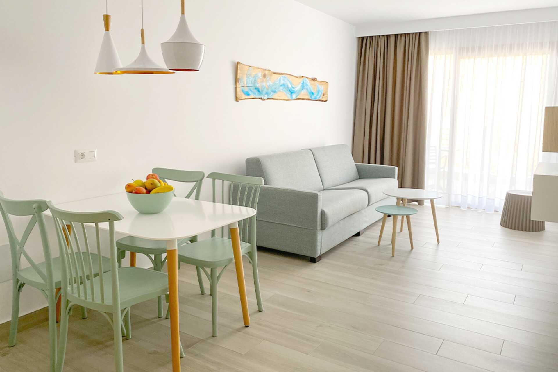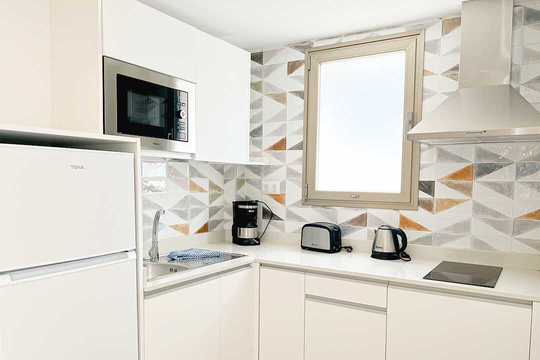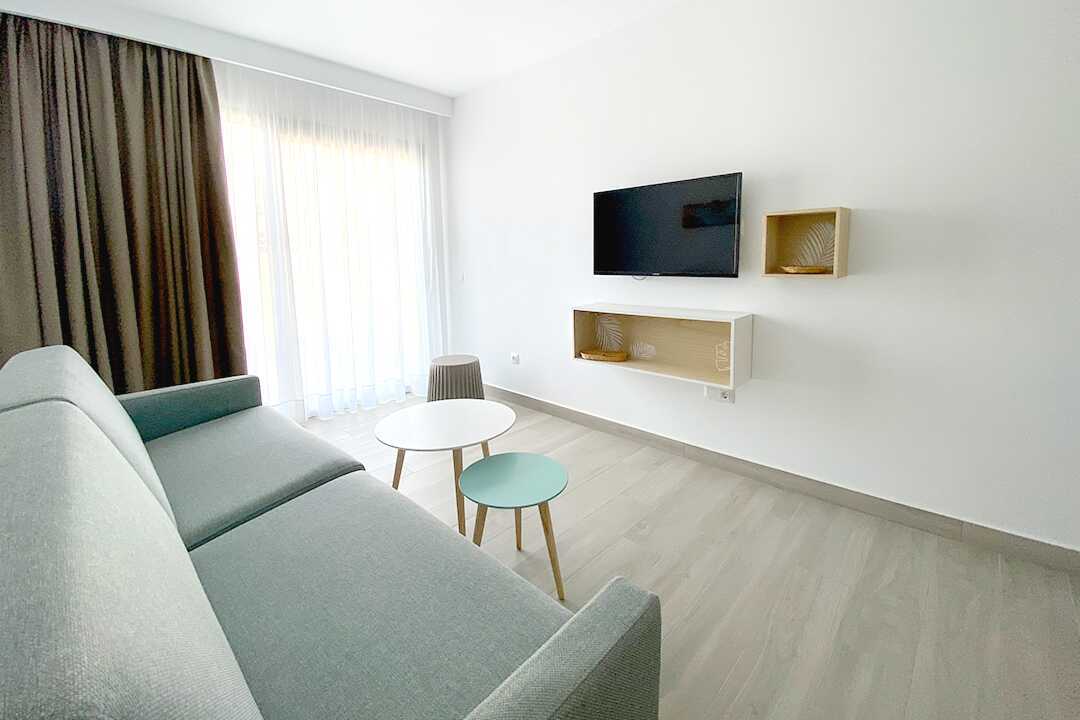 Tvårumslägenhet med balkong eller terrass. Sovrum och kombinerat vardagsrum med minikök. Två enkelsängar. Möjlighet till extrabäddar i bäddsoffa. Minikök med spis, kylskåp med frysfack, mikrovågsugn, vattenkokare, brödrost, kaffebryggare och enkel köksutrustning. Wifi och luftkonditionering ingår. Deponering mot avgift. Tv med internationella kanaler. Hårtork. Badrum med dusch och wc. Städning 5 ggr/vecka.