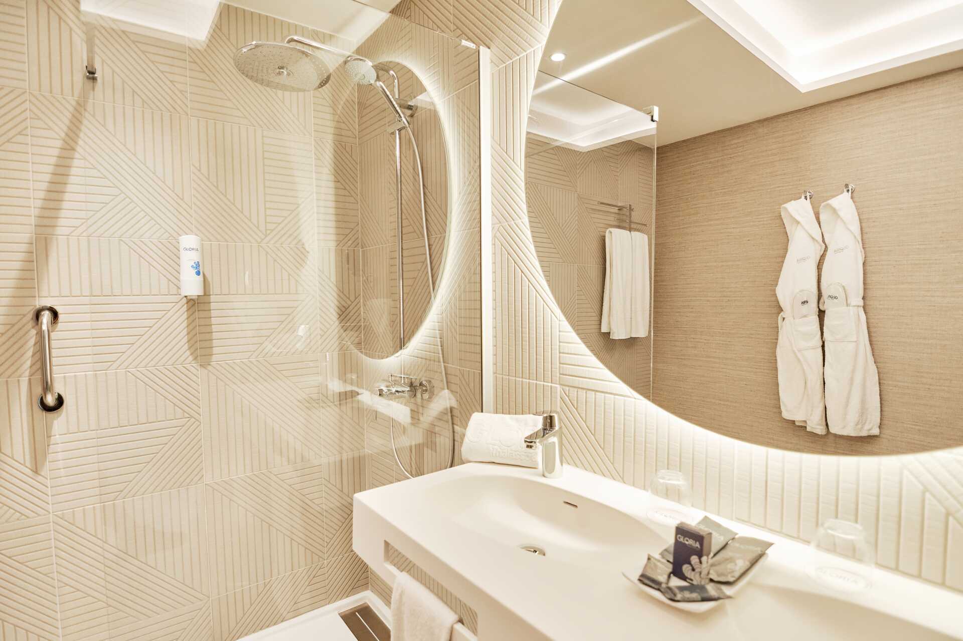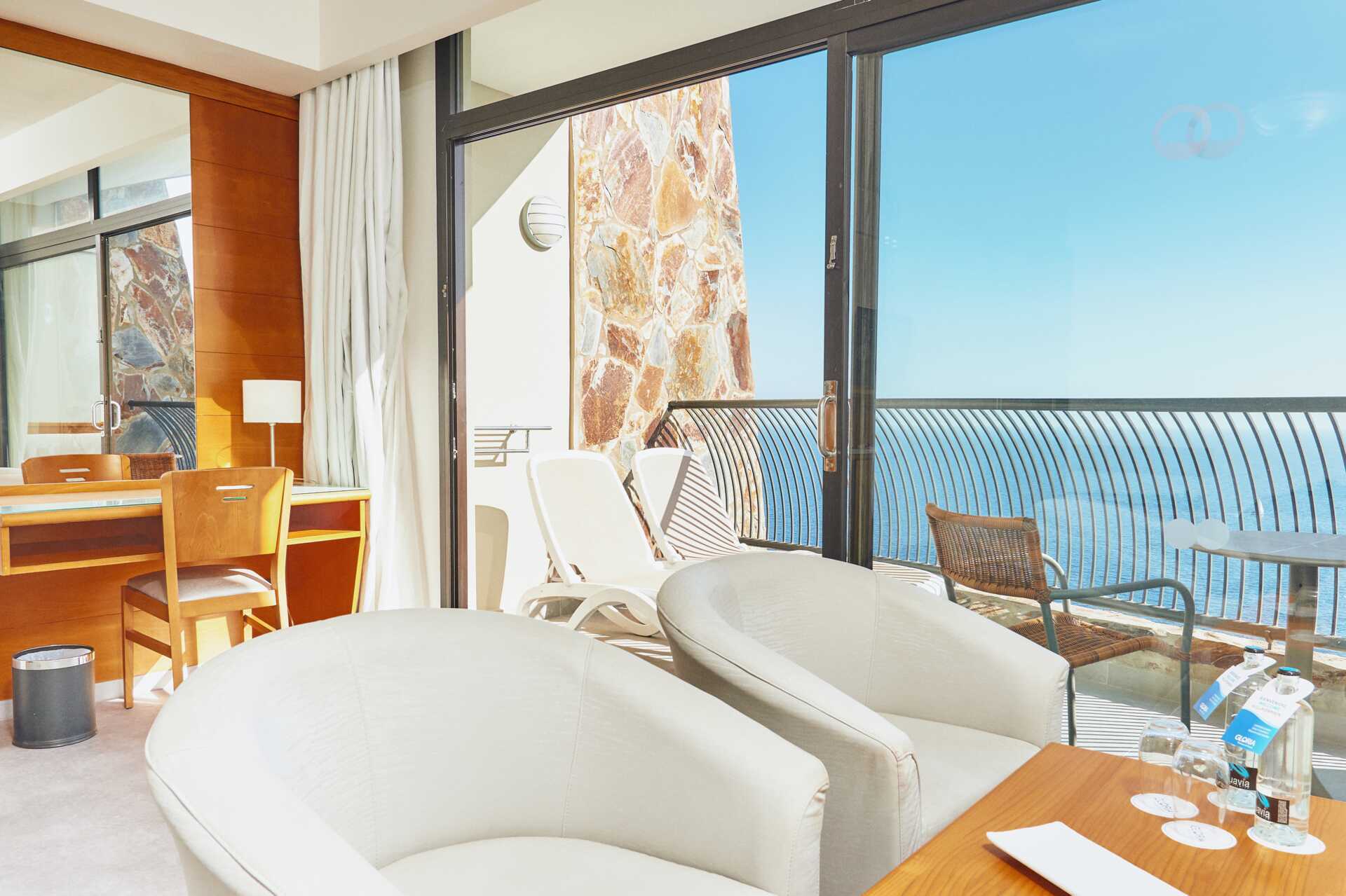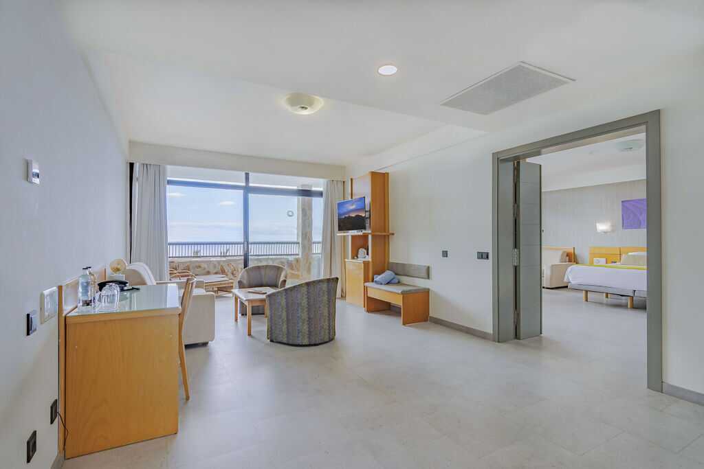 Tvårumssvit med balkong och havsutsikt. Sviten består av ett vardagsrum och ett sovrum. På balkongen finns två solstolar. En dubbelsäng och en enkelsäng. Wifi och luftkonditionering ingår. Deponering mot avgift. Minibar mot avgift. Vattenkokare. Tv med internationella kanaler. Poolhanddukar finns i sviten vid ankomst. Badrockar och tofflor. Hårtork. Badrum med badkar eller dusch samt wc. Städning 7 ggr/vecka.
