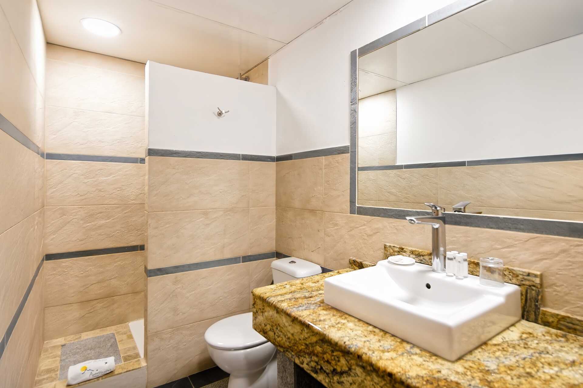 Trerumslägenhet med balkong, vissa med begränsad havsutsikt eller med havsutsikt. Två sovrum, varav det ena är mindre än det andra, samt ett kombinerat vardagsrum/minikök. Ett sovrum med en dubbelsäng och ett med två enkelsängar. Möjlighet till extrabädd i bäddsoffa. Minikök med kokplattor, kylskåp, brödrost, kaffebryggare, vattenkokare, mikrovågsugn och enkel köksutrustning. Några lägenheter har bardisk som matplats. Wifi ingår. Luftkonditionering och deponering mot avgift. Tv med internationella kanaler. Hårtork. Badrum med dusch och wc. Städning 5 ggr/vecka.