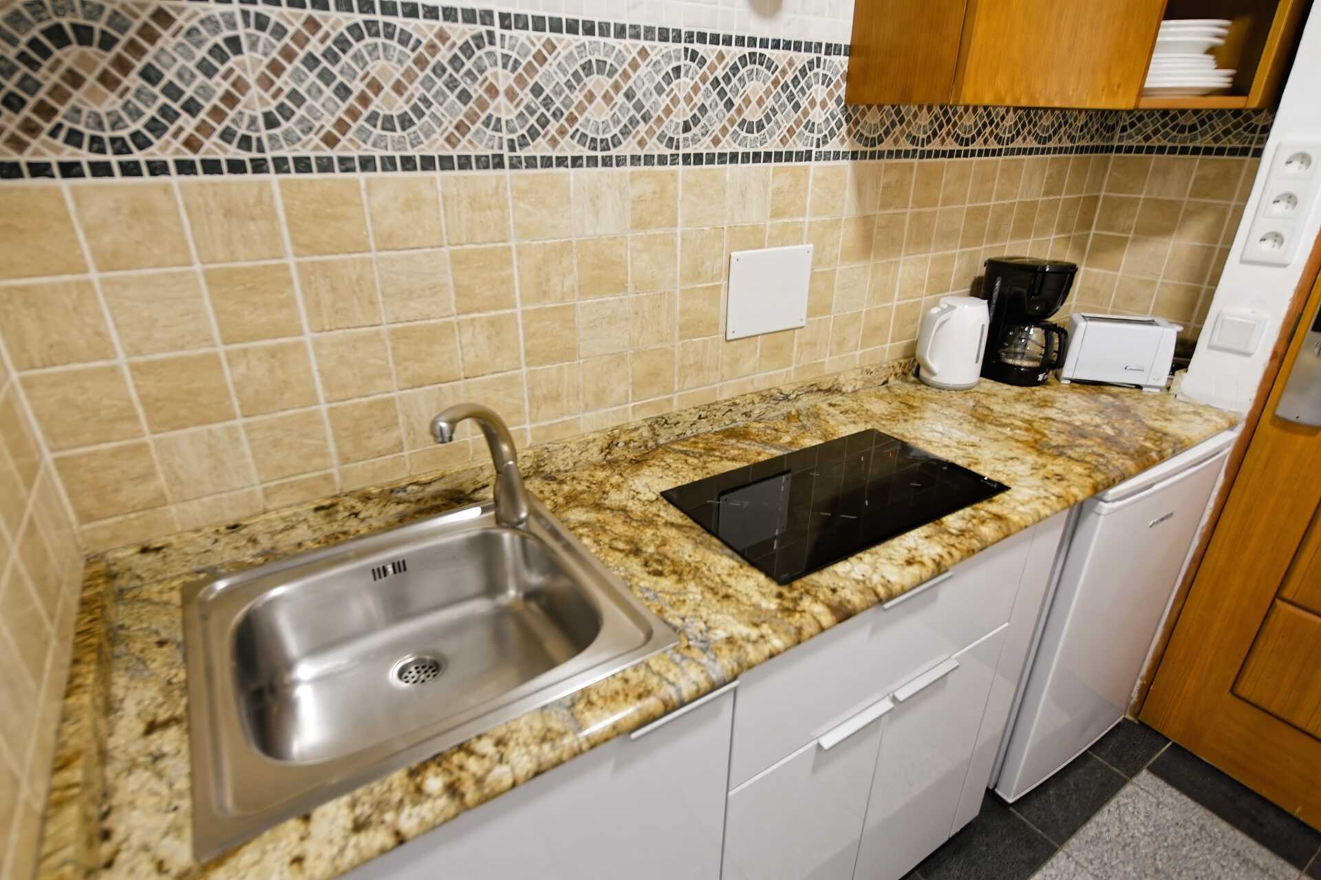 Enrumslägenhet med balkong, vissa med begränsad havsutsikt. Kombinerat sovrum med minikök. En dubbelsäng. Minikök med kokplattor, kylskåp, brödrost, kaffebryggare, vattenkokare, mikrovågsugn och enkel köksutrustning. Några lägenheter har bardisk som matplats. Wifi ingår. Luftkonditionering och deponering mot avgift. Tv med internationella kanaler. Hårtork. Badrum med dusch och wc. Städning 5 ggr/vecka.