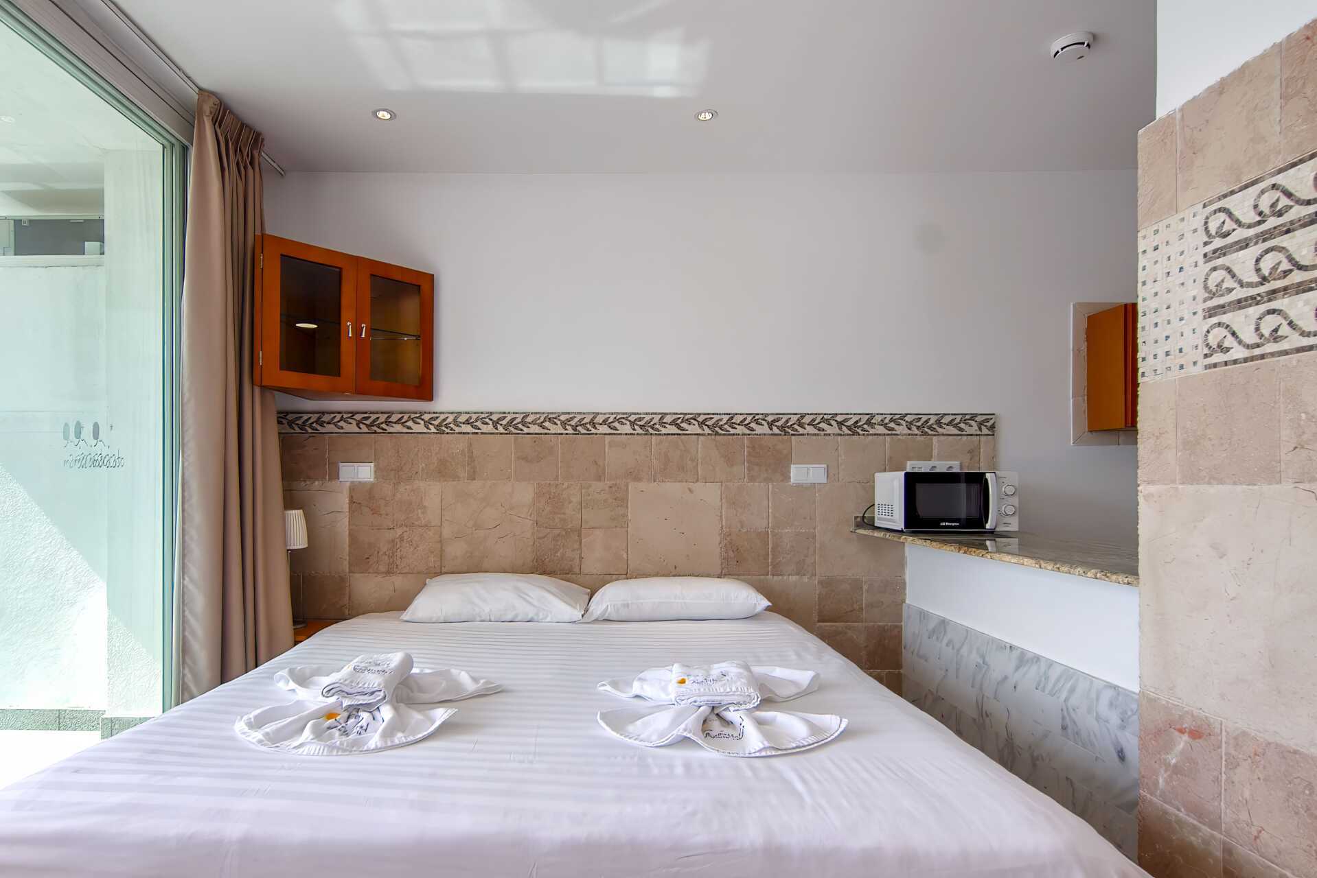 Enrumslägenhet deluxe med balkong och havsutsikt. Lägenheterna ligger på femte våningen. Sovrum kombinerat med minikök. En dubbelsäng. Minikök med kokplattor, kylskåp, brödrost, kaffebryggare, vattenkokare, mikrovågsugn och enkel köksutrustning. Några lägenheter har bardisk som matplats. Wifi, luftkonditionering och deponering ingår. Tv med internationella kanaler. Hårtork. Badrum med dusch och wc. Städning 7 ggr/vecka.
