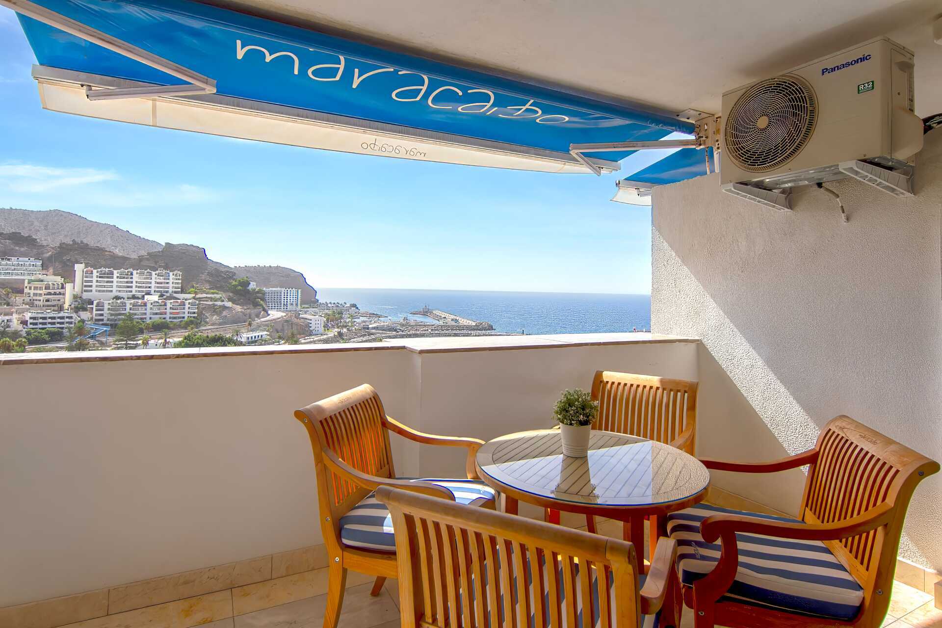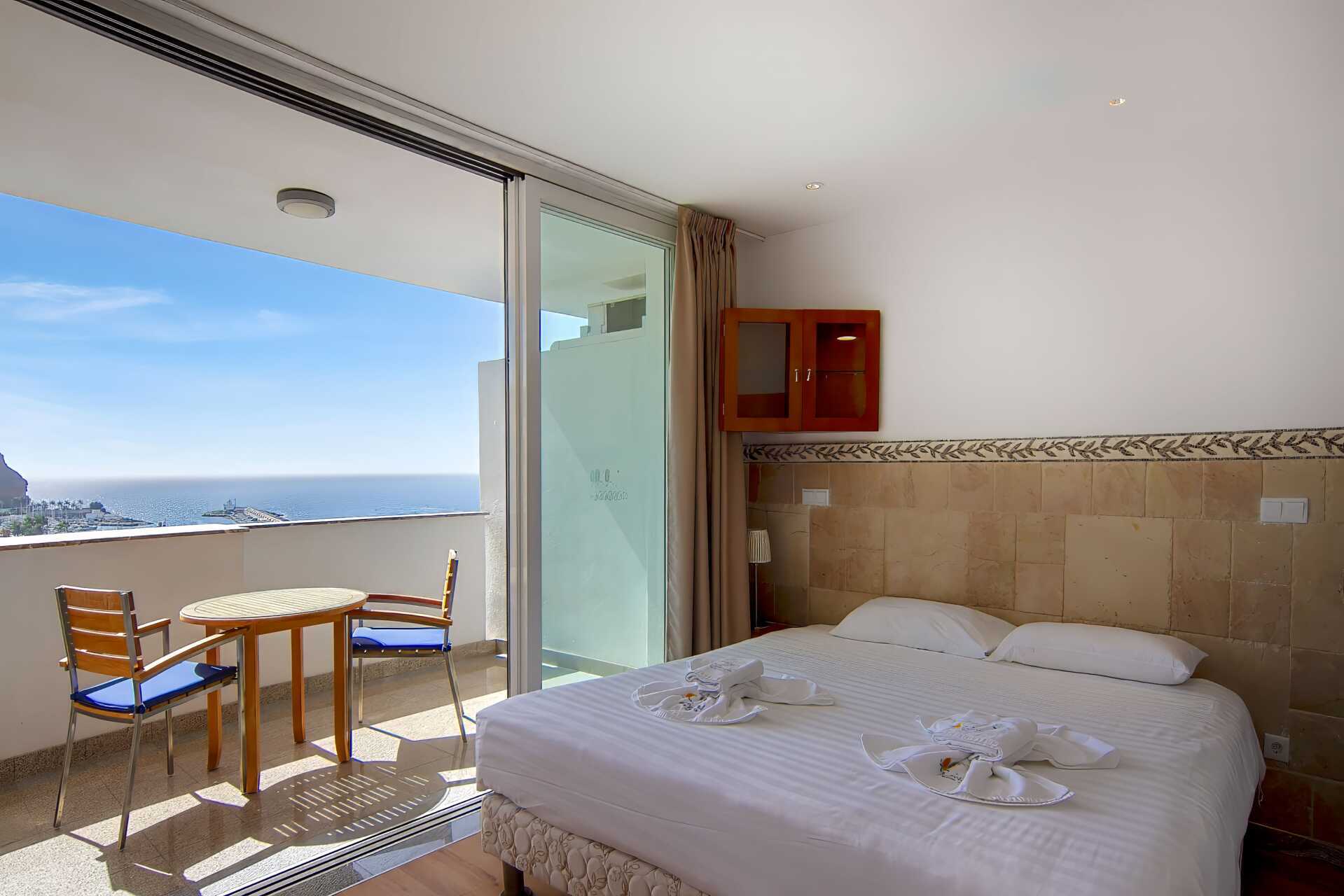 Enrumslägenhet deluxe med balkong och havsutsikt. Lägenheterna ligger på femte våningen. Kombinerat sovrum med minikök. En dubbelsäng. Minikök med kokplattor, kylskåp, brödrost, kaffebryggare, vattenkokare, mikrovågsugn och enkel köksutrustning. Några lägenheter har bardisk som matplats. Wifi, luftkonditionering och deponering ingår. Tv med internationella kanaler. Hårtork. Badrum med dusch och wc. Städning 7 ggr/vecka.