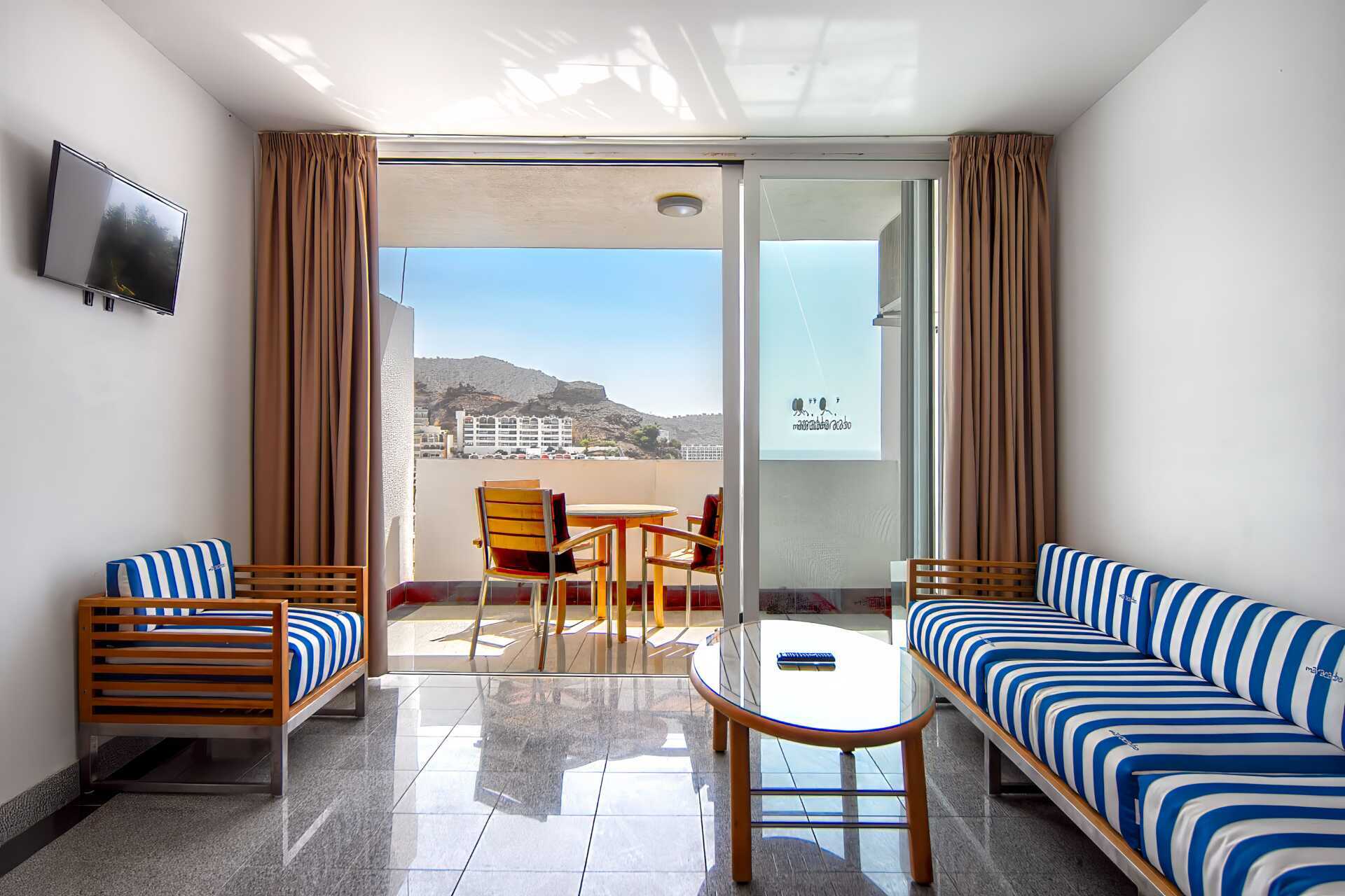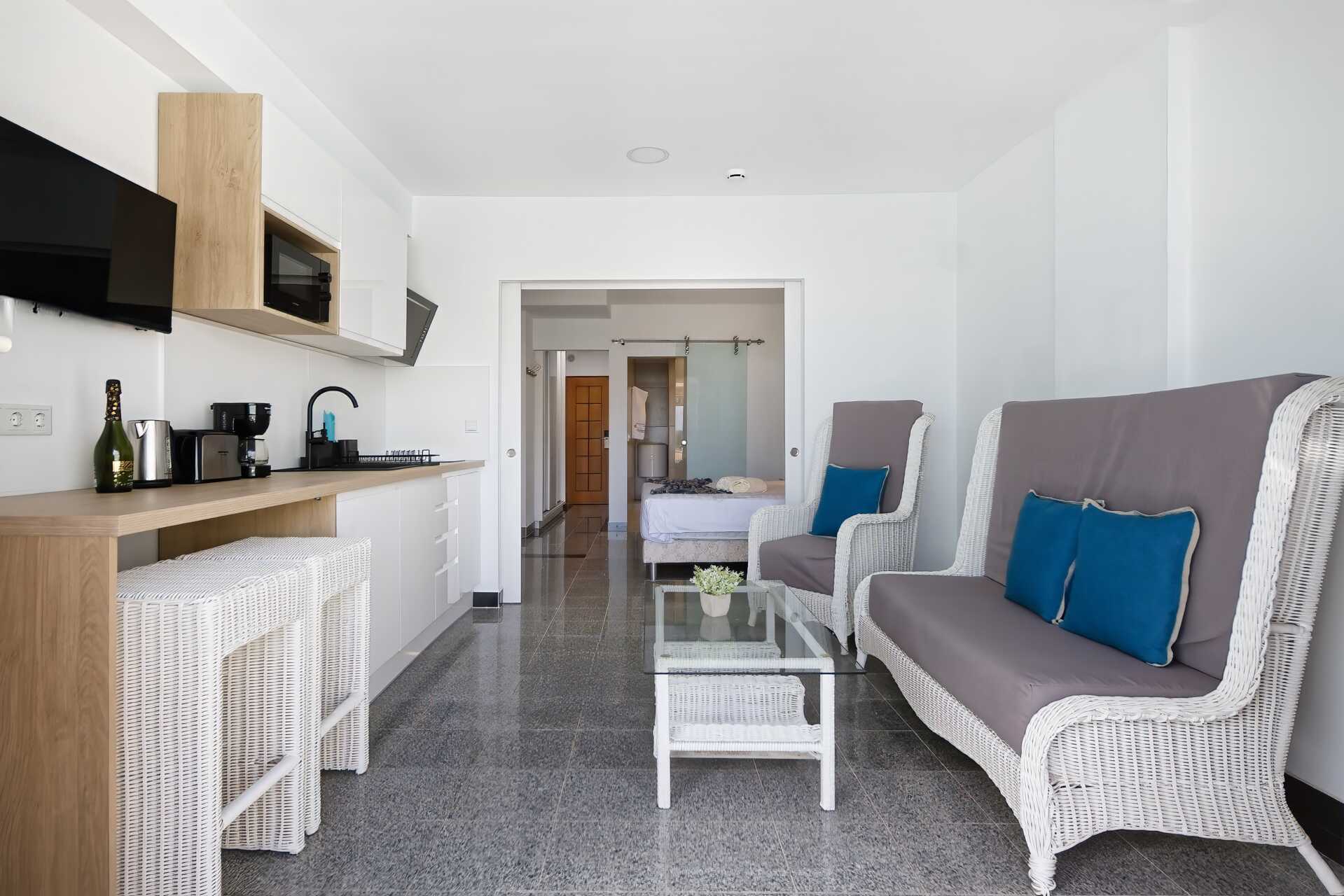 Enrumslägenhet superior med balkong och havsutsikt. Lägenheterna ligger på tredje eller fjärde våningen. Kombinerat sovrum med minikök. En dubbelsäng. Minikök med kokplattor, kylskåp, brödrost, kaffebryggare, vattenkokare, mikrovågsugn och enkel köksutrustning. Några lägenheter har bardisk som matplats. Wifi och luftkonditionering ingår. Deponering mot avgift. Tv med internationella kanaler. Hårtork. Badrum med dusch och wc. Städning 6 ggr/vecka.