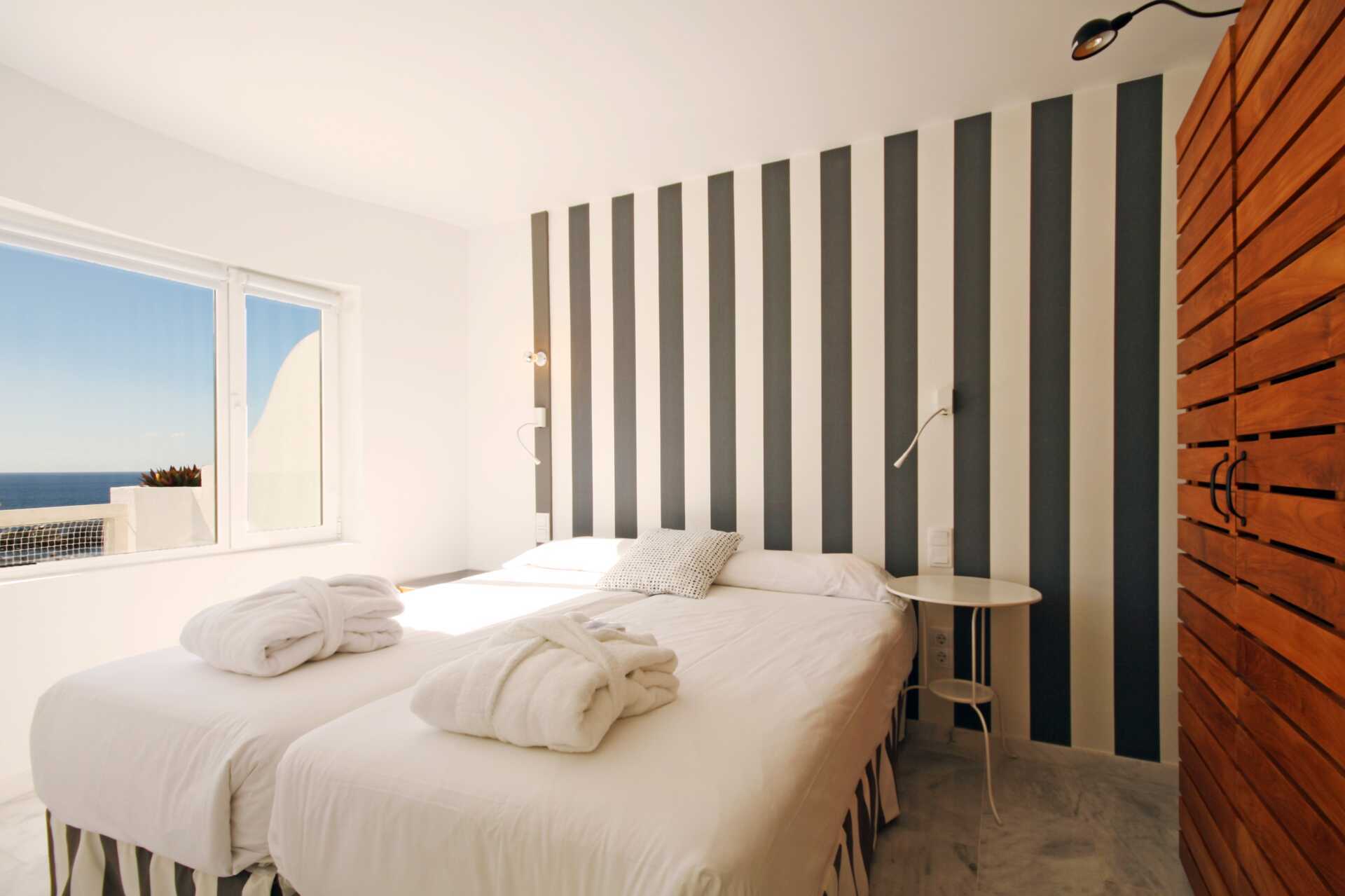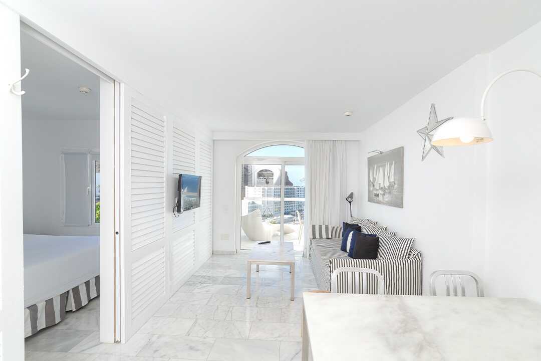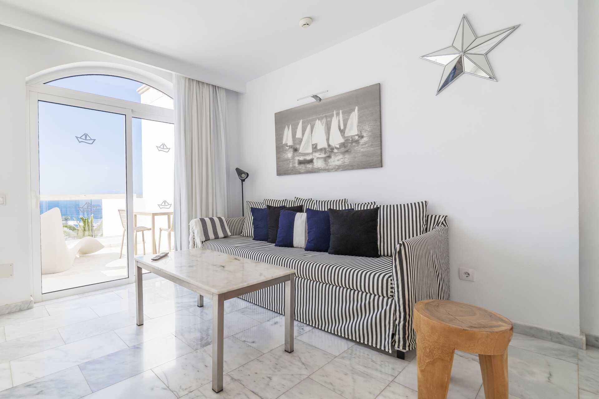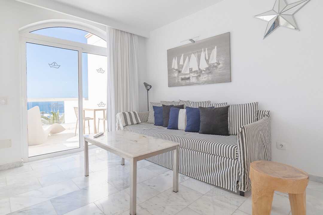 Tvårumslägenhet superior med balkong eller terrass och begränsad havsutsikt. Lägenheterna är lugnt belägna. Några lägenheter är i etage. Sovrum och kombinerat vardagsrum med minikök. Två enkelsängar. Möjlighet till extrabädd i bäddsoffa. Minikök med kylskåp, kokplattor, kaffebryggare, brödrost, vattenkokare och enkel köksutrustning. Wifi och luftkonditionering. Deponering mot avgift. Tv med internationella kanaler. Hårtork. Badrum med dusch och wc. Städning 5 ggr/vecka.