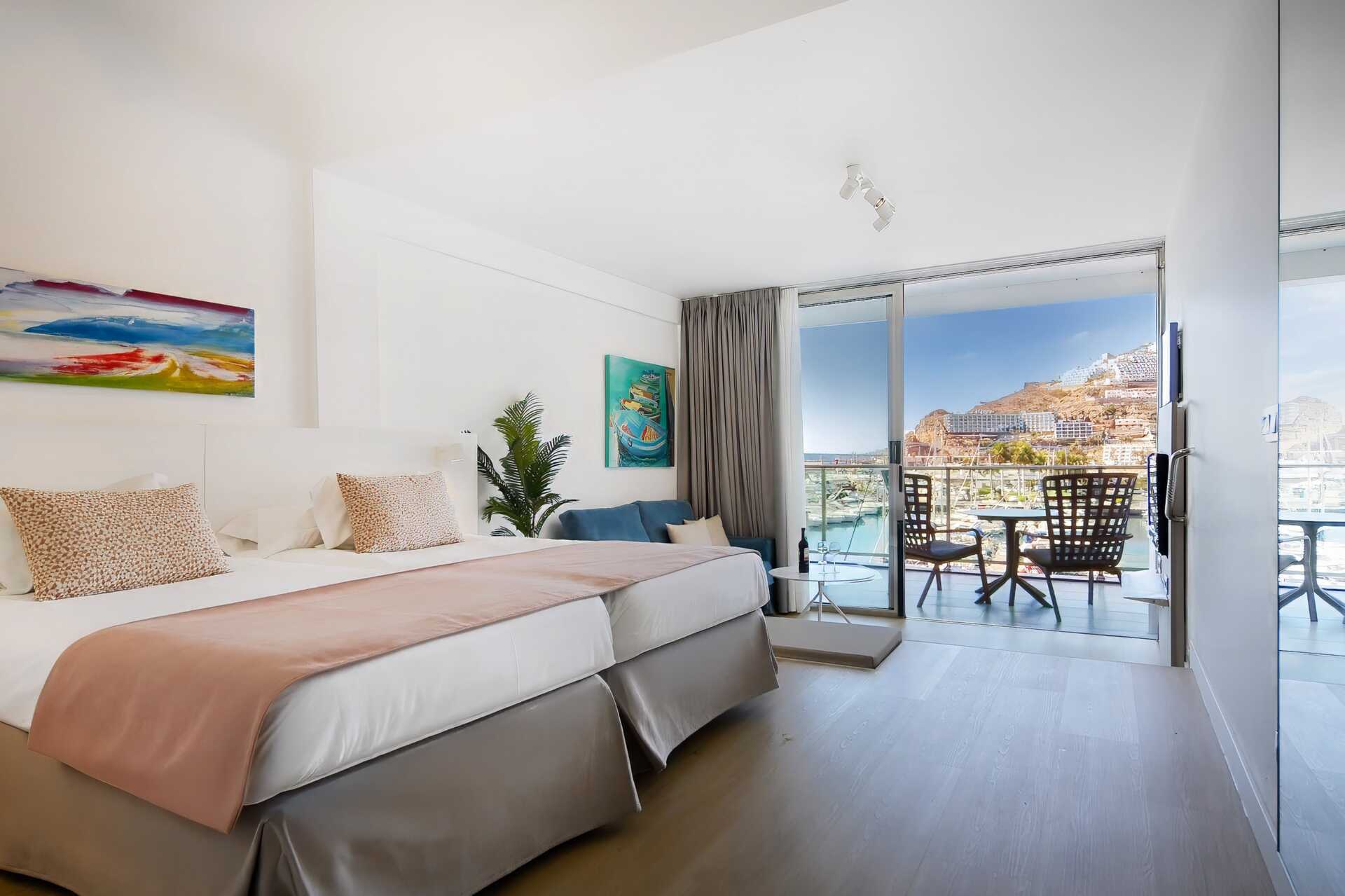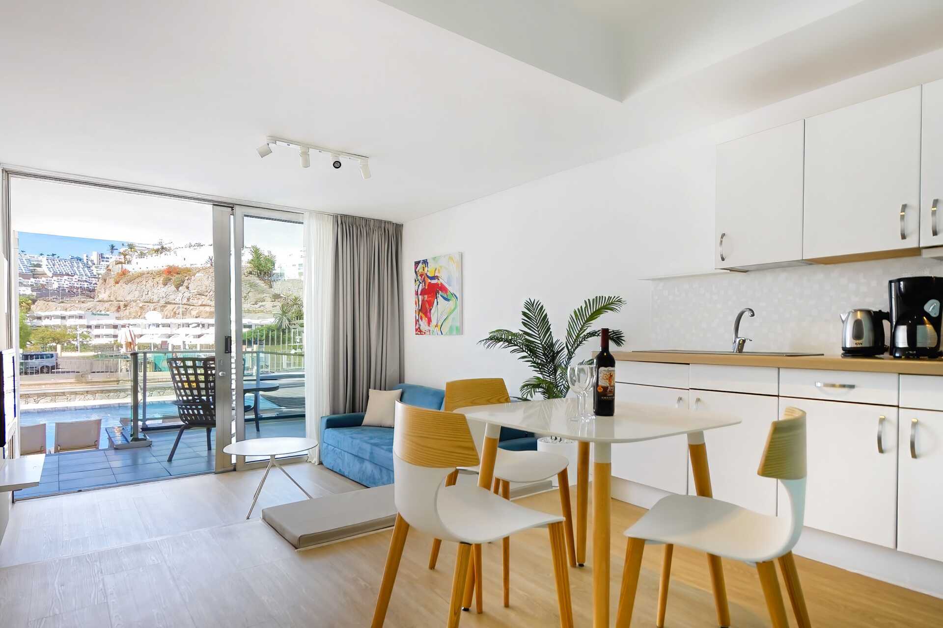 Tvårumslägenhet med balkong eller terrass. Vissa balkonger i markplan. Sovrum och kombinerat vardagsrum med minikök. I några lägenheter saknas dörr till sovrummet. Miniköket skiljs åt från vardagsrummet med två trappsteg. Två enkelsängar. Möjlighet till extrabädd i bäddsoffa. Minikök med kylskåp och frys, kokplattor, mikrovågsugn, kaffebryggare, brödrost, vattenkokare och enkel köksutrustning. Wifi och luftkonditionering ingår. Deponering mot avgift. Tv med internationella kanaler. Hårtork. Badrum med badkar eller dusch samt wc. Städning 7 ggr/vecka.