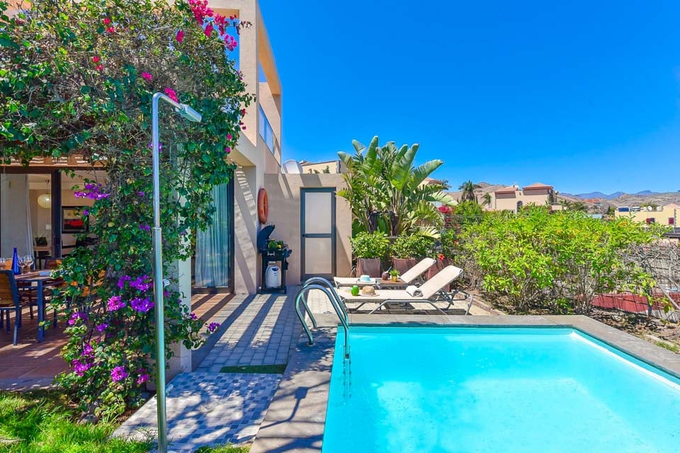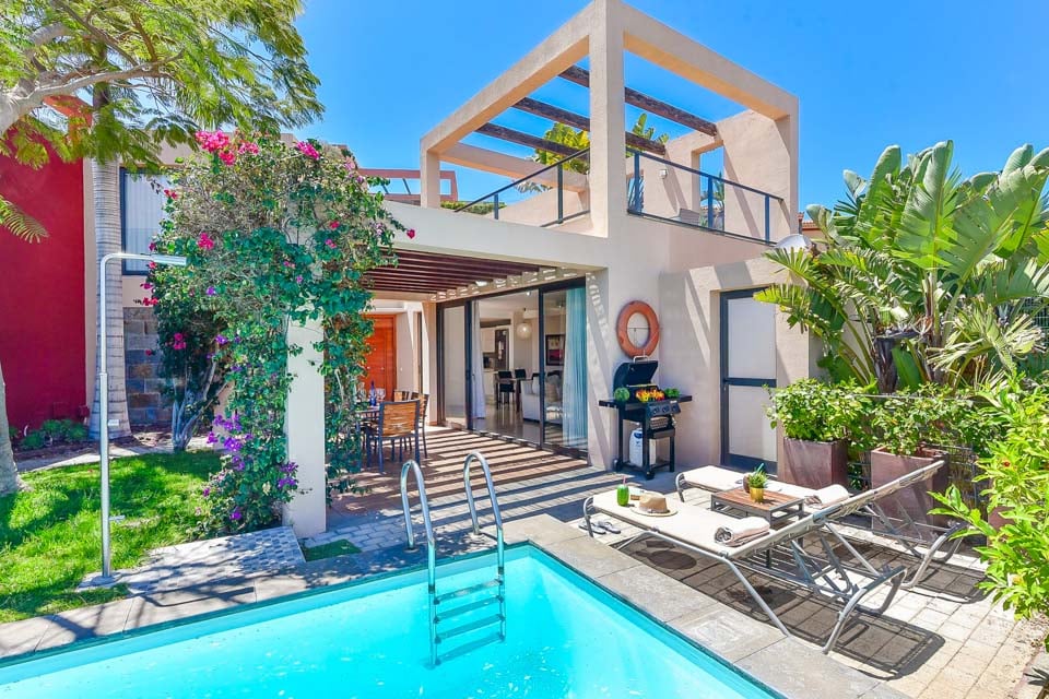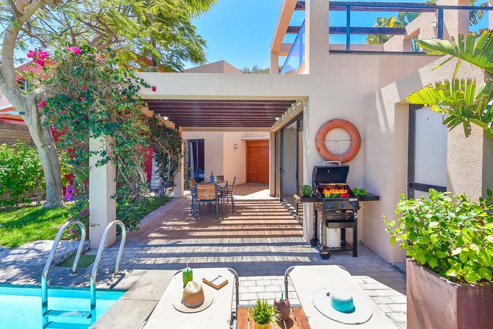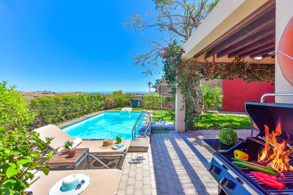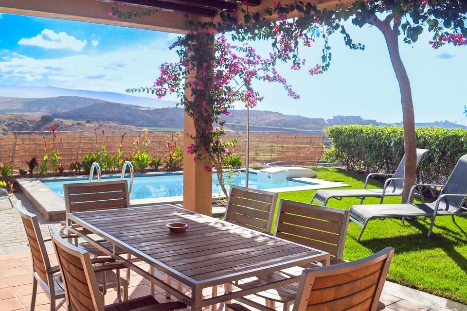 Alternativt kan terrassen vara där du tillbringar större delen av din tid, där du njuter av den karga utsikten över den städsegröna golfbanan, kopplar av med ett glas vin och njuter av upplevelsen av din egen privata pool. Uteserveringen ligger under en vacker pergola täckt av vinrankor, vilket ger dig en naturskön uteserveringsupplevelse.