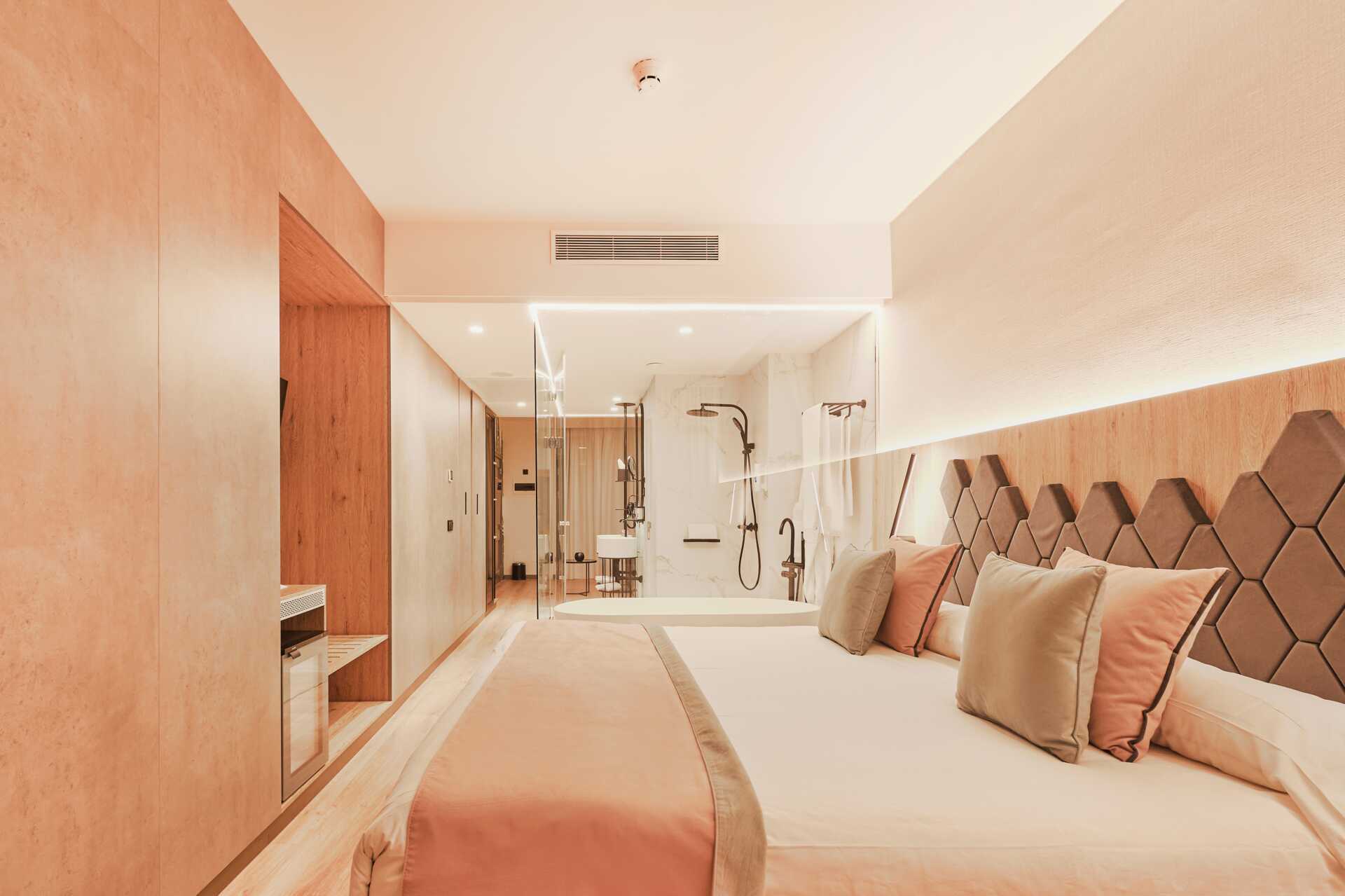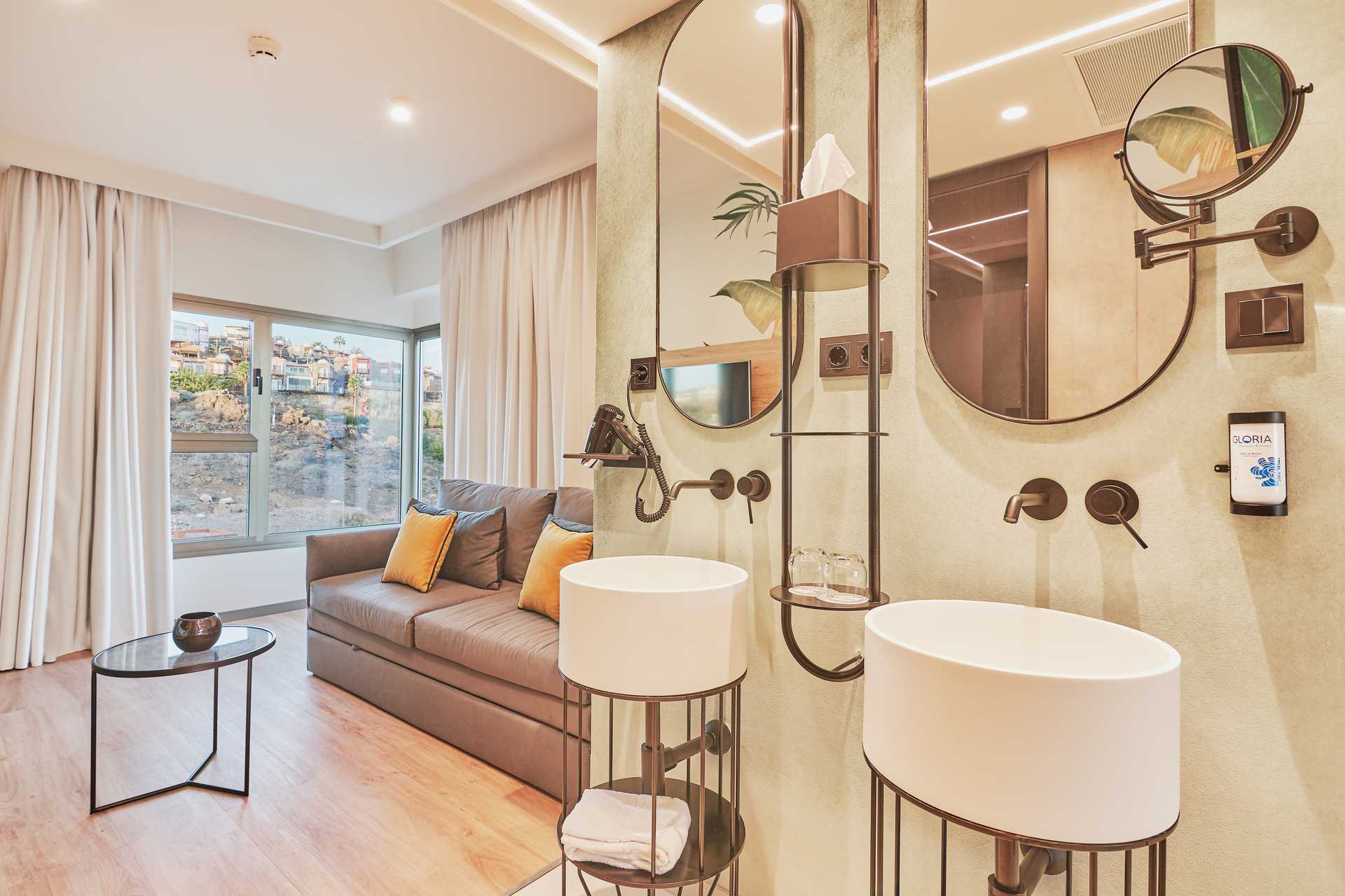 Juniorsvit med balkong och havsutsikt. Juniorsviterna består av sovrum och vardagsrum med öppen planlösning. En dubbelsäng. Möjlighet till extrabädd i bäddsoffa. Wifi och luftkonditionering ingår. Deponering mot avgift. Kylskåp. Tv med internationella kanaler. Hårtork. Badkaret står i sovrummet. Från sovrummet är det öppen planlösning till handfaten. Separat dusch med glasväggar. Separat wc. Städning 7 ggr/vecka.