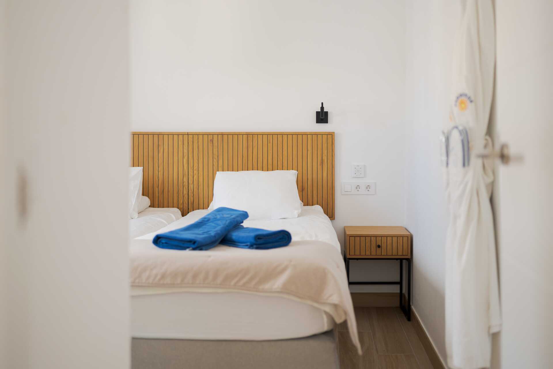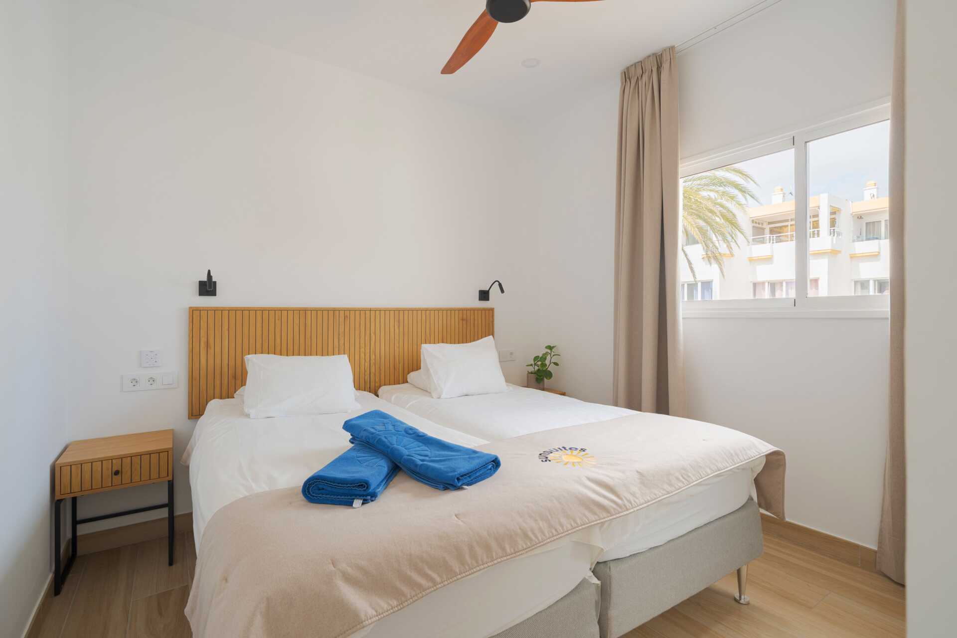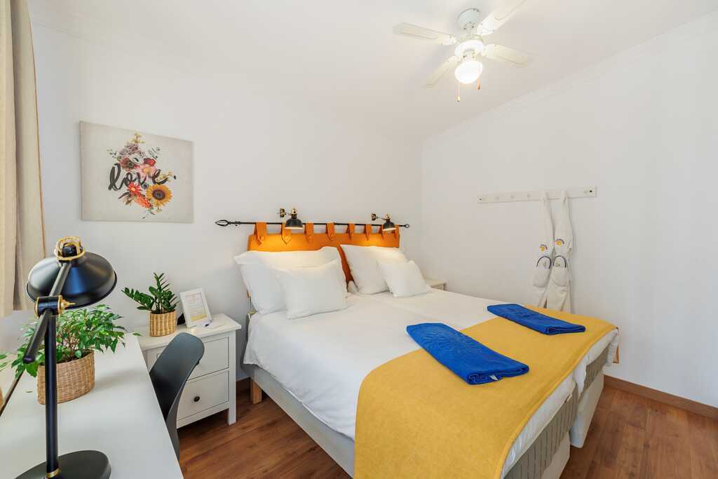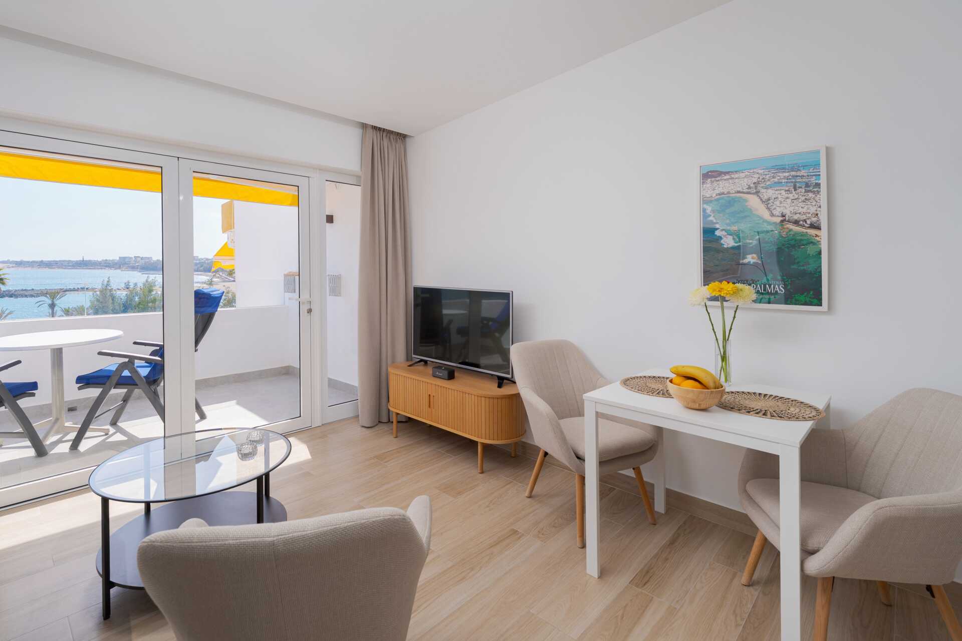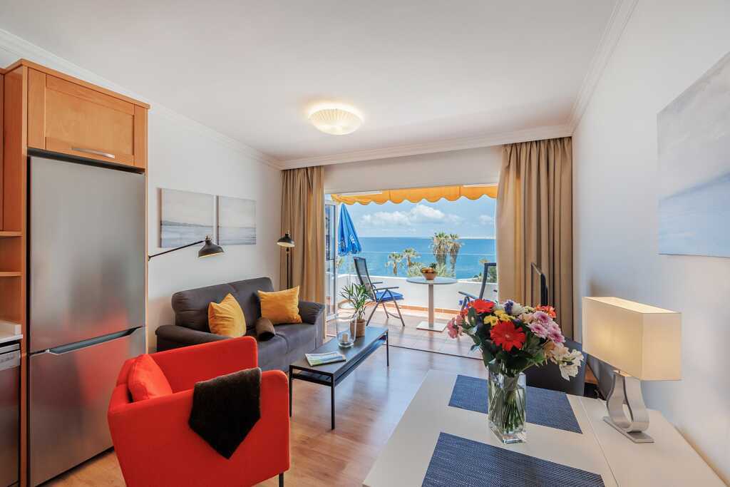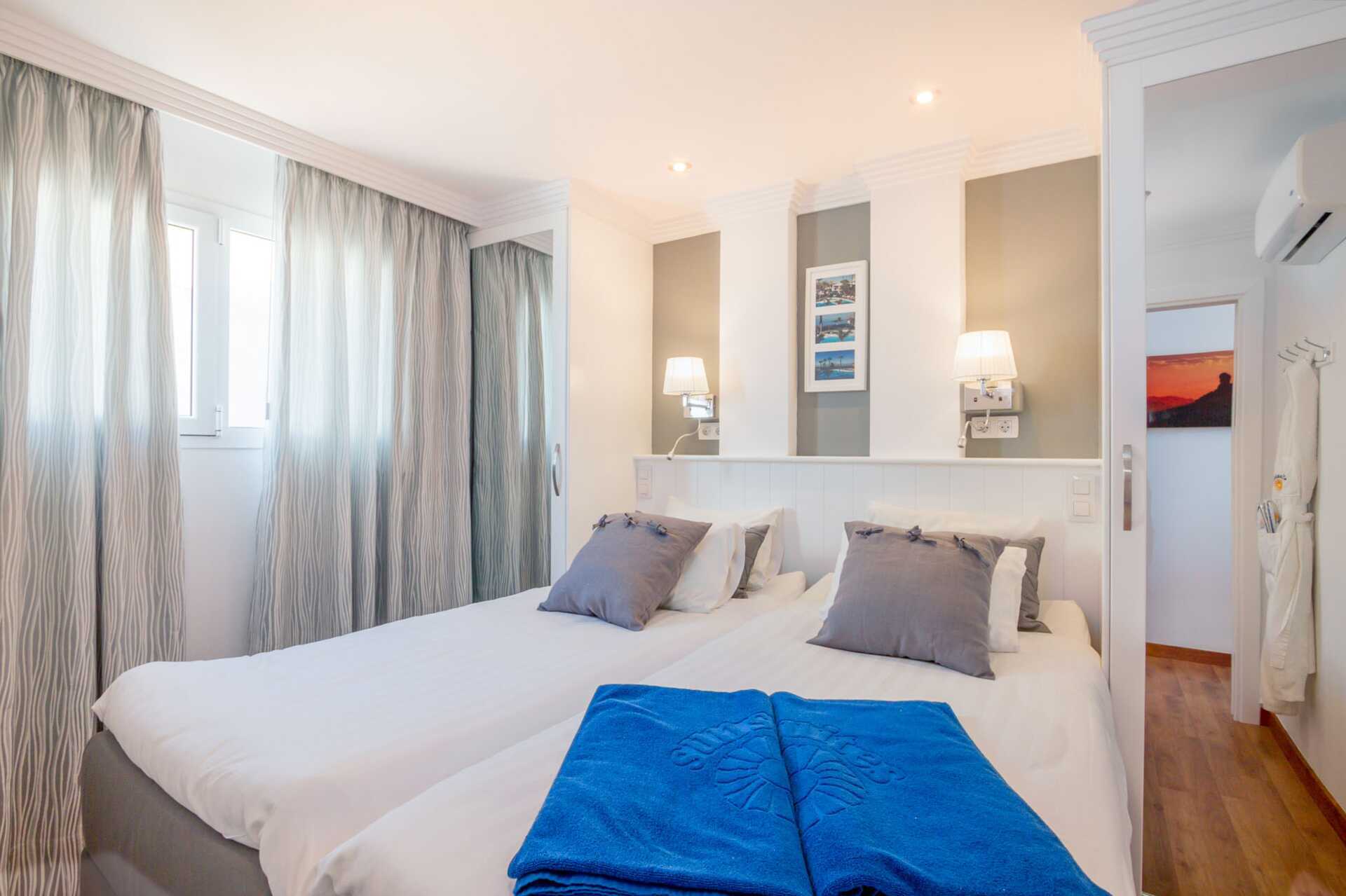 Tvårumslägenhet med balkong eller terrass - alla med unik utformning och inredning. Vikbar glasvägg mellan uteplatsen och vardagsrummen. Sovrum med två enkelsängar och ett kombinerat vardagsrum/minikök. Välutrustad kök med kokplattor, ugn, kylskåp med frys, diskmaskin, kaffebryggare, Nespressomaskin och vattenkokare samt rikigt bra köksutrustning. Wifi och luftkonditionering ingår. Takfläkt. Tv med internationella kanaler. Bluetooth-högtalare. Tvättmaskin. Poolhanddukar, badrockar och tofflor. Hårtork. Badrum med dusch och wc. Städning 2 ggr/vecka. I vissa av lägenheterna finns några trappsteg.