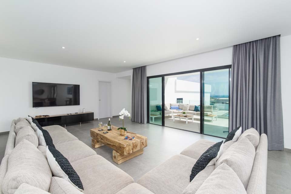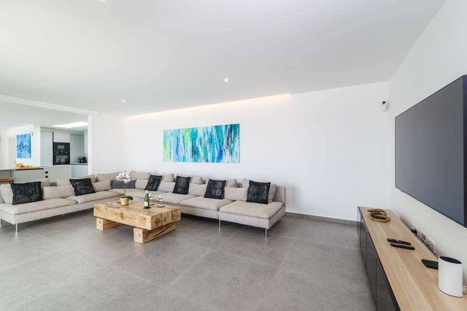 Bekväm sittgrupp, Smart-TV, Öppen planlösning, Dörrar till terrass