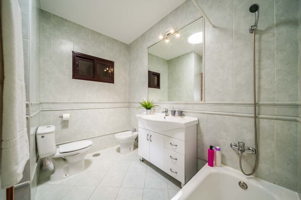 Badkar med dusch, toalett, bidé, handfat
