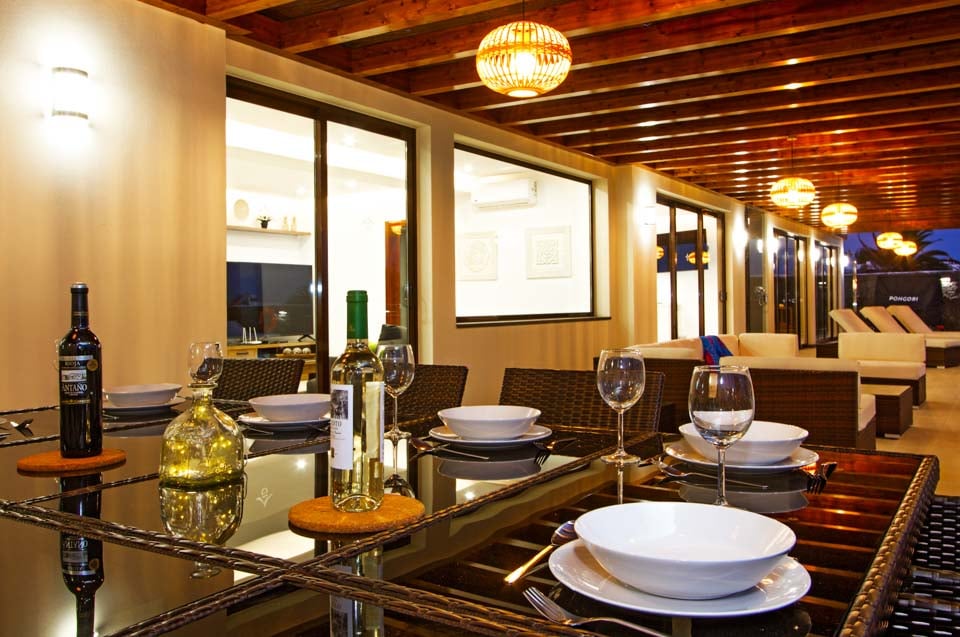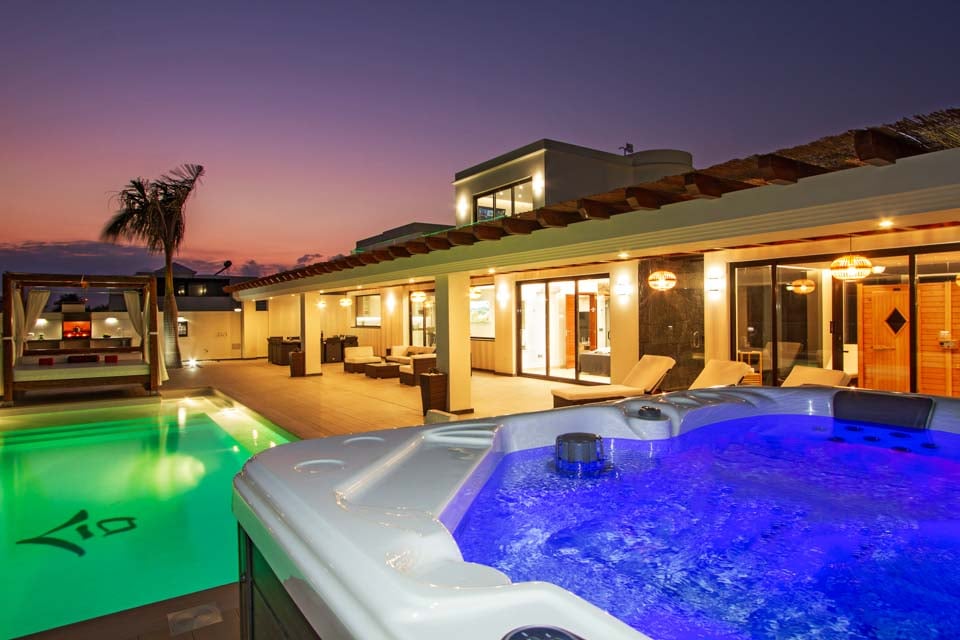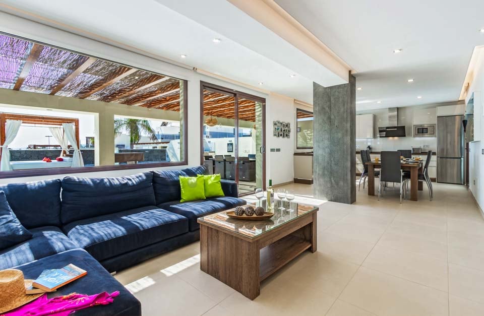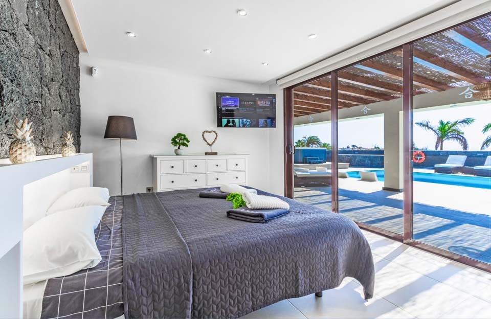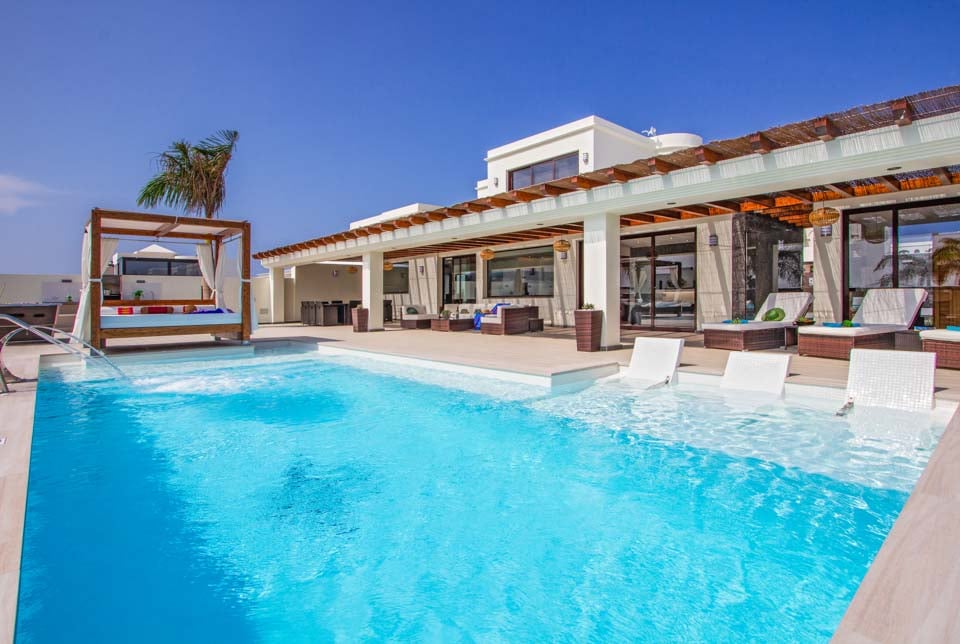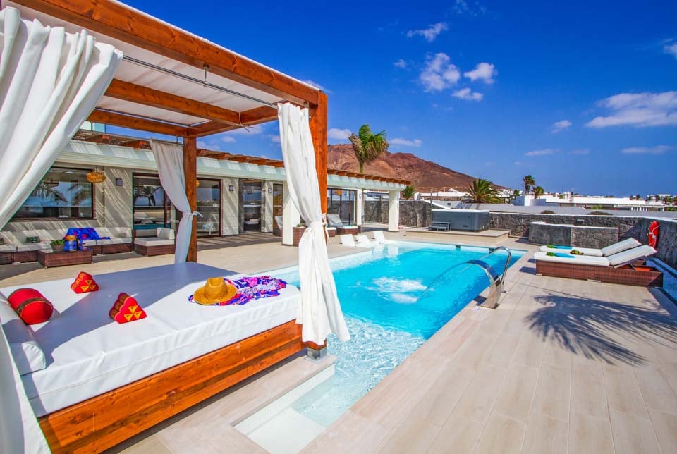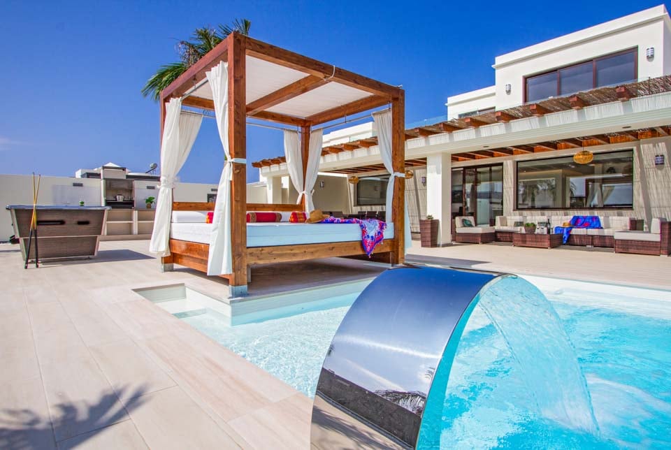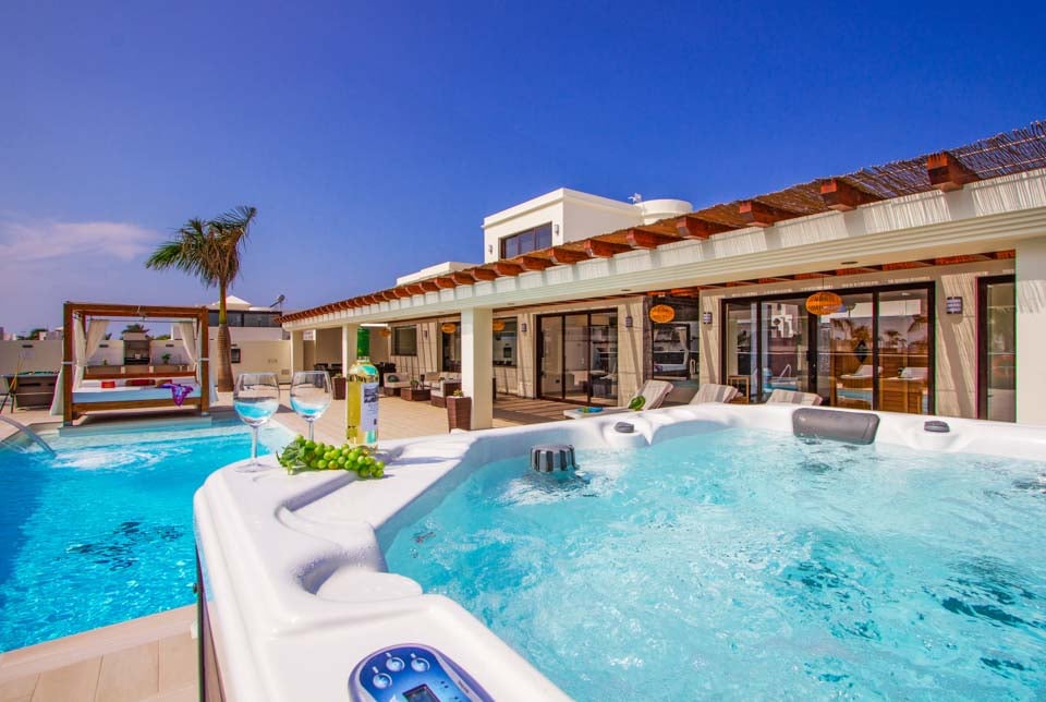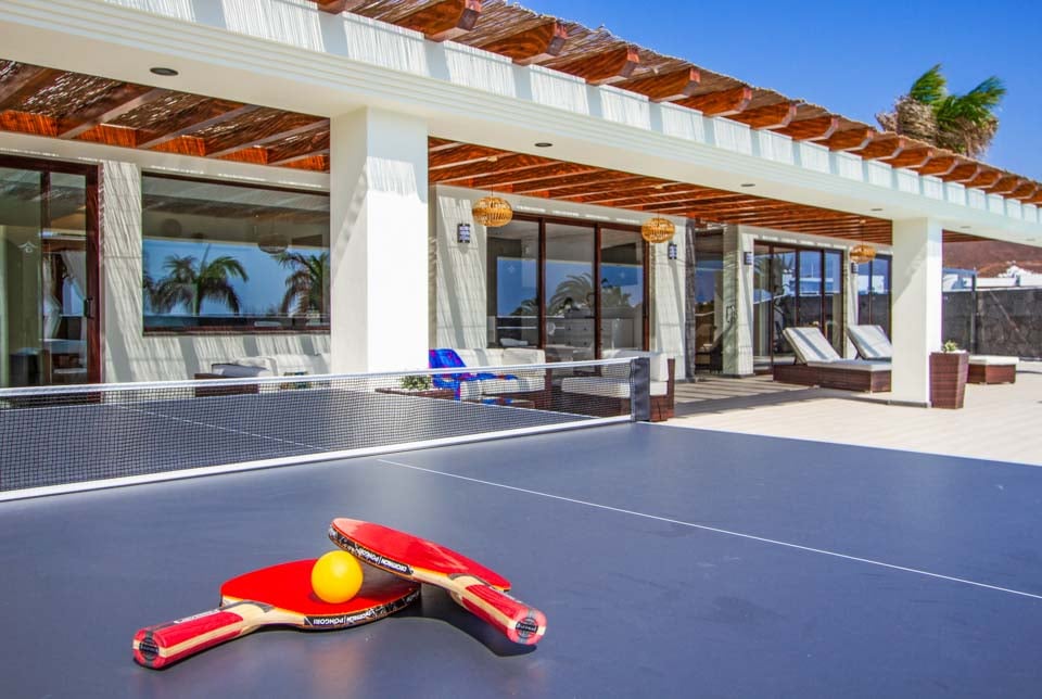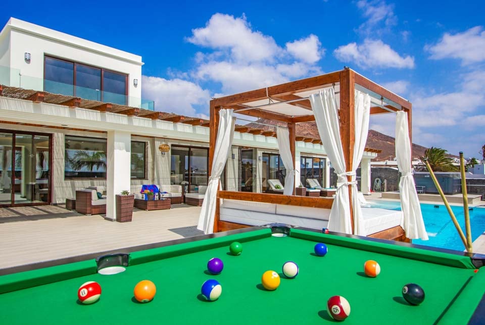 Utsidan av villan domineras av en privat pool som är omgiven av en elegant kaklad terrass med gott om plats att koppla av på en av solstolarna, eller kanske den lyxiga dagbädden. Det finns till och med en bubbelpool, biljardbord och bordtennis för dem som vill få ut det mesta av sin semester. Om du är angelägen om att hålla dig i form och skämma bort dig själv, kommer du att bli glad att veta att det finns gymutrustning och bastu till hands för den perfekta villa-semesterupplevelsen på Lanzarote.