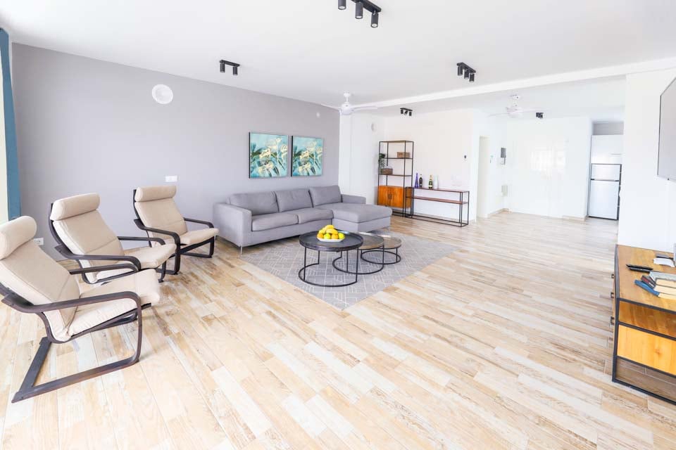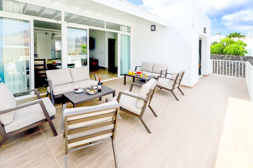 Insidan är villan uppdelad i två våningar. Terrassdörrar leder från terrassen till bottenvåningen där vi hittar två sovrum med eget badrum, ett med dubbelsäng och ett med två enkelsängar. Det finns också en loungedel och ett litet pentry. Med egna bostadsutrymmen är denna fastighet idealisk för de som reser tillsammans och vill ha lite extra utrymme. Interna och externa trappor leder upp till bottenvåningen, där vi hittar de återstående två sovrummen, ytterligare ett dubbelrum och ett tvåbäddsrum med tillgång till ett separat duschrum. Det finns ytterligare ett vardagsrum och ett fullt utrustat kök på denna våning, samt matmöjligheter inomhus. Som en extra bonus har denna villa även en övre terrass som leder från bottenvåningen och har utsikt över poolområdet.