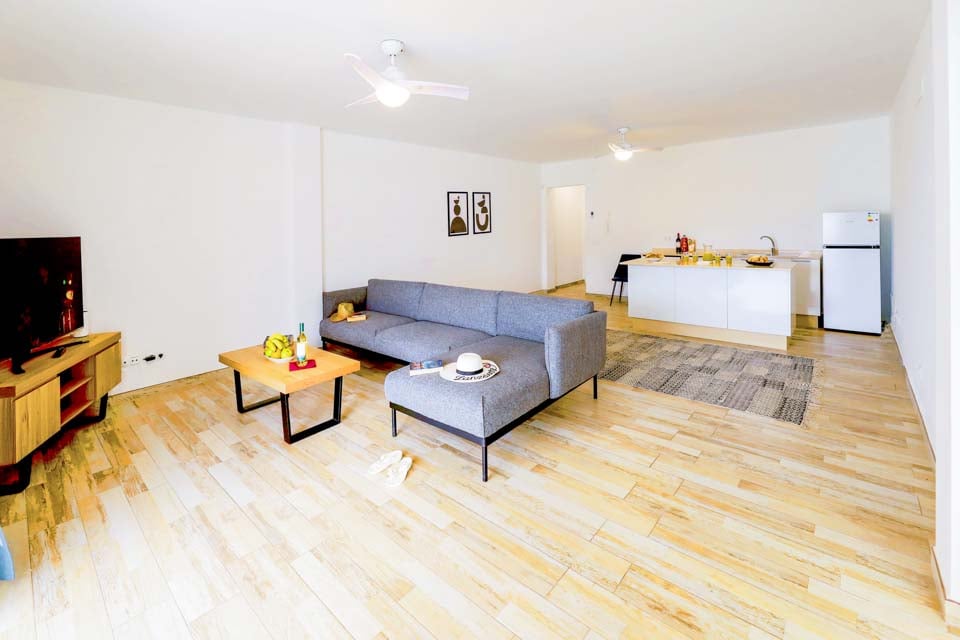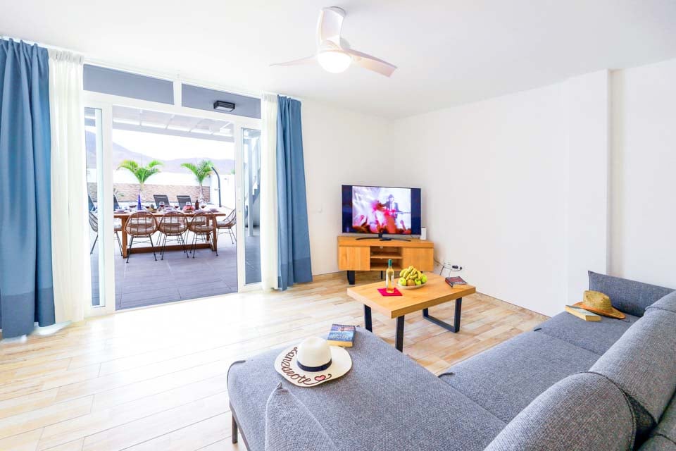 Bekväm sittgrupp, Platt-TV, Öppen planlösning, Uteplats, Terrassdörrar