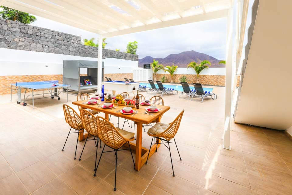 Täckt terrass, Matsal utomhus, Matmöjligheter utomhus, Matplats, Grill, Bärbar grill, Dagbädd utomhus, Solstolar, Biljardbord, Bordtennis