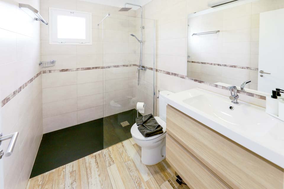 För att komma till villan finns en 90 cm bred stig tillsammans med 3 trappsteg. Ytterdörren har en bredd på 80 cm, medan dörren till terrassen är 159 cm bred. Nedre våningen nås via en ramp från uppfarten. Bottenvåningen nås endast via trappor. Terrassen är rymlig och kaklad. Poolen ligger på nedre våningen, medan en utvändig trappa med 16 trappsteg leder från bottenvåningen till poolkanten. Dubbelrummen och tvåbäddsrummen på bottenvåningen har en dörrbredd på 79 cm, medan duschrumsdörren är 70 cm bred. Det finns 18 interna trappsteg till bottenvåningen där dörrarna till sovrummet med två enkelsängar och duschrummet är 70 cm breda. Dörren in till kök/matplats är 150 cm bred och dörren in till vardagsrummet är också 150 cm bred. *Observera att även om vi har gjort allt för att säkerställa att informationen som lämnas är korrekt, kan fel uppstå och om du behöver mer specifik information om villan, tveka inte att kontakta oss.