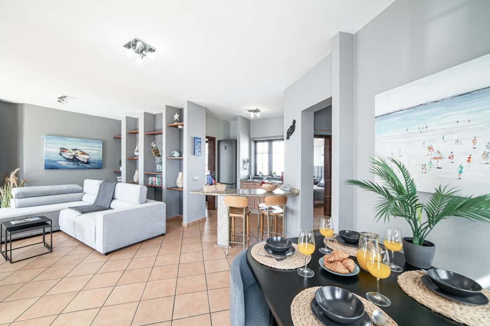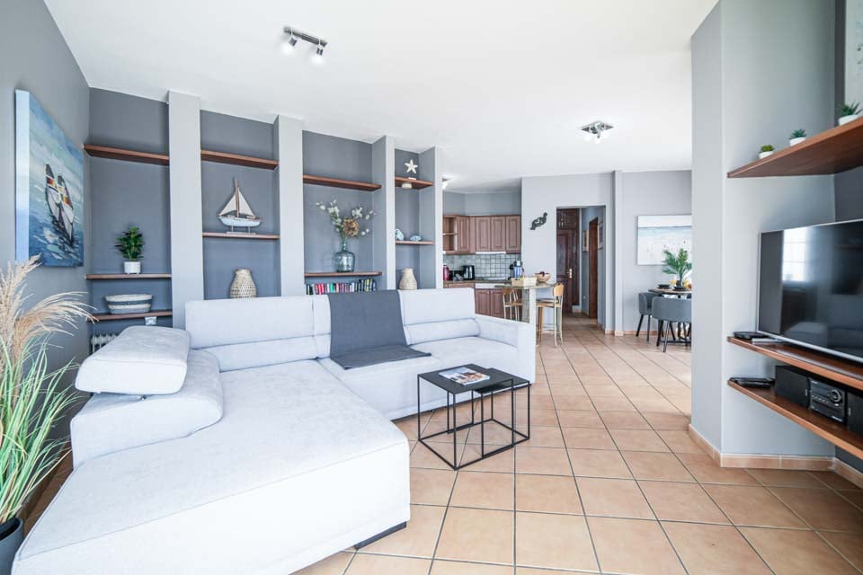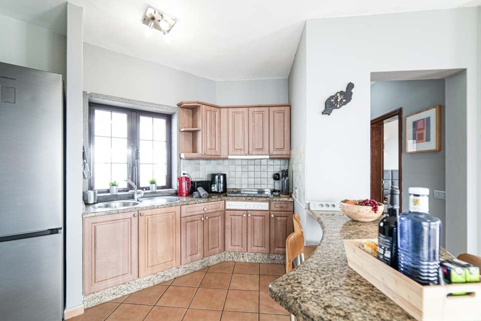 Bekväm sittgrupp, Smart-TV, Ugn, Spishäll, Mikrovågsugn, Frys, Kylskåp, Kyl- och frysskåp, Diskmaskin, Tvättmaskin, Matplats, Dörrar till terrass