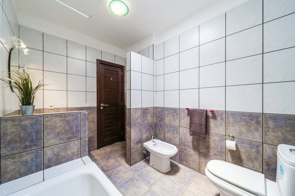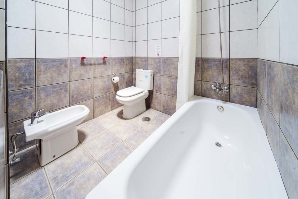 Badkar med dusch, toalett, bidé, handfat