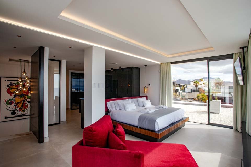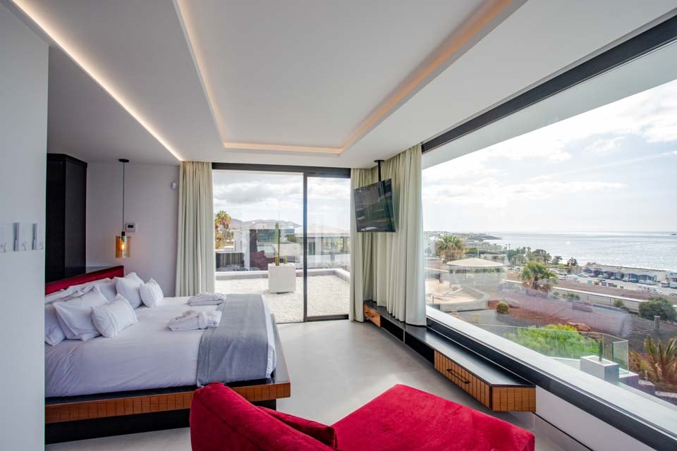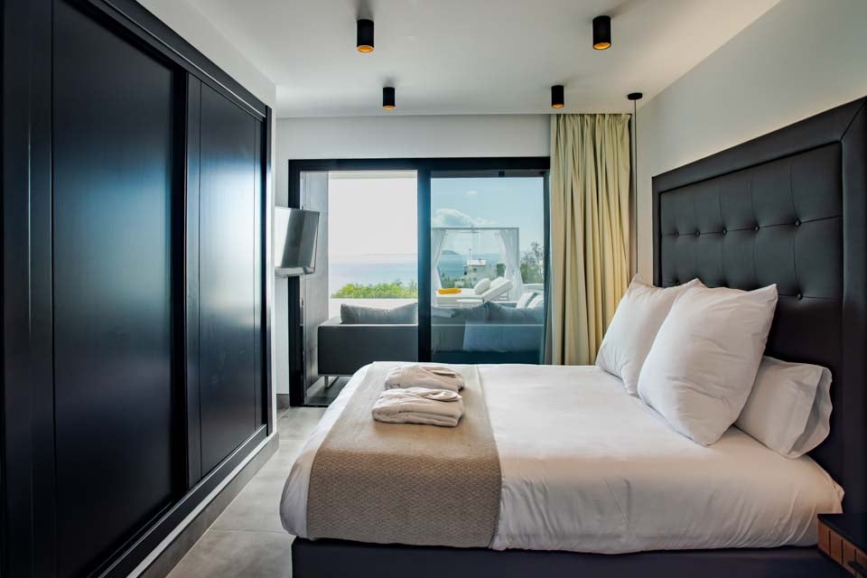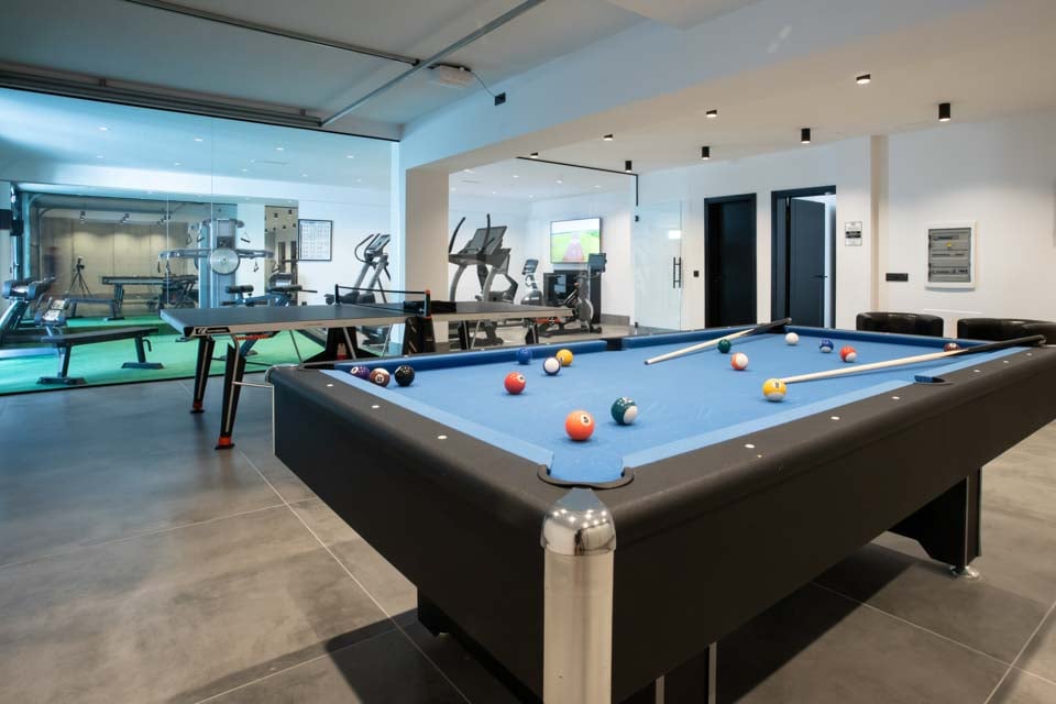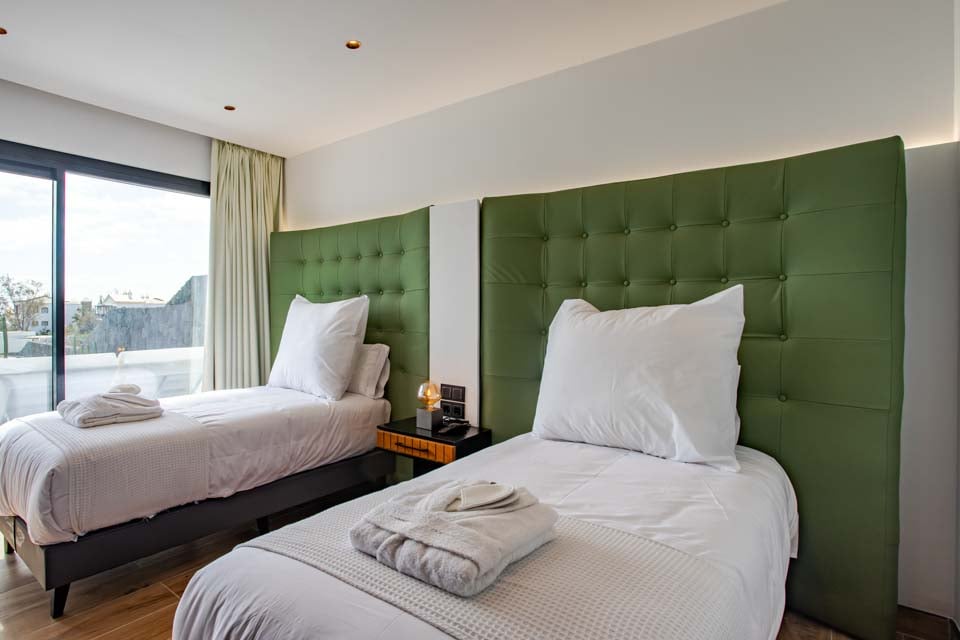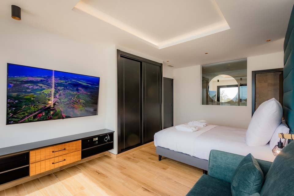 Även när man är inomhus är det omöjligt att ignorera den otroliga utsikten som erbjuds; med interiören inramad av fönster från golv till tak och dörrar som vetter mot landskapet. Med en modern melodi nynnar de eleganta och vitkalkade fasaderna med linjär, rak arkitektur och eleganta balkonger. Vardagsrummet hör hemma i en inredningstidning; det är ytterst sofistikerat med ett modernt färgschema, minimalistisk inredning och möbler i skandinavisk stil. De två loungeområdena är byggda med öppen planlösning och är en frisk fläkt, med trendiga soffor och fåtöljer perfekt placerade vid kustutsikten. Samlas för den ultimata filmkvällsupplevelsen i biorummet, fyllt med läderfåtöljer och dekorerat med filmaffischer – glöm bara inte popcornen. De två ultramoderna köken lockas direkt av de glansiga bänkskivorna och eleganta skåp möter exklusiva vitvaror och eleganta frukostbarer. Släpp loss lite i inomhusgymmet med viktmaskiner och löpband, eller välj en mer avkopplande metod i inomhusbastun. Varje sovrum är ljust och luftigt och inramas av det inspirerande landskapet, och rymmer upp till arton vuxna och barn totalt. Sovrum 5 har en hall som leder från det med ytterligare ett rum med två enkelsängar. Observera att det inte finns någon dörr som delar av dessa rum. Det finns också en intern hiss som ger tillgång till alla våningar. Som en bonus ingår badrockar och tofflor i denna villa utan extra kostnad under hela din vistelse.