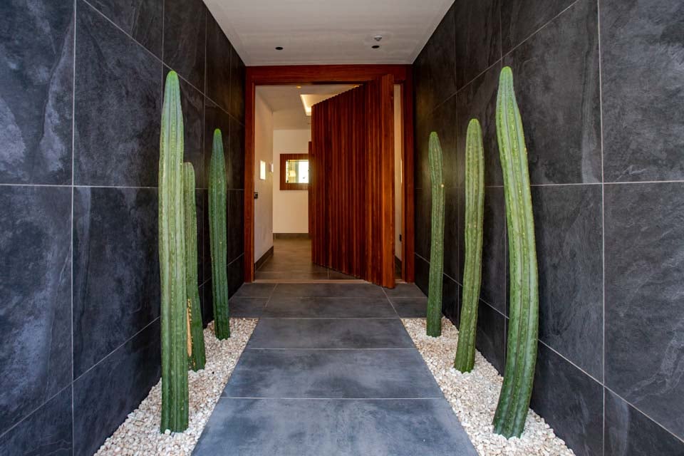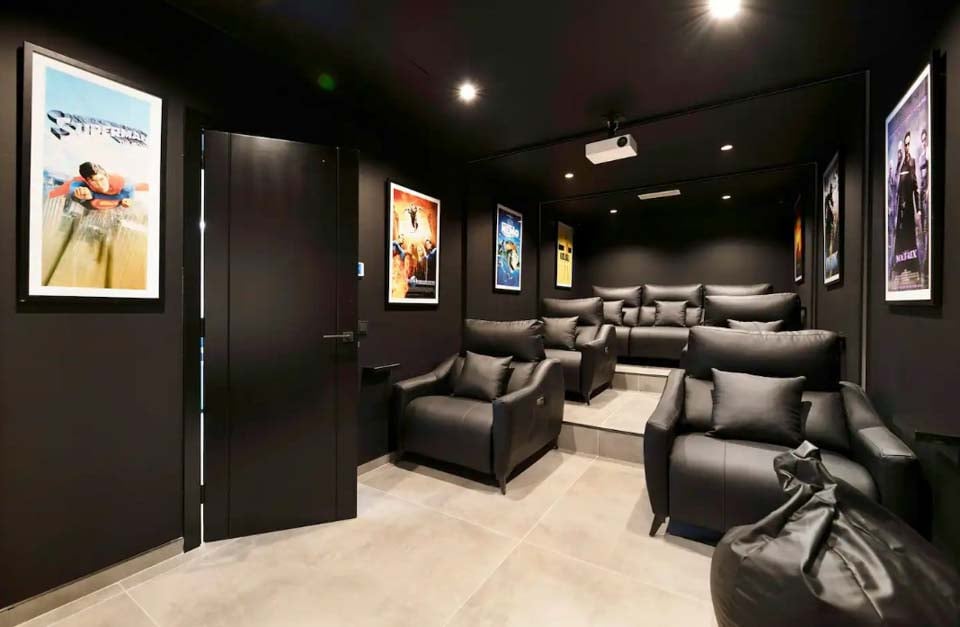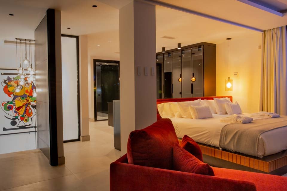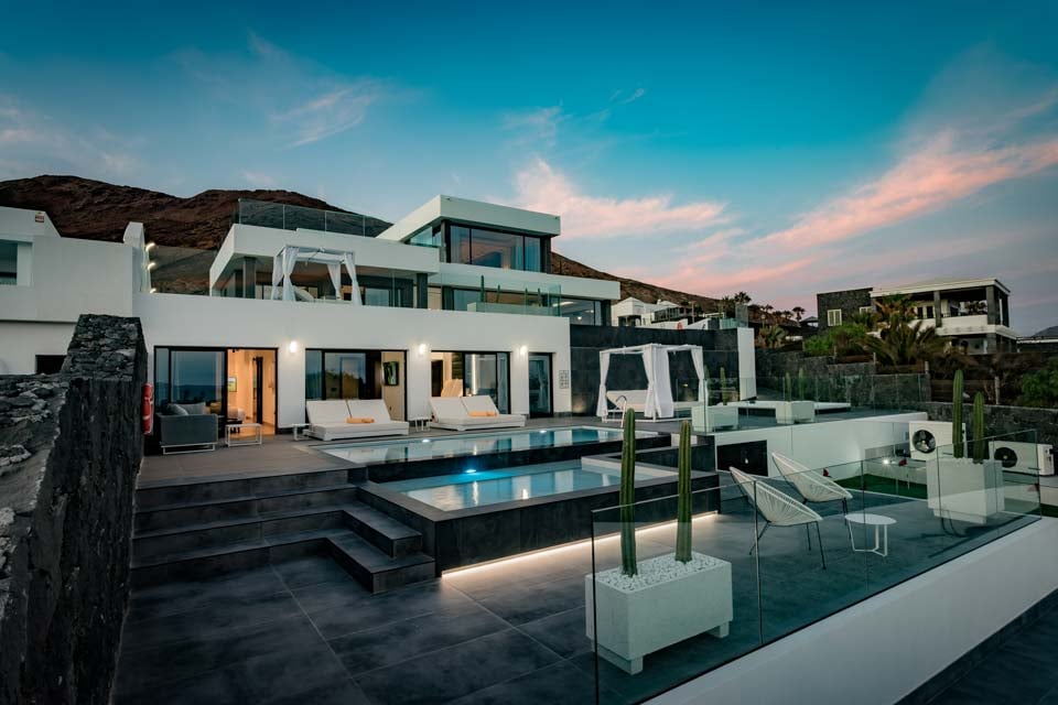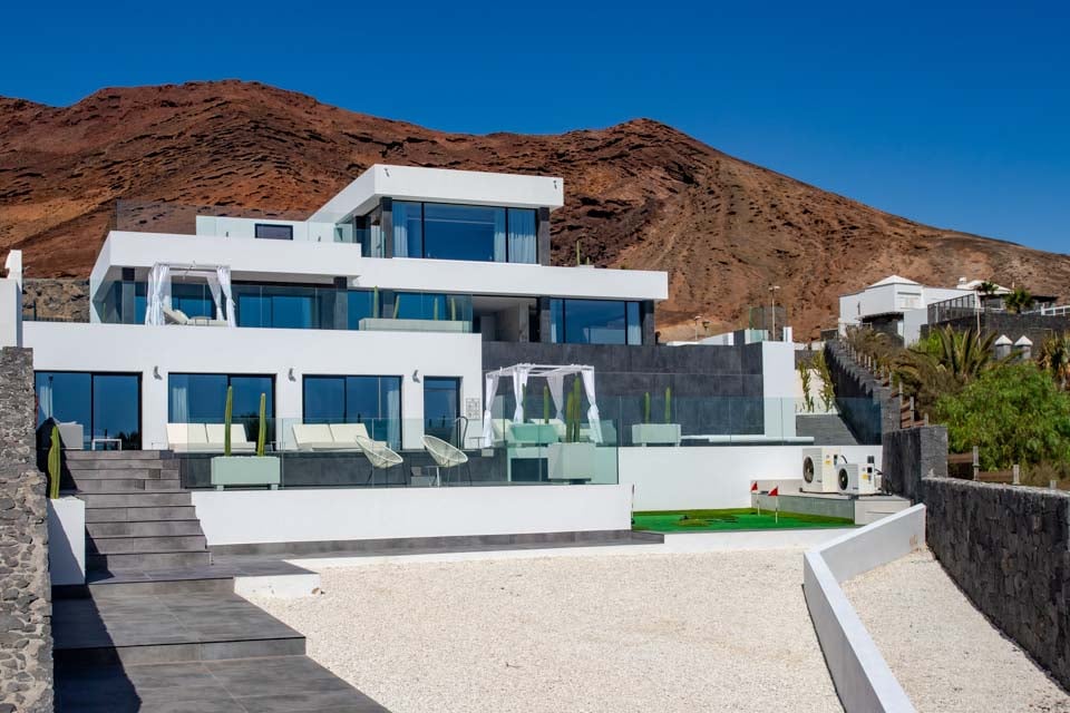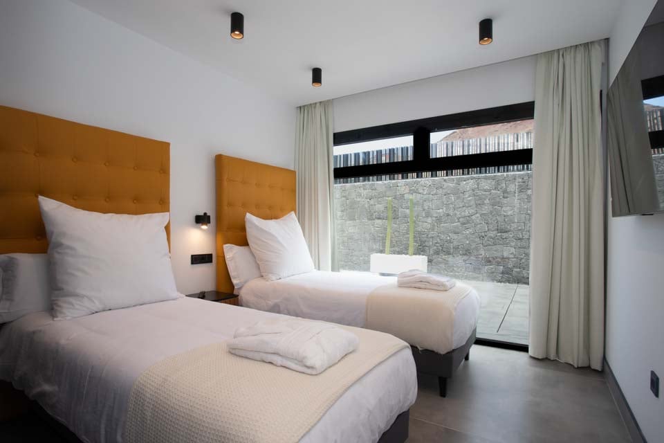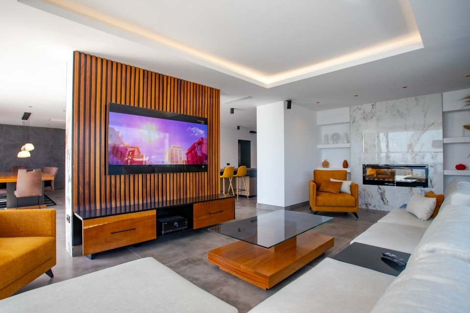 Även när man är inomhus är det omöjligt att ignorera den otroliga utsikten som erbjuds; med interiören inramad av fönster från golv till tak och dörrar som vetter mot landskapet. Med en modern melodi nynnar de eleganta och vitkalkade fasaderna med linjär, rak arkitektur och eleganta balkonger. Vardagsrummet hör hemma i en inredningstidning; det är ytterst sofistikerat med ett modernt färgschema, minimalistisk inredning och möbler i skandinavisk stil. De två loungeområdena är byggda med öppen planlösning och är en frisk fläkt, med trendiga soffor och fåtöljer perfekt placerade vid kustutsikten. Samlas för den ultimata filmkvällsupplevelsen i biorummet, fyllt med läderfåtöljer och dekorerat med filmaffischer – glöm bara inte popcornen. De två ultramoderna köken lockas direkt av de glansiga bänkskivorna och eleganta skåp möter exklusiva vitvaror och eleganta frukostbarer. Släpp loss lite i inomhusgymmet med viktmaskiner och löpband, eller välj en mer avkopplande metod i inomhusbastun. Varje sovrum är ljust och luftigt och inramas av det inspirerande landskapet, och rymmer upp till arton vuxna och barn totalt. Sovrum 5 har en hall som leder från det med ytterligare ett rum med två enkelsängar. Observera att det inte finns någon dörr som delar av dessa rum. Det finns också en intern hiss som ger tillgång till alla våningar. Som en bonus ingår badrockar och tofflor i denna villa utan extra kostnad under hela din vistelse.