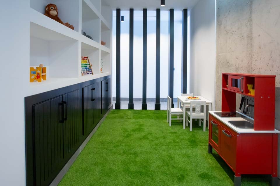 Bekväm sittgrupp, Platt-TV, Öppen planlösning, Spelkonsol, Lekplats