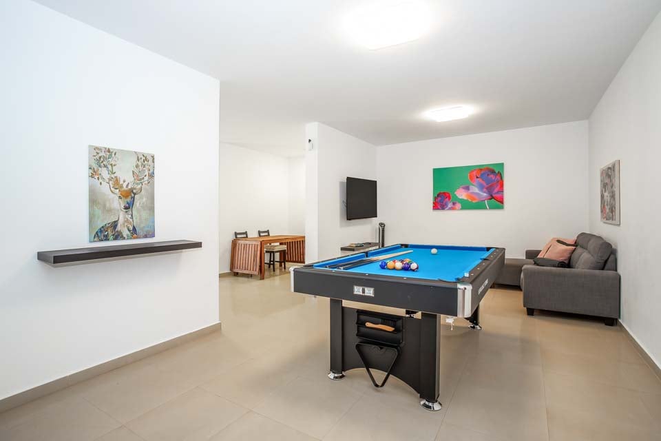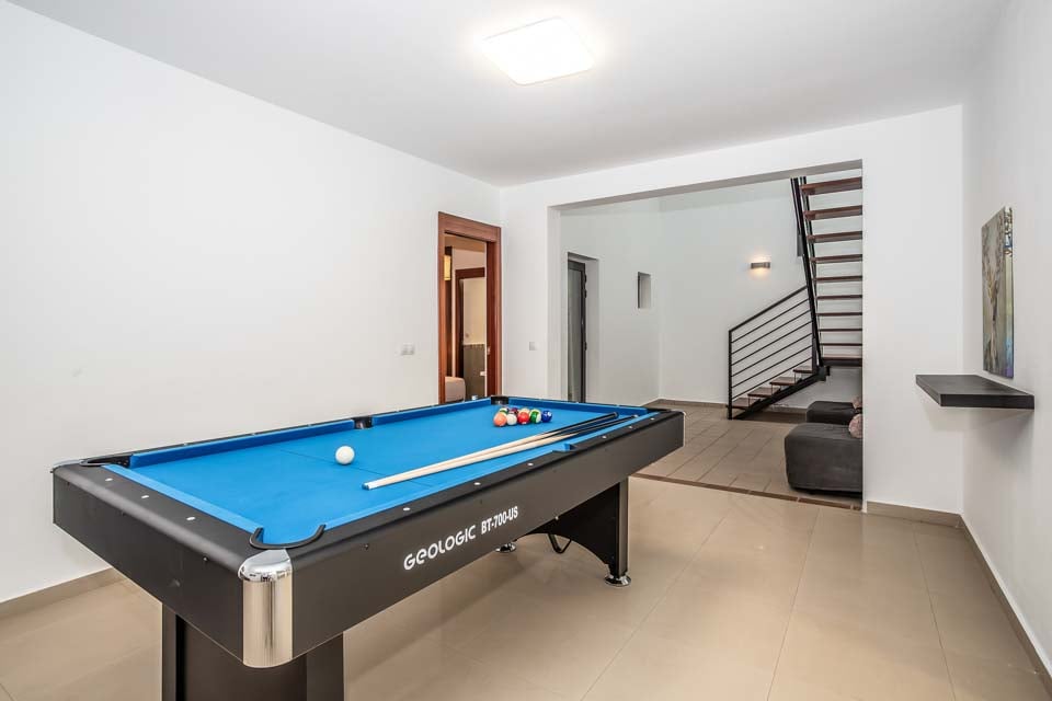 Biljardbord, Bordtennis, Smart-TV, Soffa, Dörrar till terrass