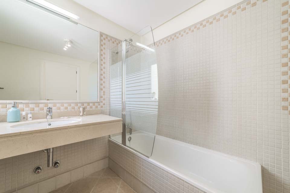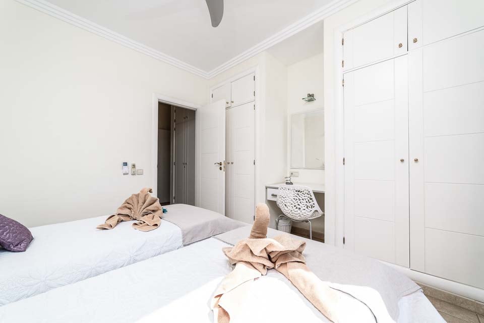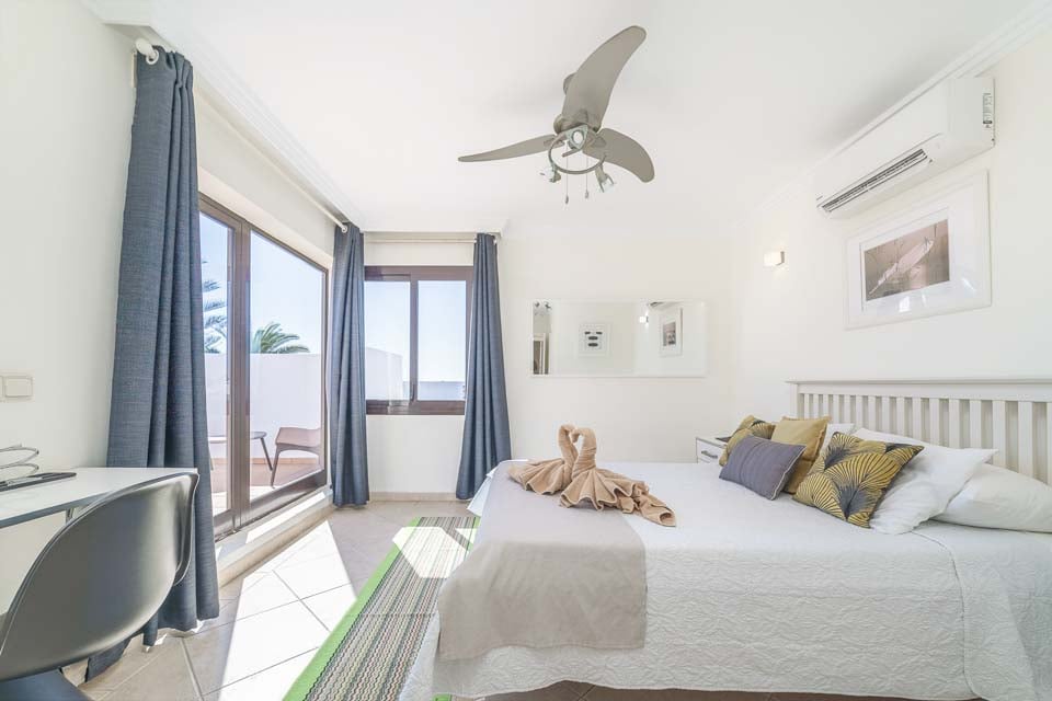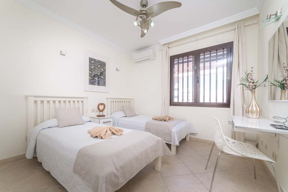 Inuti hittar du ett bekvämt L-format vardagsrum och kök med mysiga soffor, ett fullt utrustat kök och ett fotbollsbord för spel inomhus. Det finns totalt fem sovrum, alla med myntdriven luftkonditionering, mjuka sängkläder och gratis poolhanddukar. Se till att boka sovrum fyra före alla andra, då du hittar ett rymligt sovrum med eget badrum och en balkongterrass med en avkopplande bubbelpool för den där speciella stunden.
