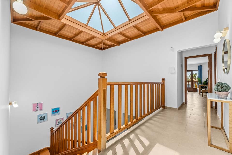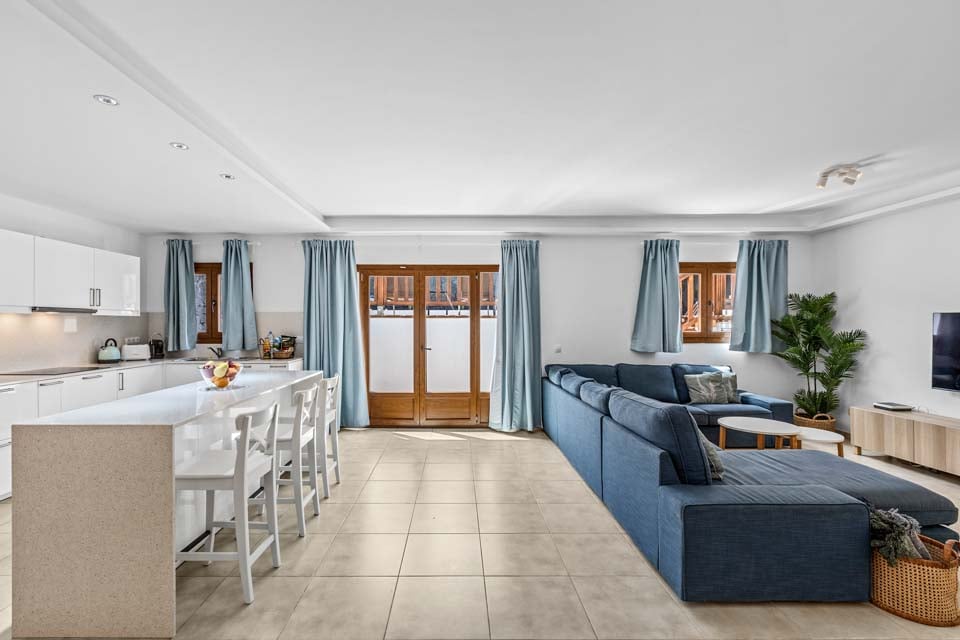 Du kommer in i villan på bottenvåningen via en liten utvändig trappa. Fördelad på två våningar går du ner till bottenvåningen, där du hittar ett enormt öppet kök och vardagsrum. Detta stora utrymme är perfekt för underhållning! Det nyrenoverade köket har alla de senaste apparaterna, samt en frukostbar för ditt morgonkaffe, en smart-TV och sval luftkonditionering. För de som vill hålla sig i form under semestern finns det ett gym i anslutning till köket.
