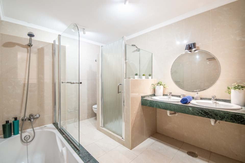 Badkar med dusch, Dusch, Toalett, Bidé, Handfat, Dubbel, Dubbla handfat