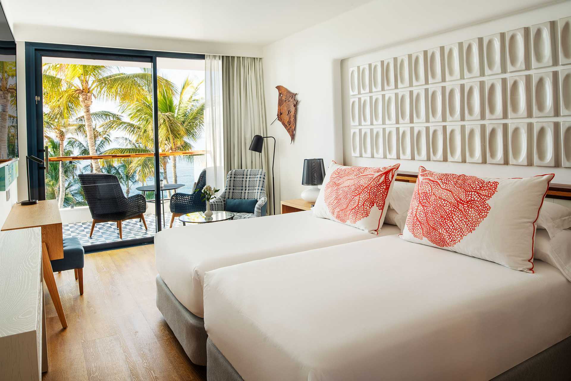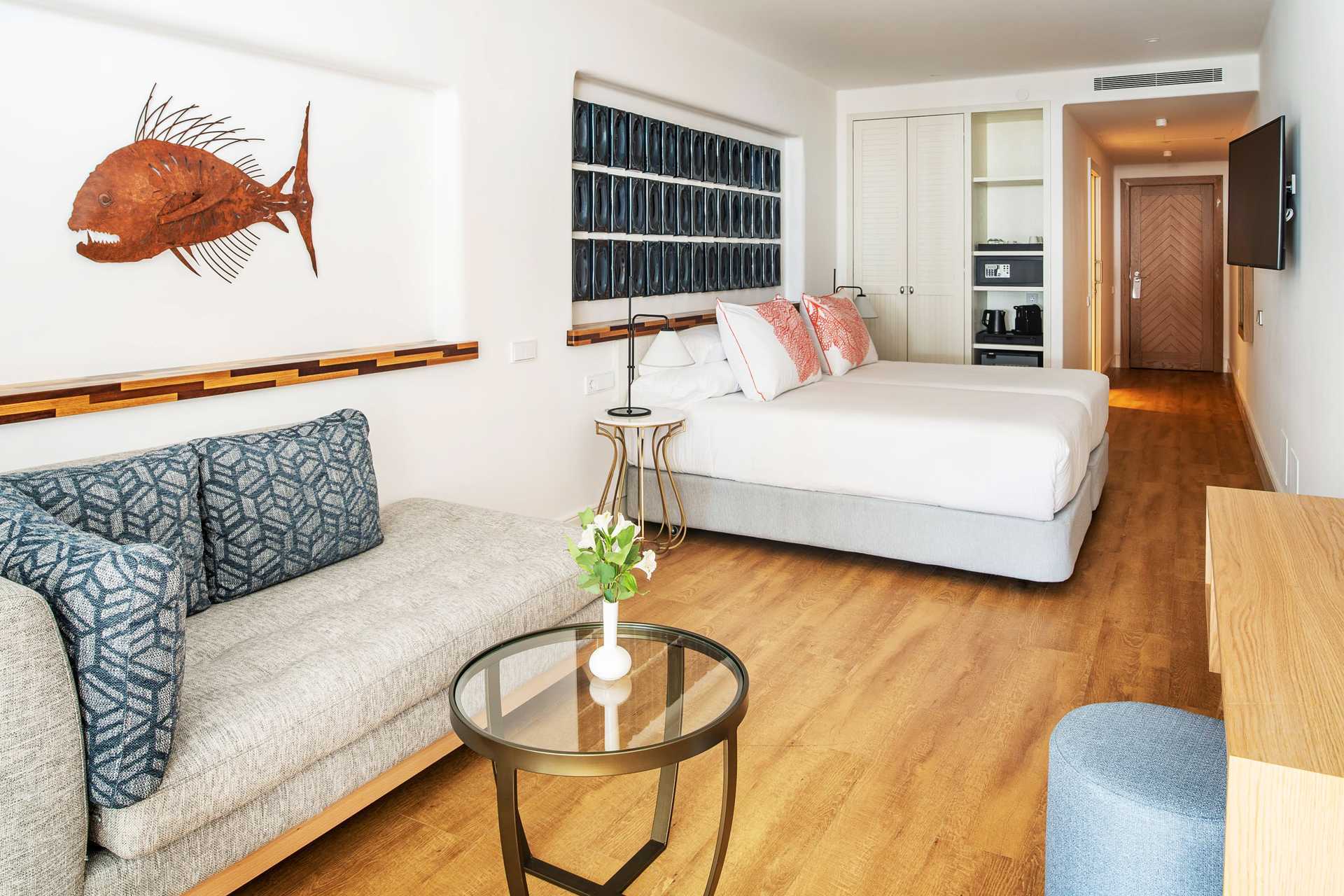 Juniorsvit med med balkong och havsutsikt. Två enkelsängar. Kuddmeny. Wifi, luftkonditionering och deponering ingår. Kylskåp. Vattenkokare samt kaffe och te. Tv med internationella kanaler. Badrockar och tofflor. Hårtork. Badrum med dusch och wc. Städning 7 ggr/vecka.
