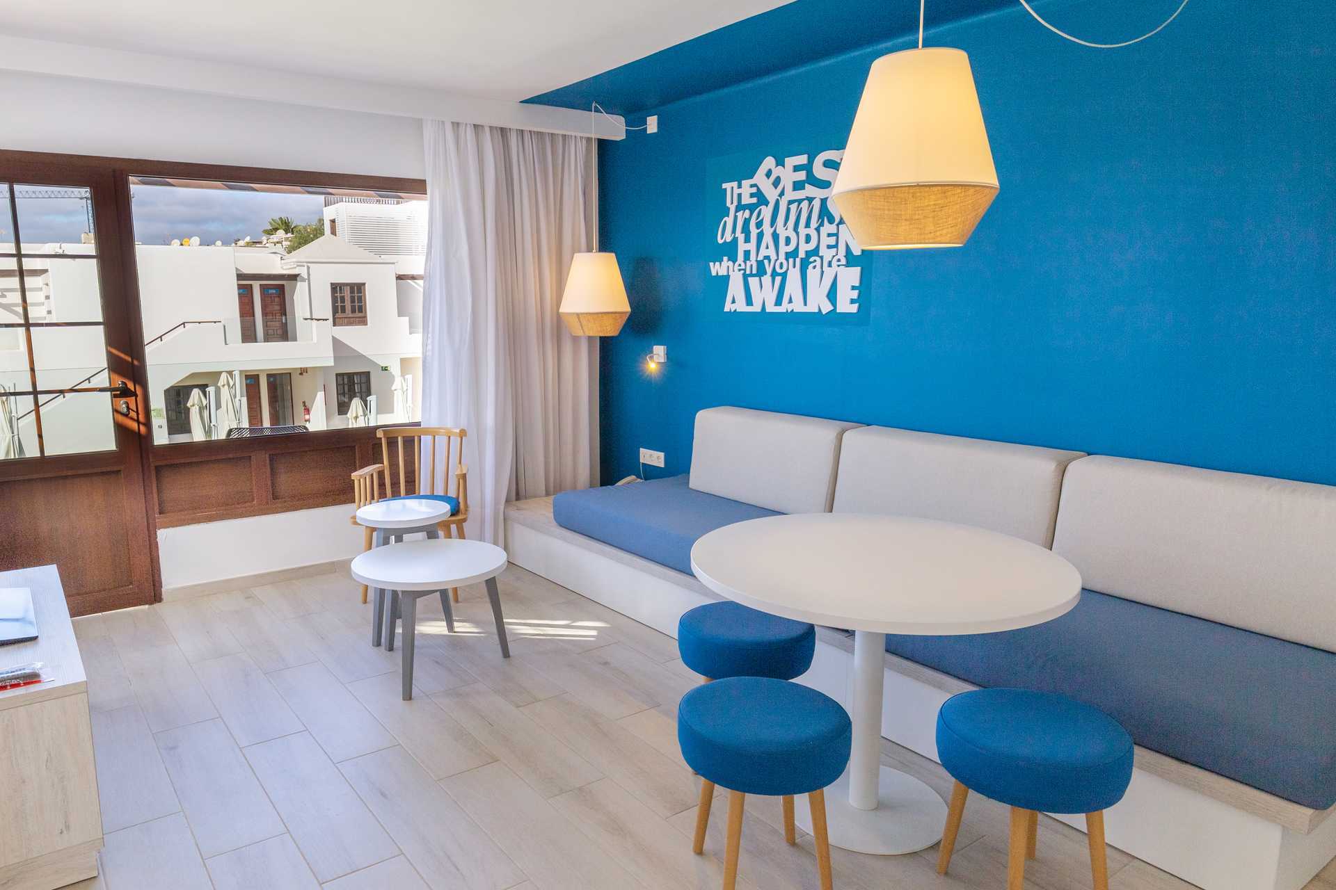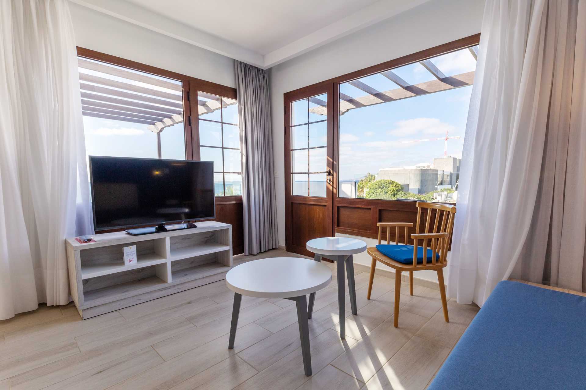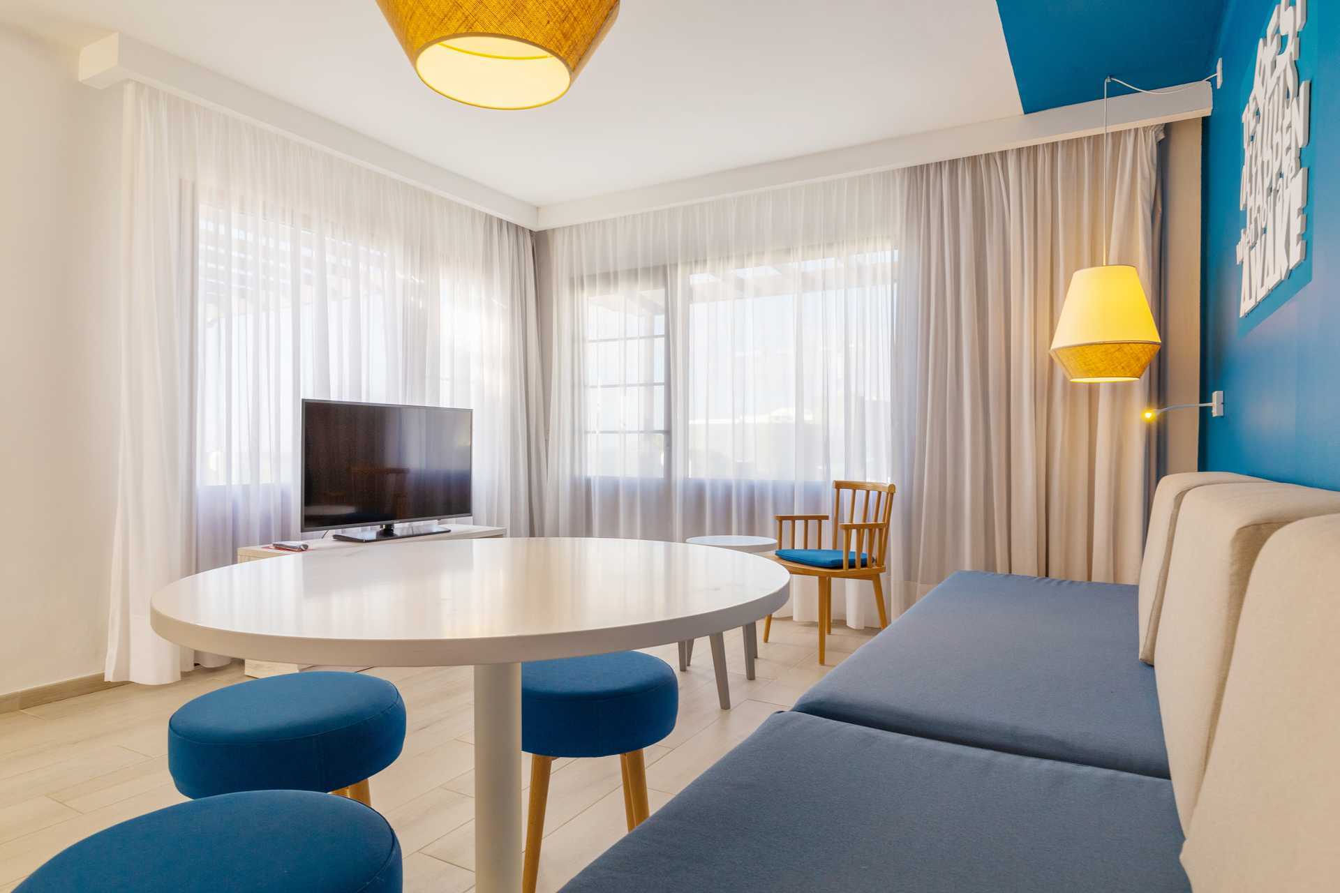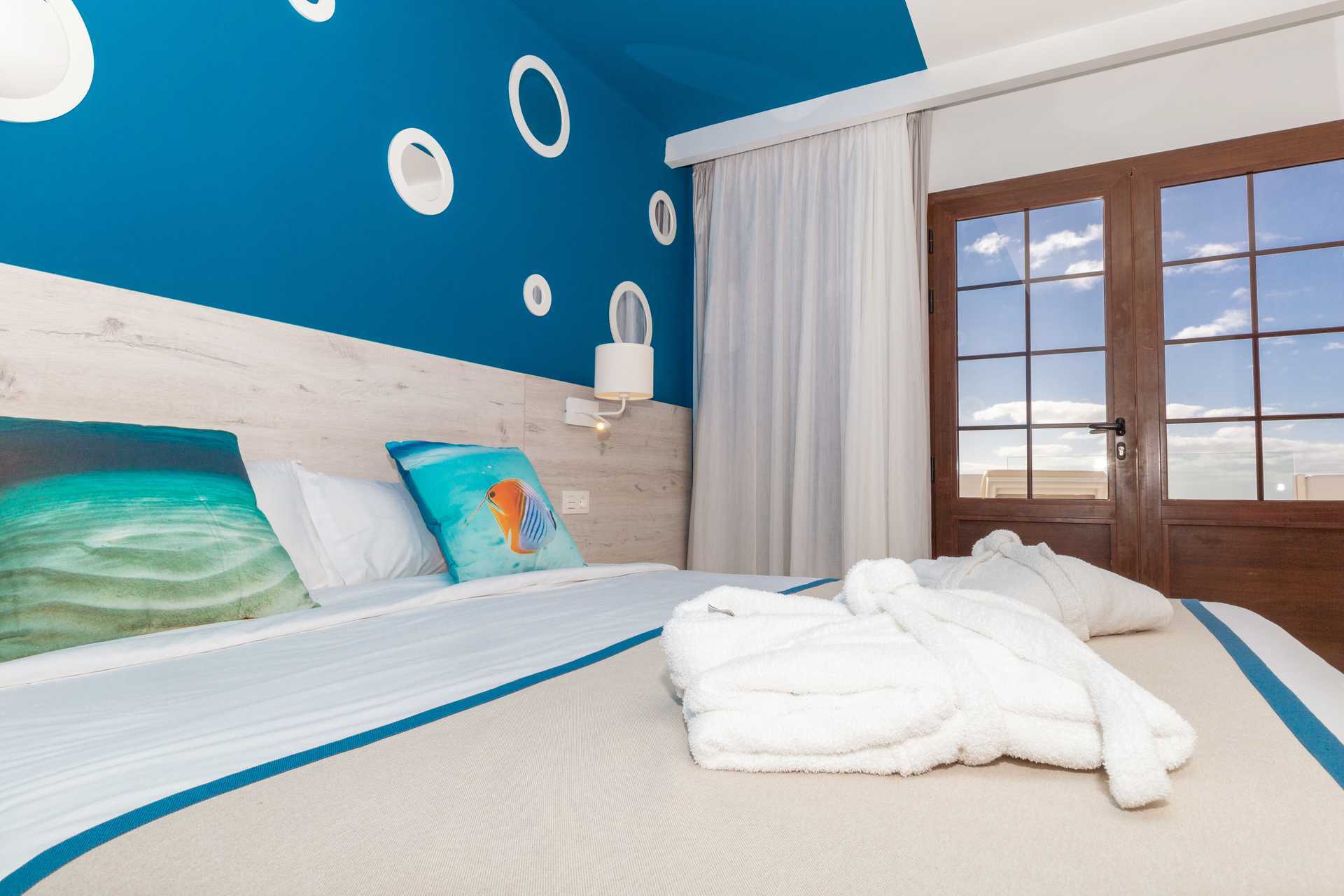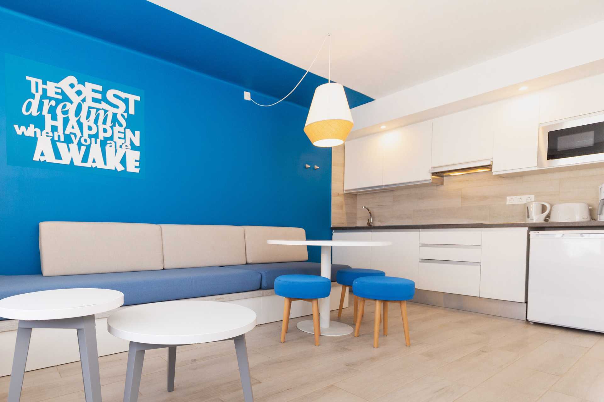 Tvårumslägenhet med balkong eller terrass, vissa med balkong och havsutsikt. Sovrum och kombinerat vardagsrum med minikök. En dubbelsäng. Möjlighet till extrabädd i bäddbar soffa. Minikök med kokplattor, litet kylskåp, kaffebryggare, brödrost, mikrovågsugn och enkel köksutrustning. Luftkonditionering ingår. Wifi och deponering mot avgift. Tv med internationella kanaler. Hårtork. Badrum med dusch och wc. Städning 3 ggr/vecka. Barn under två år räknas i i maxantalet personer i lägenheten.