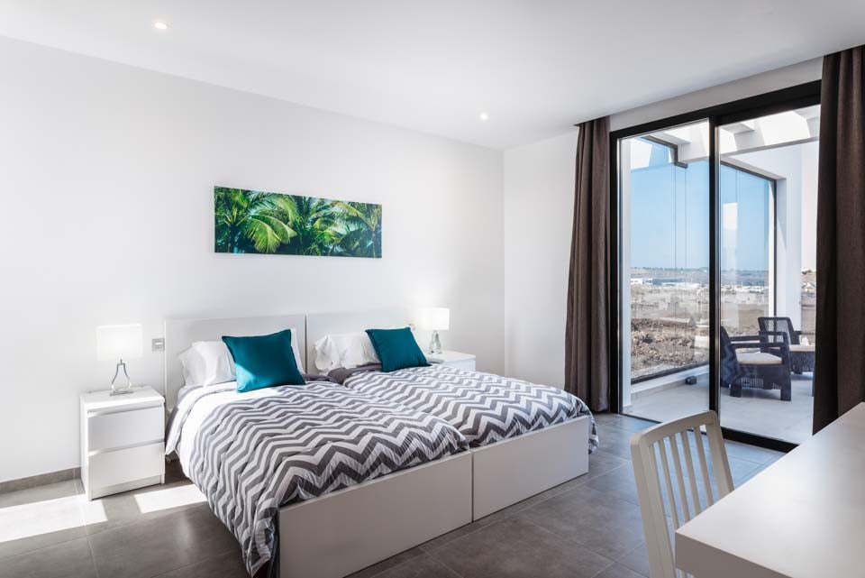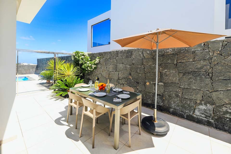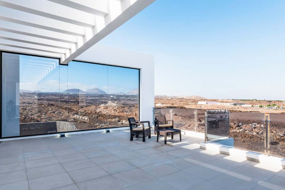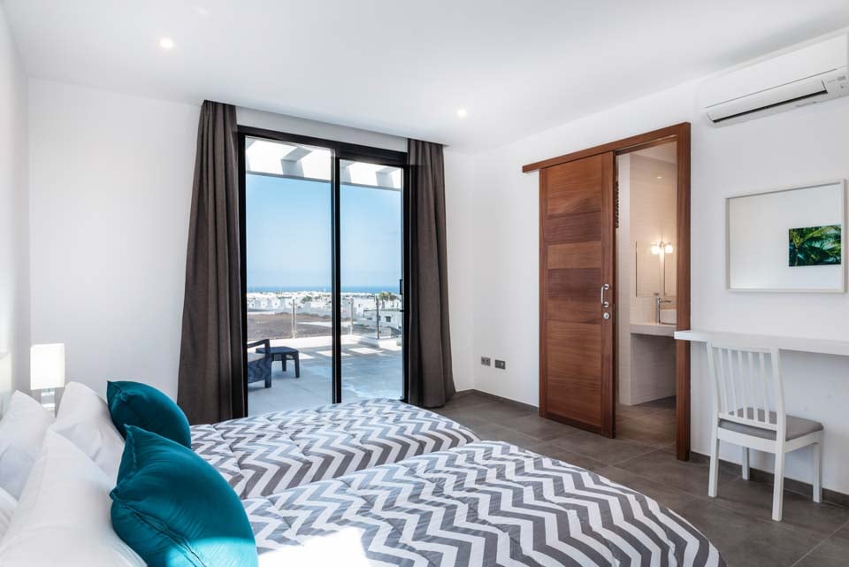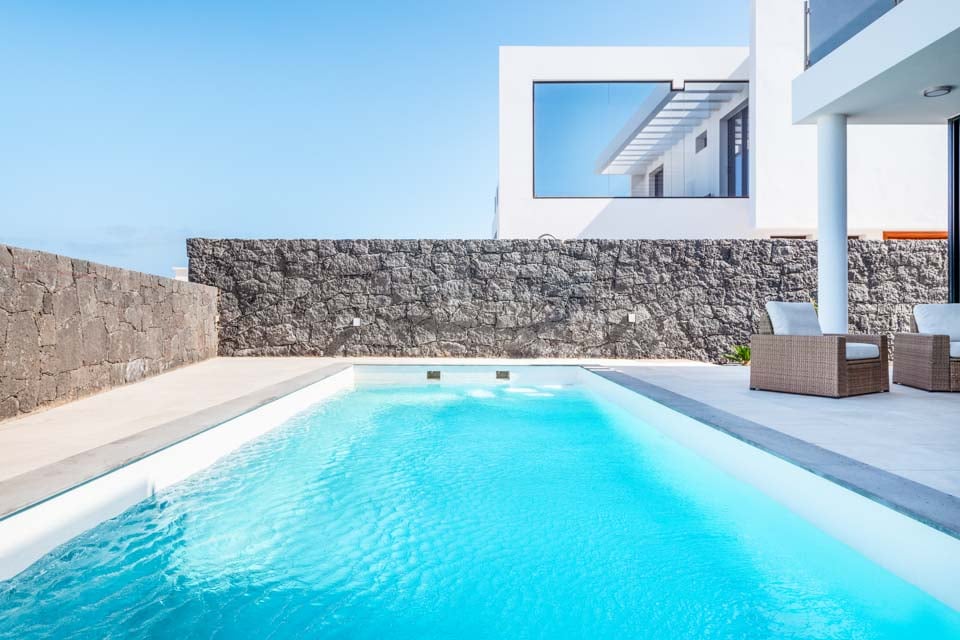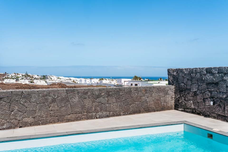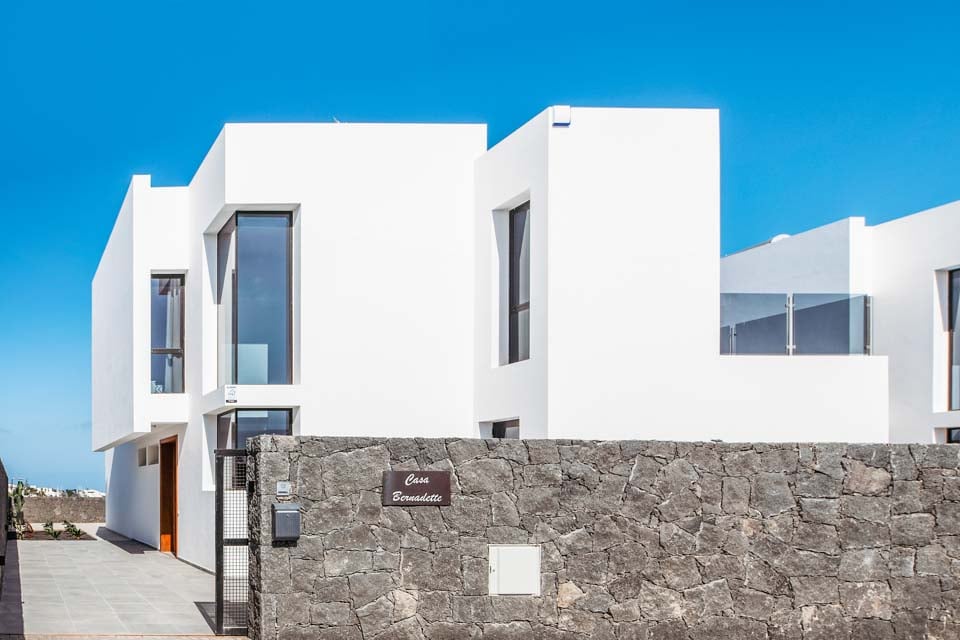 Med en privat uppvärmd* pool erbjuder Villa Bernadette den perfekta terrassen för dagar utomhus. Njut av solstrålarna på en av de vilstolarna eller njut av de mysiga sofforna i sällskap av en god bok. Denna slutna terrass, med sina vulkaniska stenmurar, ståtar med utsikt över det rustika landskapet med berg och hav i fjärran. För måltider utomhus finns det en matgrupp utomhus, skuggad av ett parasoll och en grill för att grilla kulinariska läckerheter. Altandörrar från golv till tak leder från terrassen till inomhusområdet, där du möts av ett modernt och elegant vardagsrum och kök med öppen planlösning. Detta rymliga rum med vitkalkade väggar har svartvita färger, sval luftkonditionering och moderna möbler. Det finns också sovrum nummer ett på bottenvåningen, ett dubbelrum med altandörrar till terrassen och ett eget badrum med dusch. På första våningen hittar vi de återstående två sovrummen, ett dubbelrum och ett tvåbäddsrum, båda med eget badrum.
