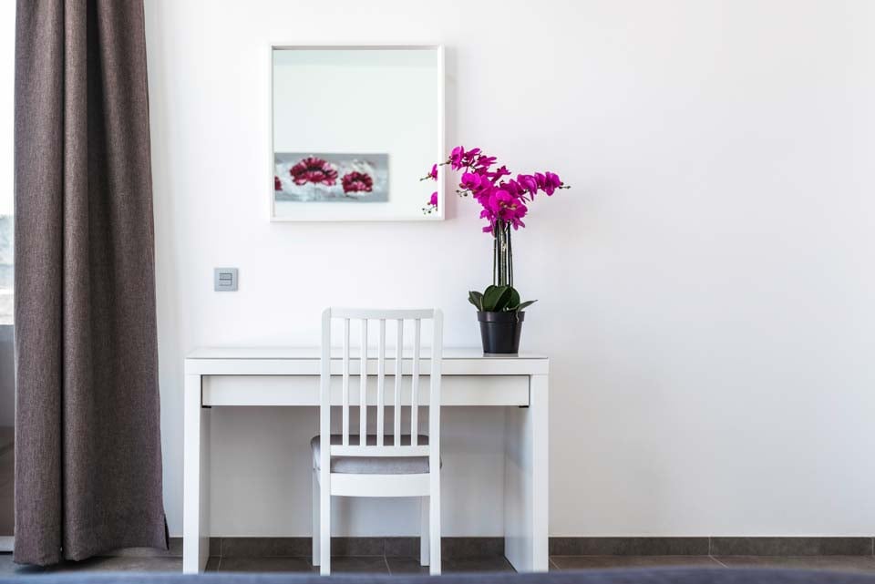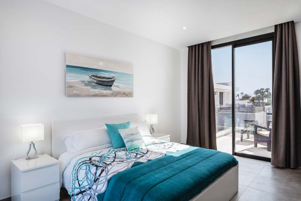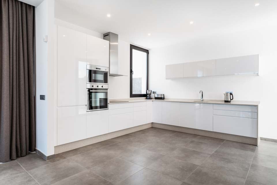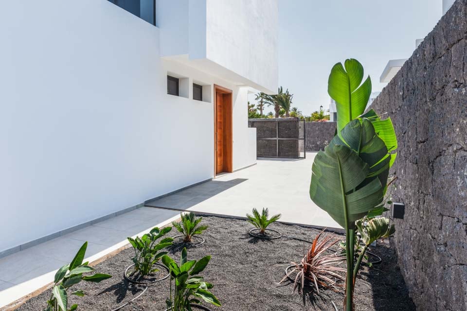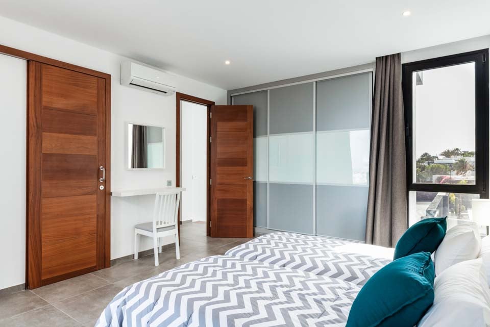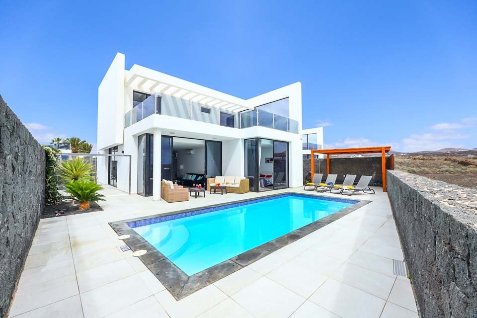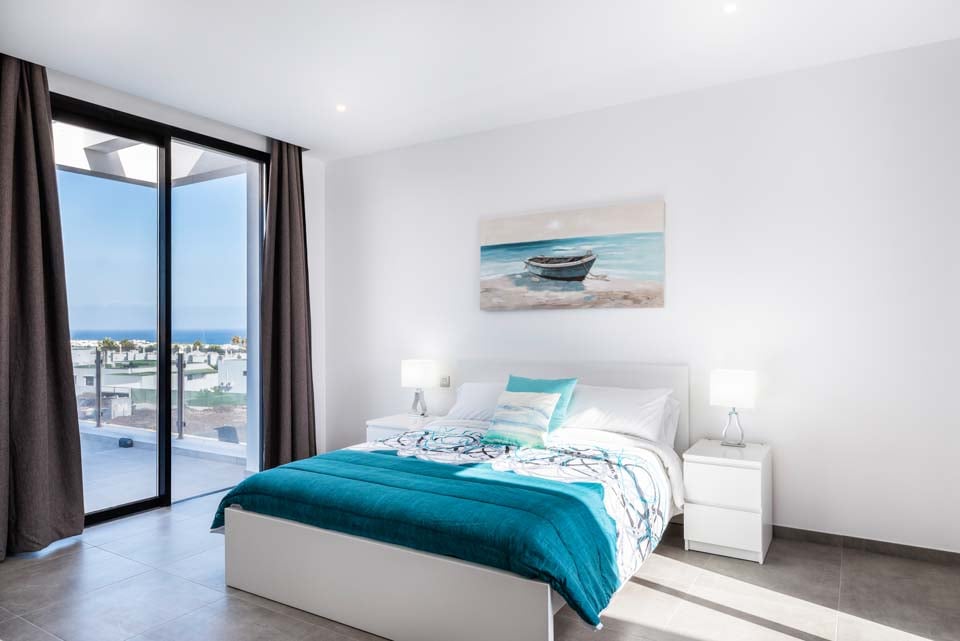 Med en privat uppvärmd* pool erbjuder Villa Bernadette den perfekta terrassen för dagar utomhus. Njut av solstrålarna på en av de vilstolarna eller njut av de mysiga sofforna i sällskap av en god bok. Denna slutna terrass, med sina vulkaniska stenmurar, ståtar med utsikt över det rustika landskapet med berg och hav i fjärran. För måltider utomhus finns det en matgrupp utomhus, skuggad av ett parasoll och en grill för att grilla kulinariska läckerheter. Altandörrar från golv till tak leder från terrassen till inomhusområdet, där du möts av ett modernt och elegant vardagsrum och kök med öppen planlösning. Detta rymliga rum med vitkalkade väggar har svartvita färger, sval luftkonditionering och moderna möbler. Det finns också sovrum nummer ett på bottenvåningen, ett dubbelrum med altandörrar till terrassen och ett eget badrum med dusch. På första våningen hittar vi de återstående två sovrummen, ett dubbelrum och ett tvåbäddsrum, båda med eget badrum.