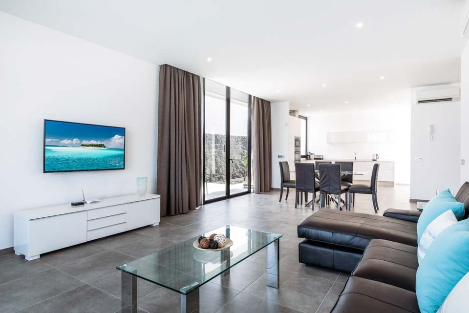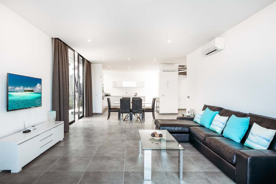 Bekväm sittgrupp, Luftkonditionering, Smart-TV, Matplats, Öppen planlösning, Terrassdörrar