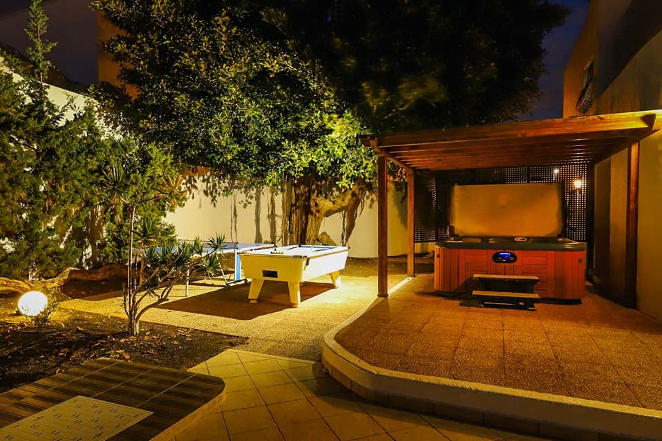 Biljardbord, Bubbelpool, Täckt terrass, Matsal utomhus, Matmöjligheter utomhus, Matplats, Solstolar, Grill, Tegelgrill, Bordtennis