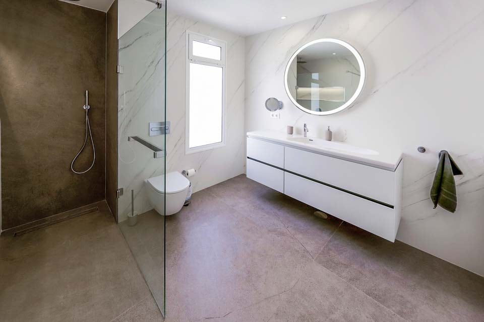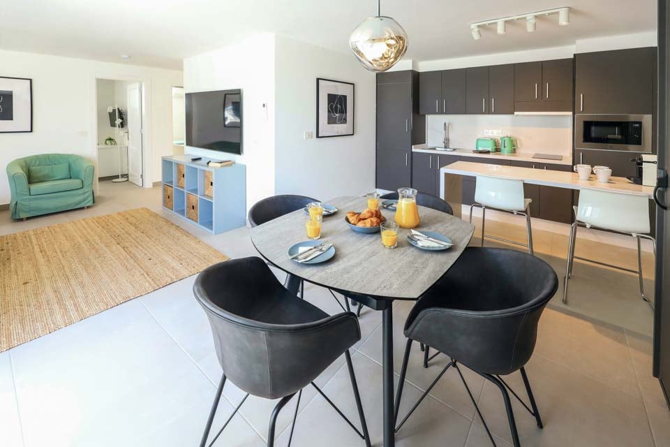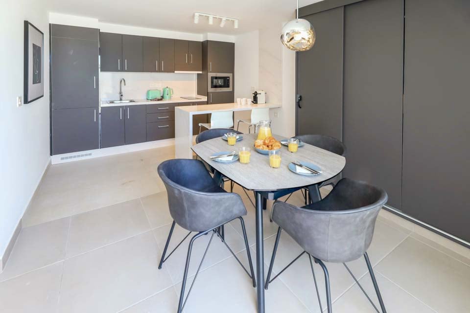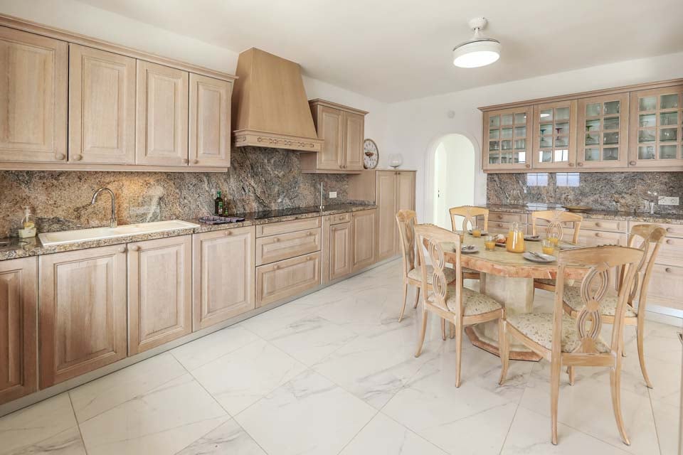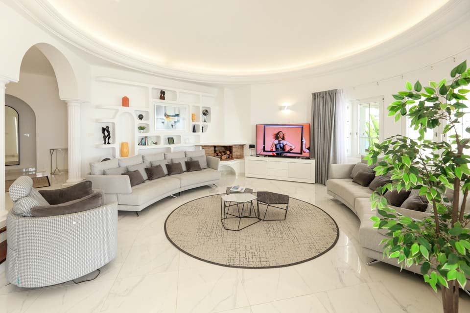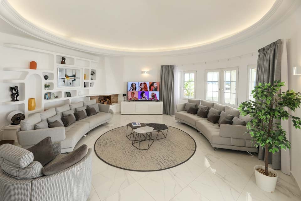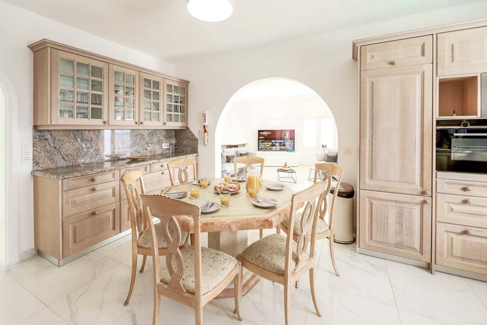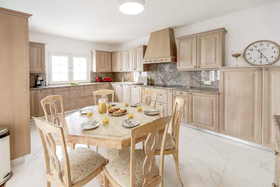 Terrassdörrar leder från terrassen till vardagsrummet med rundade soffor, en stor smart-TV och ett urval av böcker för din semesterläsning. Två trappsteg leder till köket, som är fullt utrustat med alla de senaste köksapparaterna. Med fyra sovrum och fyra badrum är denna villa ett måste för upp till åtta gäster