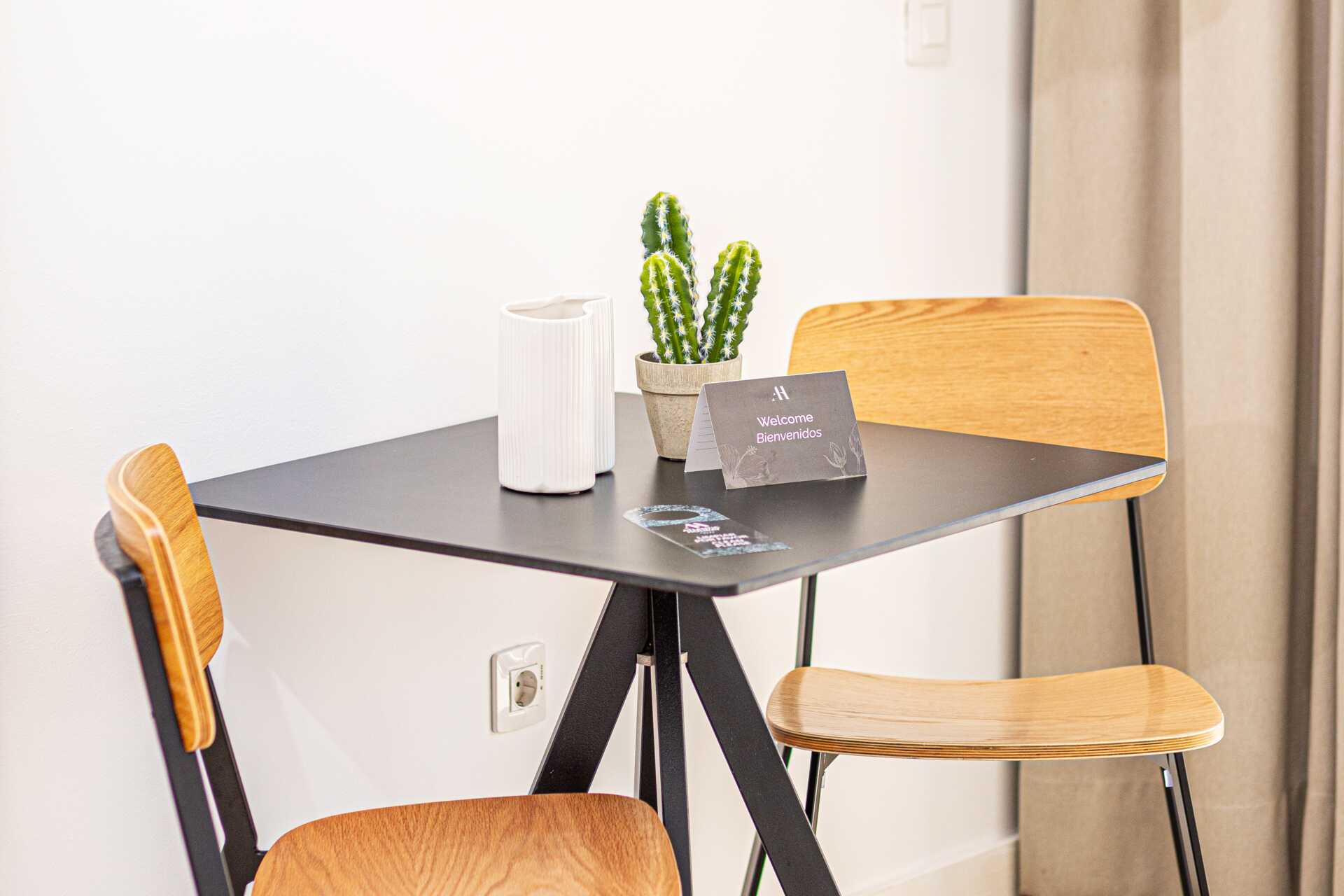 Tvårumslägenhet med balkong och havsutsikt eller med balkong som vetter mot vägen. Ett sovrum och ett kombinerat vardagsrum med minikök. I vissa lägenheter är köket separat. En dubbelsäng eller två enkelsängar. Möjlighet till extrabäddar i bäddsoffa. Minikök med kokplattor, vattenkokare, kaffebryggare, brödrost, kylskåp och enkel köksutrustning. Wifi ingår. Deponering mot avgift. Tv med skandinaviska och internationella kanaler. Hårtork. Badrum med dusch och wc. Städning 5 ggr/vecka.