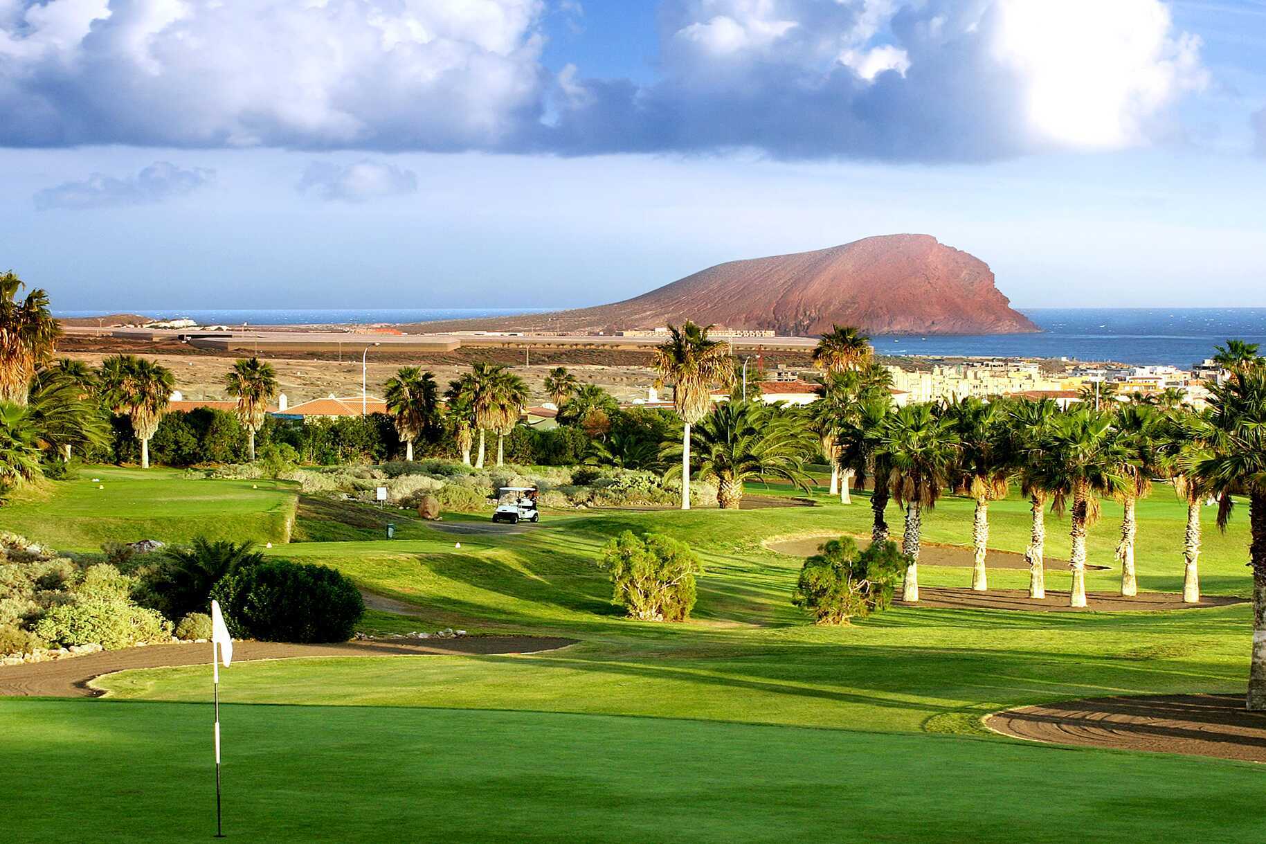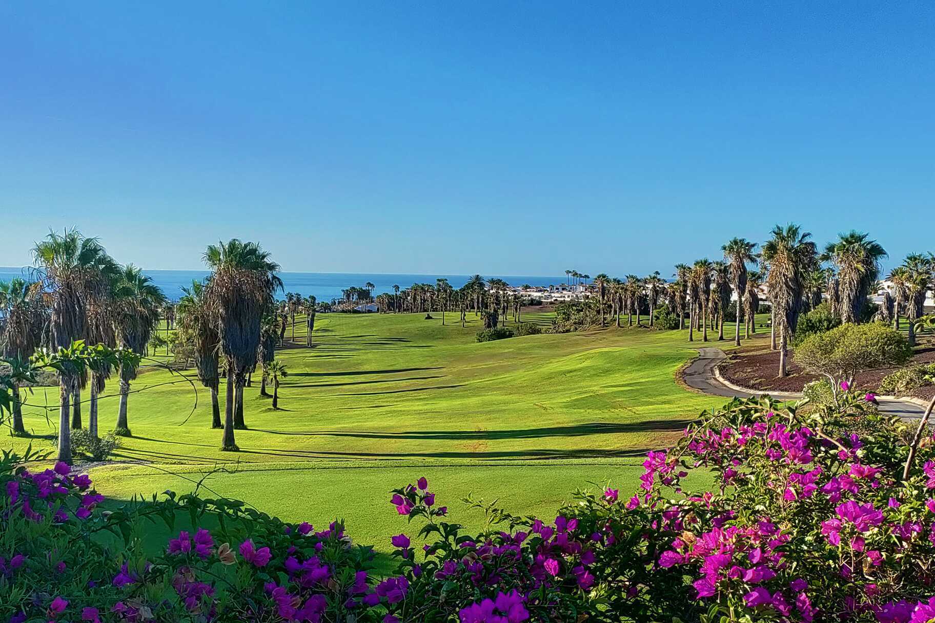 Golf del Sur - Teneriffas paradis för golfälskare! Här möts du av ett frodigt landskap med palmkantade vägar, färgstarka växter och spektakulära golfbanor som slingrar sig mellan raviner, vulkansand och havsutsikt – med banor som lockar både nybörjare och proffs. Men det är så mycket mer än bara golfbanor, här finns restauranger och butiker om än i mindre skala än i de närbelägna större semesterorterna Los Cristianos och Playa de las Americas.
