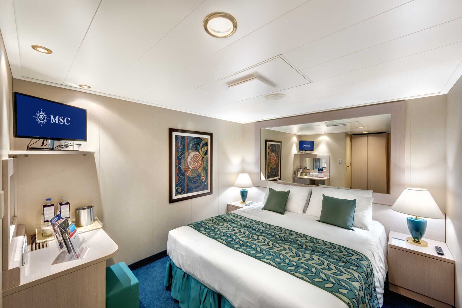 Insideshytt Deluxe, däck 5-11 . En dubbelsäng och möjlighet till extrabäddar i bäddsoffa (i visssa fall våningsäng). Fåtölj. Wifi mot avgift. Deponering. Tv, minibar. Hårtork. Badrum med dusch och wc. Balkong som är cirka 4-5 kvadratmeter. Bilden visar endast ett exempel på hur hytten kan se ut.