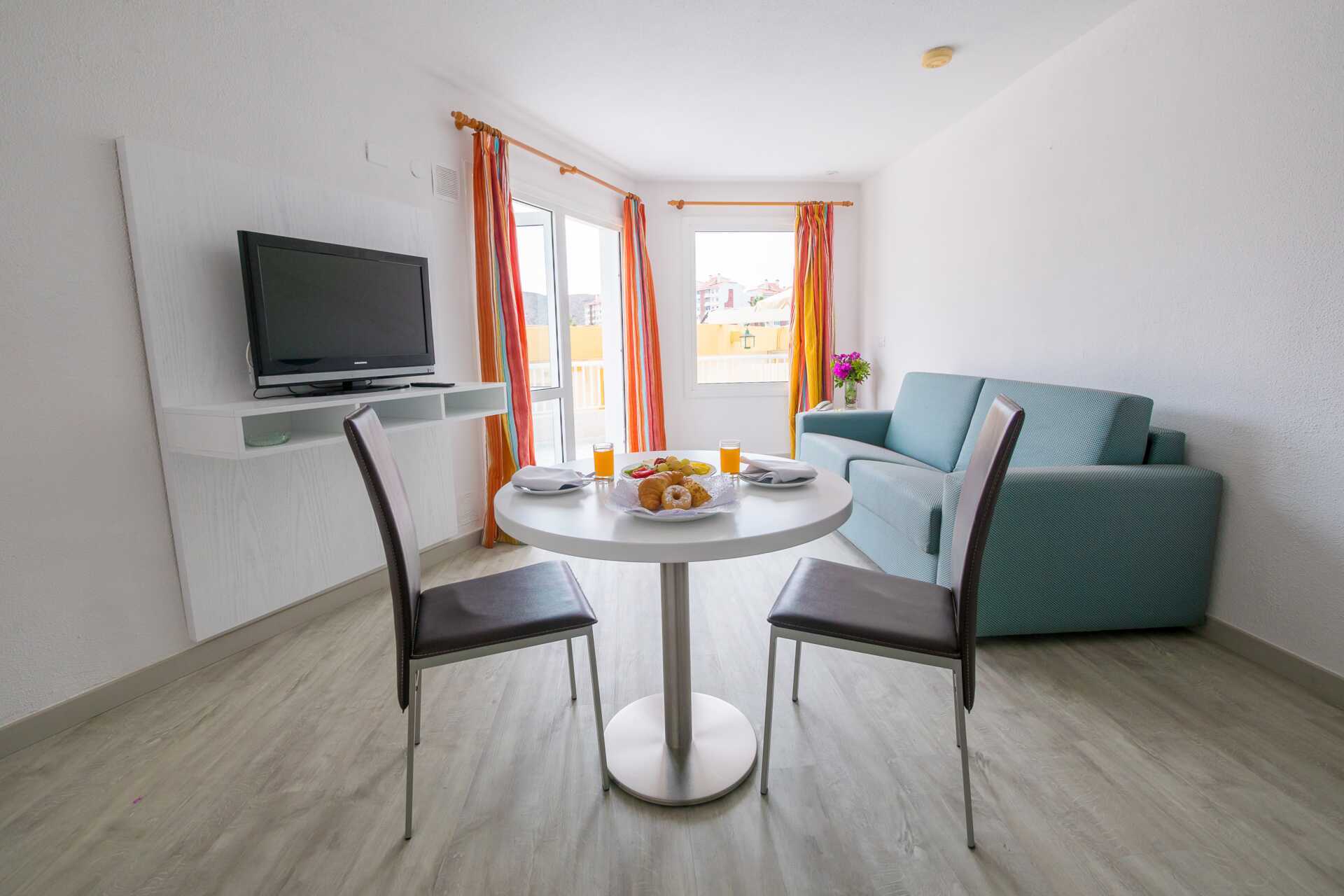 Tvårumslägenhet med balkong eller terrass. Ett sovrum och kombinerat vardagsrum och minikök. Två enkelsängar. Möjlighet till extrabäddar i en bäddsoffa. Minikök med kylskåp, kokplattor, mikrovågsugn, vattenkokare, kaffebryggare, brödrost och enkel köksutrustning. Wifi ingår. Deponering mot avgift. Tv med internationella kanaler. Badrum med dusch och wc. Städning 3 ggr/vecka.