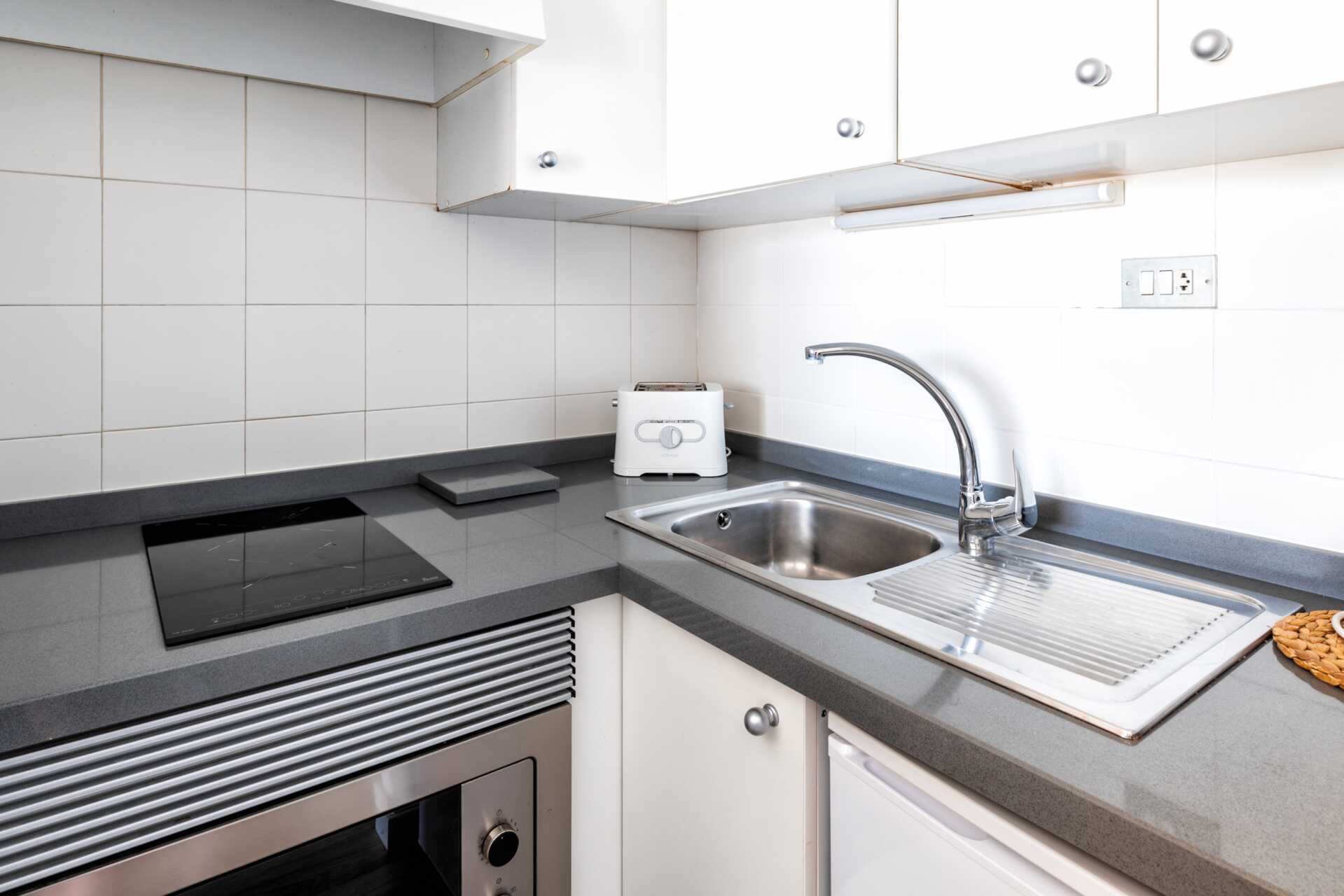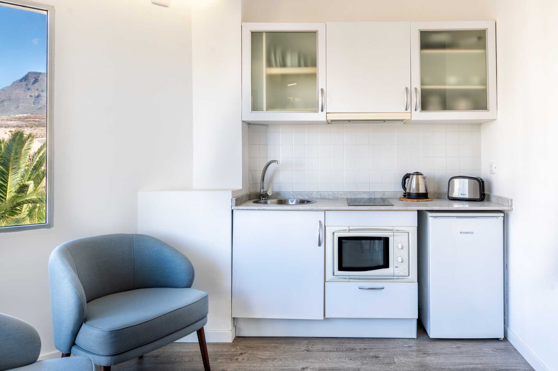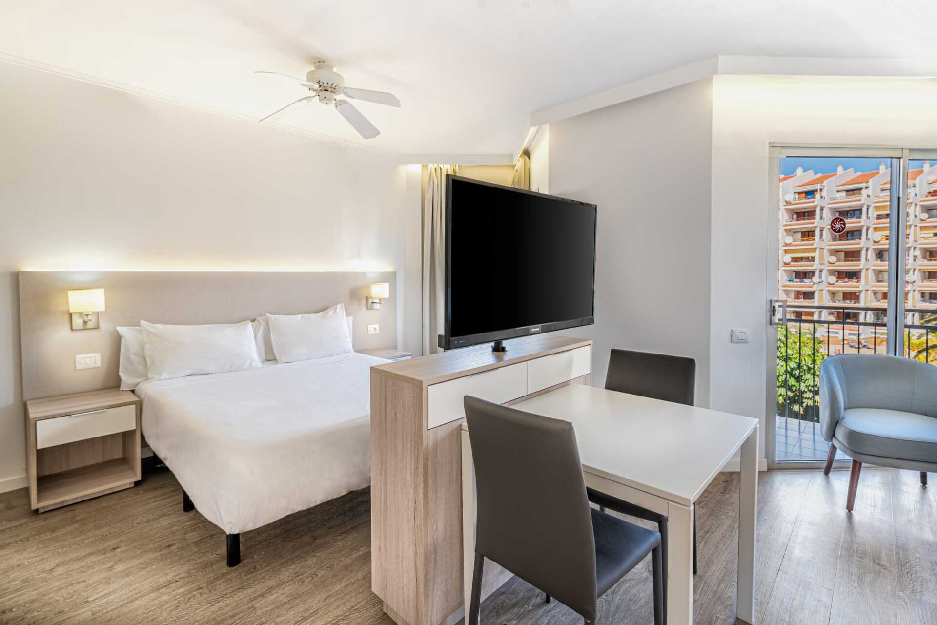 Enrumslägenhet med balkong eller terrass samt poolutsikt. Lägenheterna ligger i en byggnad med sex våningar med hiss. Sovrum kombinerat med minikök. En dubbelsäng eller två enkelsängar. Minikök med kylskåp, kokplattor, kombinerad ugn och mikrovågsugn, vattenkokare, brödrost och enkel köksutrustning. Wifi och deponering mot avgift. Takfläkt finns i sovrummet. Tv med internationella kanaler. Hårtork. Badrum med badkar eller dusch samt wc. Städning 5 ggr/vecka.