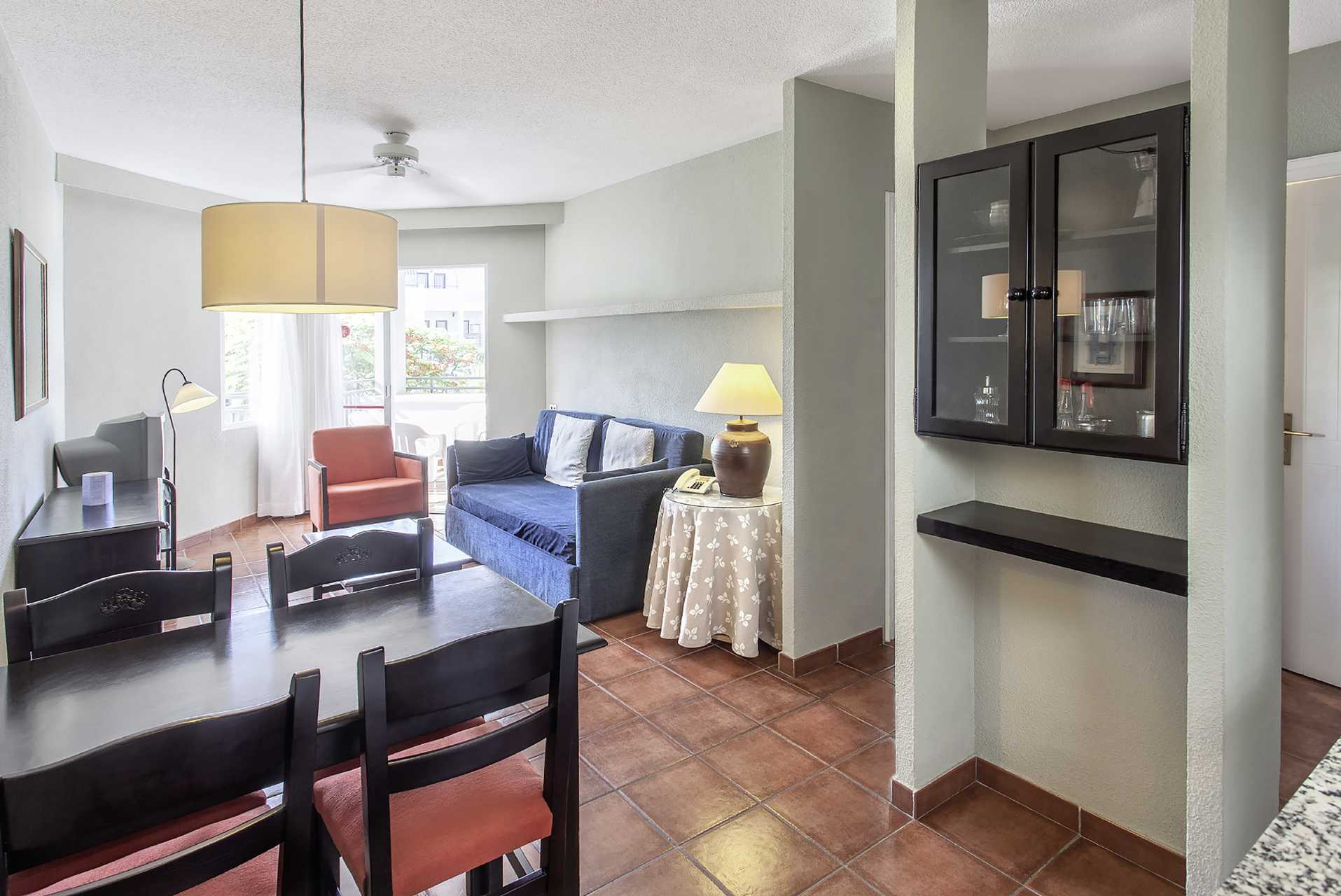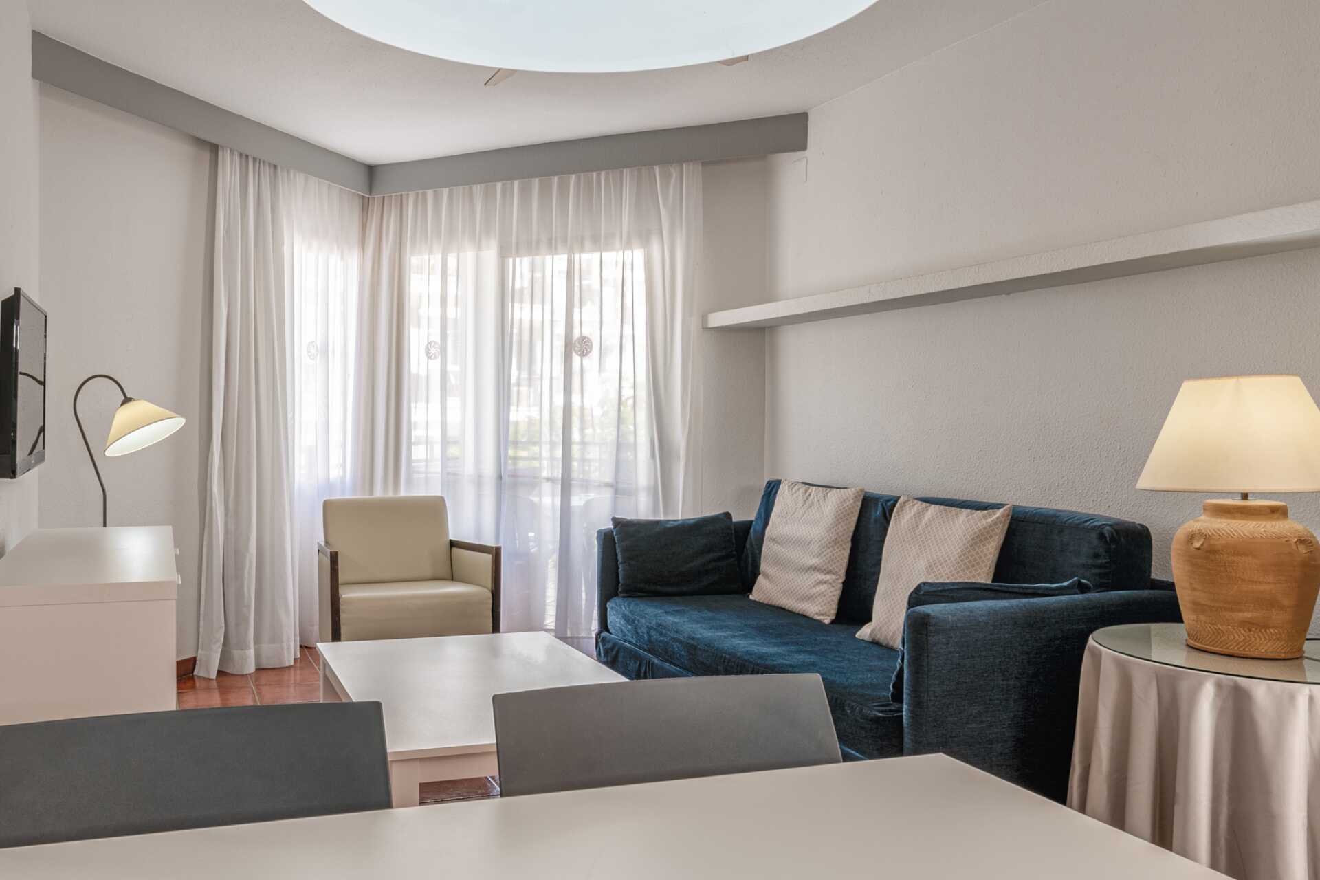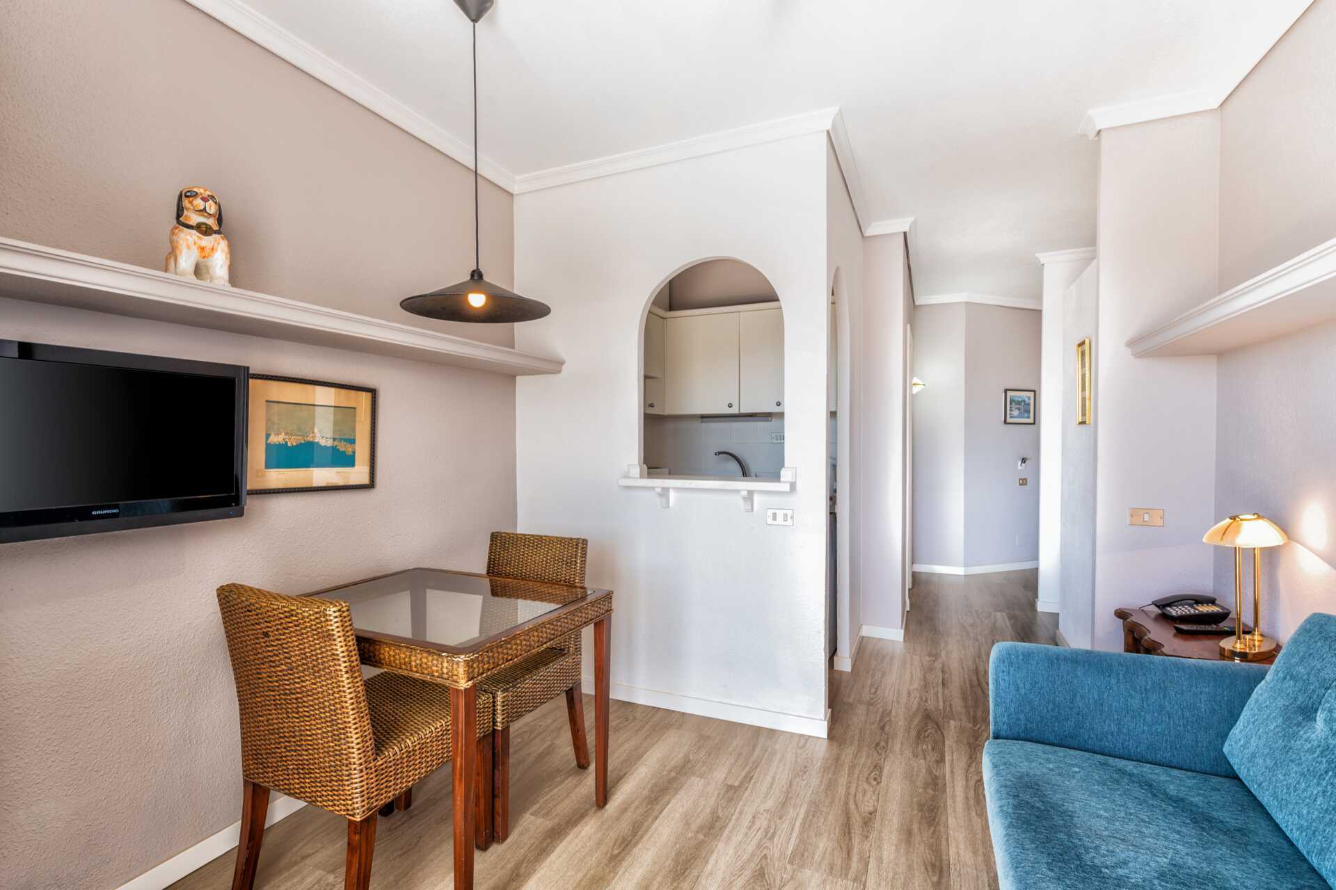 Något slitna tvårumslägenheter med balkong eller terrass, vissa med poolutsikt. Sovrum och kombinerat vardagsrum med minikök. En dubbelsäng eller två enkelsängar. Möjlighet till extrabäddar i bäddsoffa. Minikök med kylskåp, kokplattor, ugn, vattenkokare, brödrost och enkel köksutrustning. Wifi och deponering mot avgift. Takfläkt i vardagsrummet. Tv med internationella kanaler. Hårtork. Badrum med badkar eller dusch samt wc. Städning 5 ggr/vecka.