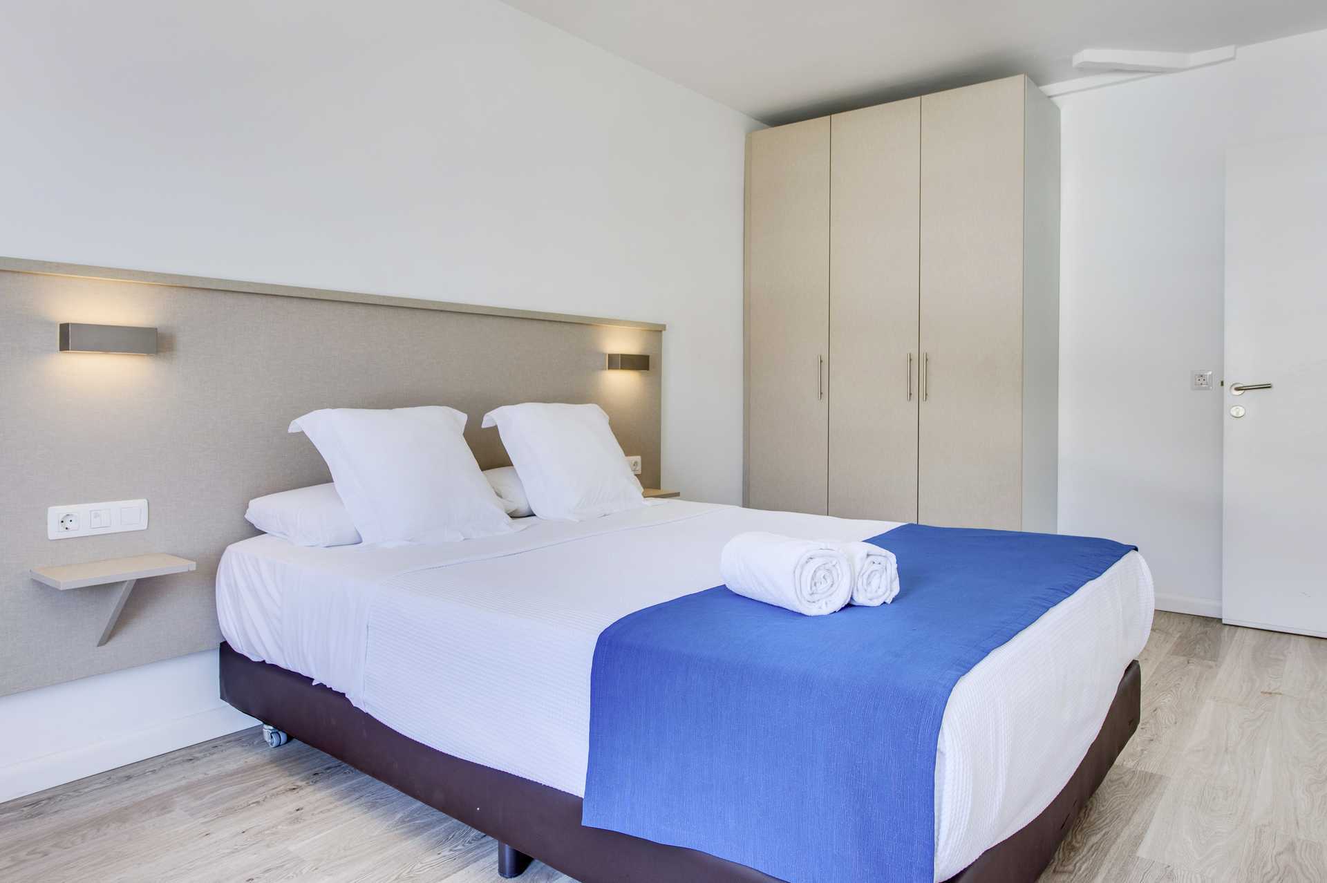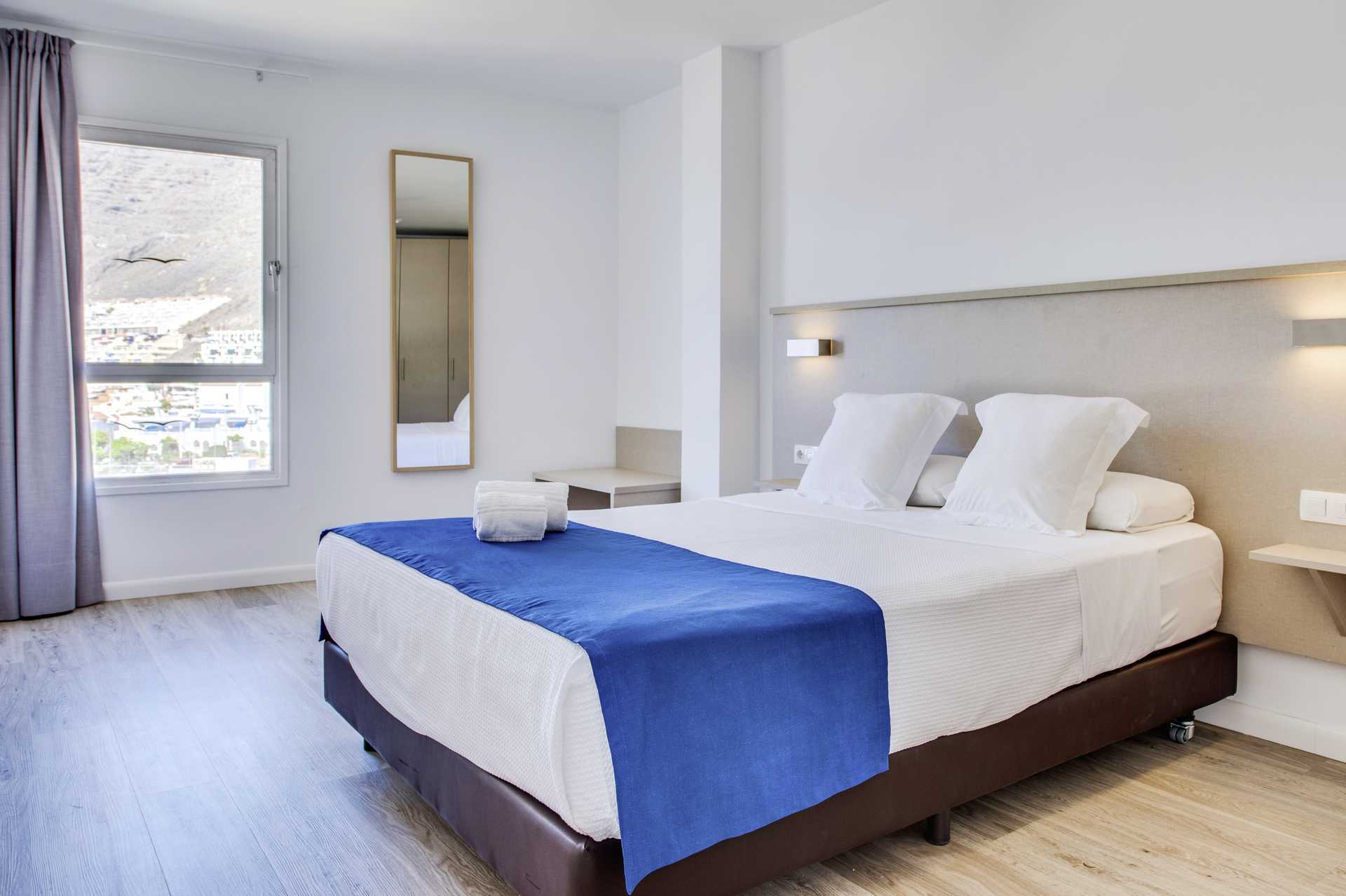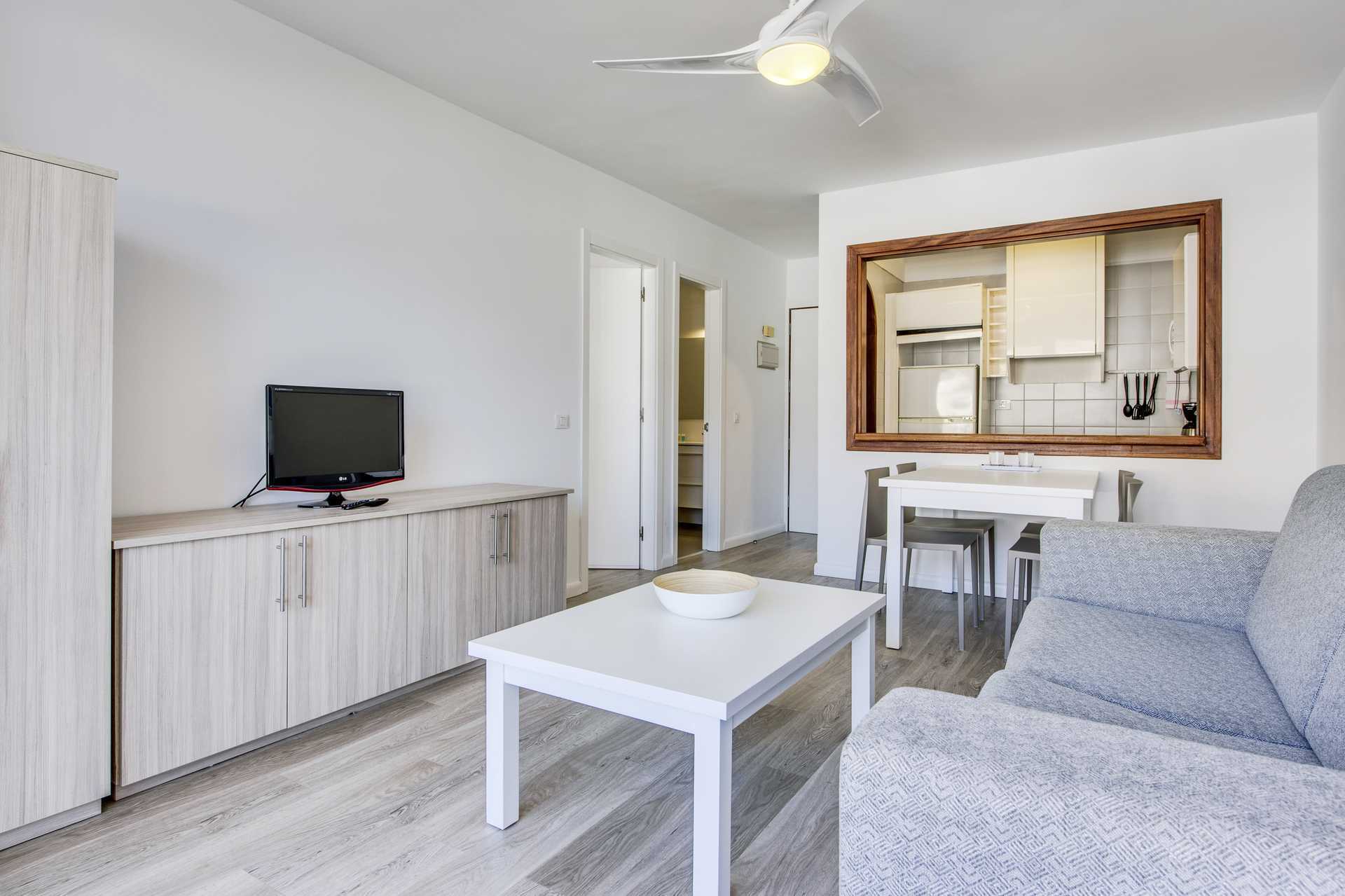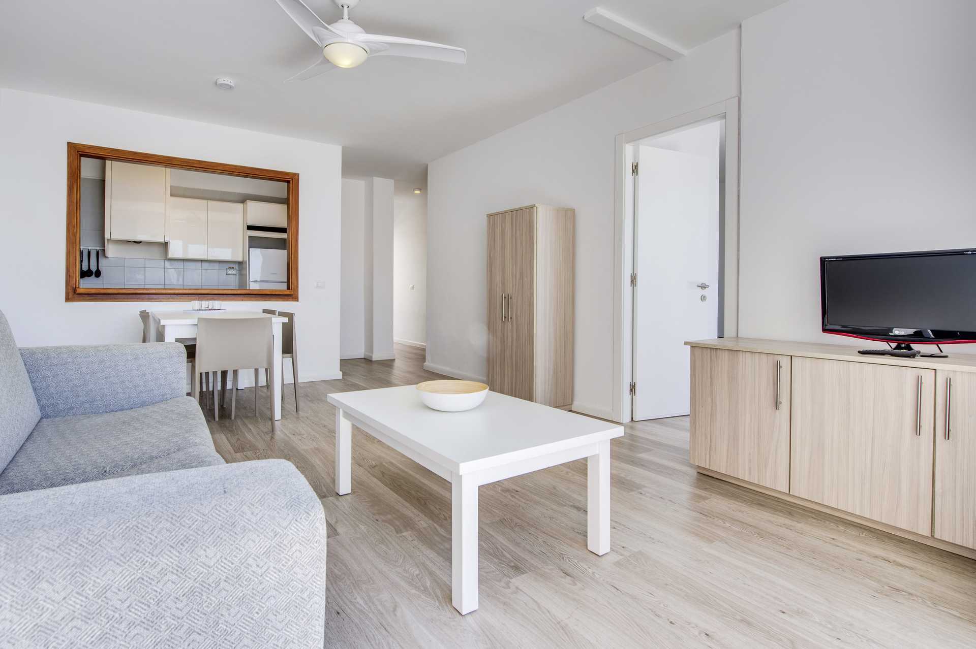 Trerumslägenhet med balkong, vissa med begränsad havsutsikt. Lägenheterna varierar i storlek och planlösning. Två sovrum och kombinerat vardagrsum med minikök. Ett sovrum med en dubbelsäng och ett med två enkelsängar. Möjlighet till extrabäddar i bäddsoffa. Minikök med kylskåp, kokplattor, mikrovågsugn, kaffebryggare, vattenkokare, brödrost och enkel köksutrustning. Wifi och deponering mot avgift. Takfläkt finns i alla rum. Tv med internationella kanaler. Strykjärn och strykbräda. Hårtork. Badrum med dusch och wc. Städning 3 ggr/vecka.