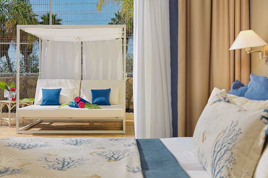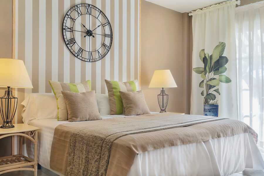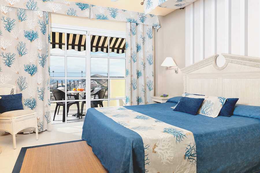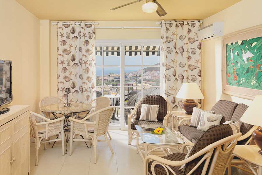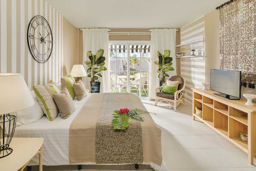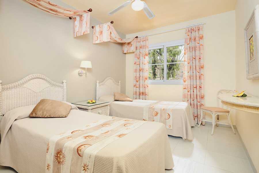 Tvårumslägenhet i etage med balkong, vissa med utsikt mot golfbanan eller med poolutsikt. I entréplan finns ett sovrum med takfläkt samt två enkelsängar och ett badrum med hårtork, badkar och wc. Rn trappa upp finns ett kombinerat vardagsrum med kök och balkong. Möjlighet till extrabädd i bäddsoffa. Kök med kylskåp, kokplattor, ugn, mikrovågsugn, kaffebryggare, vattenkokare och enkel köksutrustning. Luftkonditionering och wifi ingår. Deponering mot avgift. Tv med internationella kanaler. Städning 7 ggr/vecka.