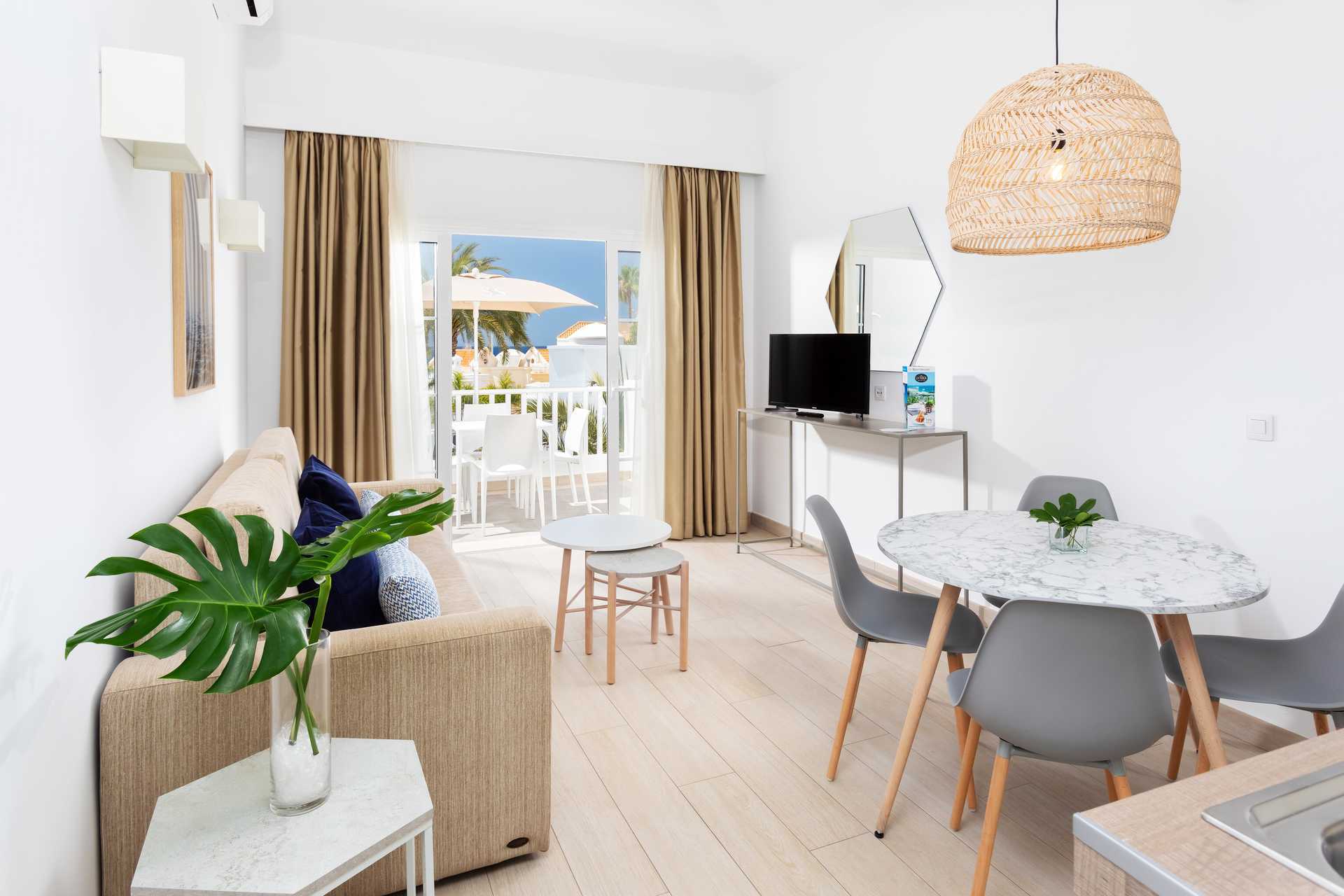 Tvårumslägenhet deluxe med balkong och begränsad havsutsikt på de övre våningarna. Lägenheterna ligger på hotellets översta våning och består av sovrum och kombinerat vardagsrum med minikök. Två enkelsängar. Möjlighet till extrabäddar i bäddsoffa. Minikök med kokplattor, kylskåp, mikrovågsugn, kaffekokare, vattenkokare, brödrost och enkel köksutrustning. Kaffemaskin - kapslar ingår. Wifi och luftkonditionering ingår. Takfläkt i vardagsrummet. Tv med internationella kanaler. Strykjärn och strykbräda. Hårtork. Badrum med dusch och wc. Städning 7 ggr/vecka.