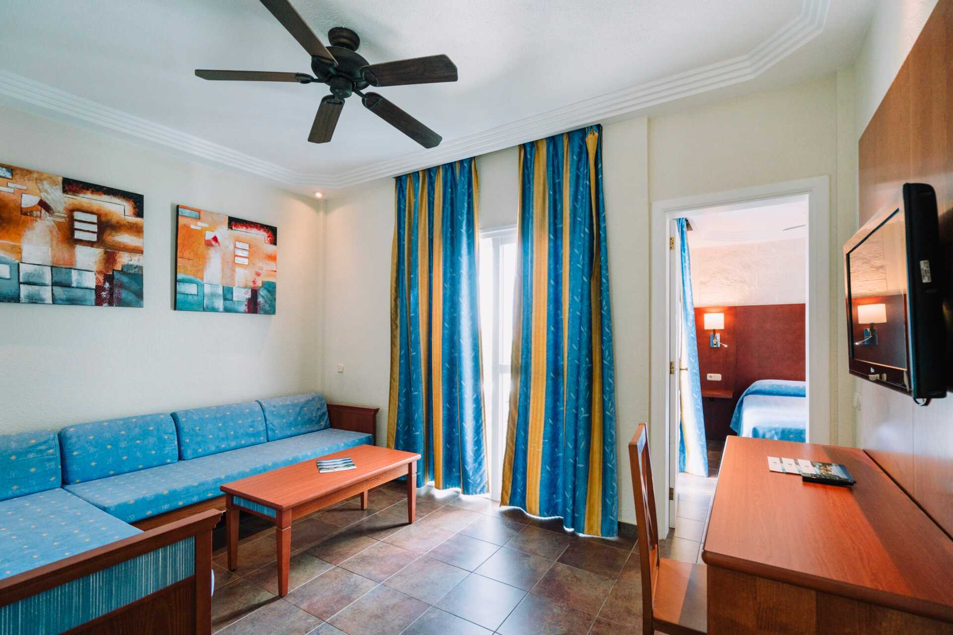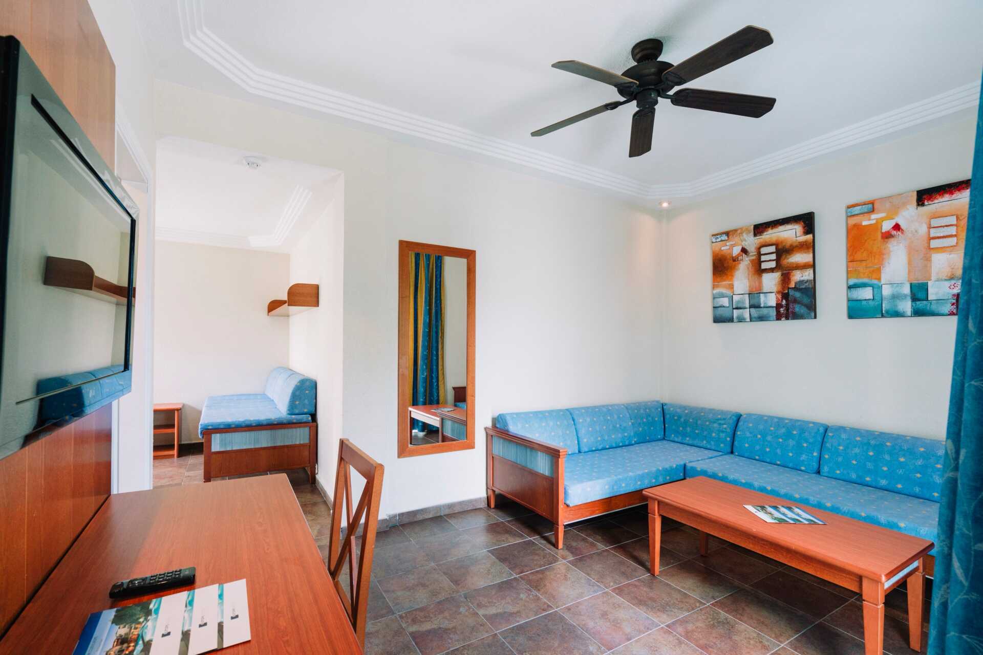Familjerum med balkong eller terrass. Familjerummet består av ett sovrum och ett vardagsrum. Två enkelsängar. Möjlighet till extrabäddar i två bäddsoffor eller i våningssäng. Wifi ingår. Deponering mot avgift. Takfläkt. Kylskåp. Tv med internationella kanaler. Hårtork. Badrum med dusch och wc. Städning 7 ggr/vecka. Barn under två år räknas in i maxantalet personer i rummet.