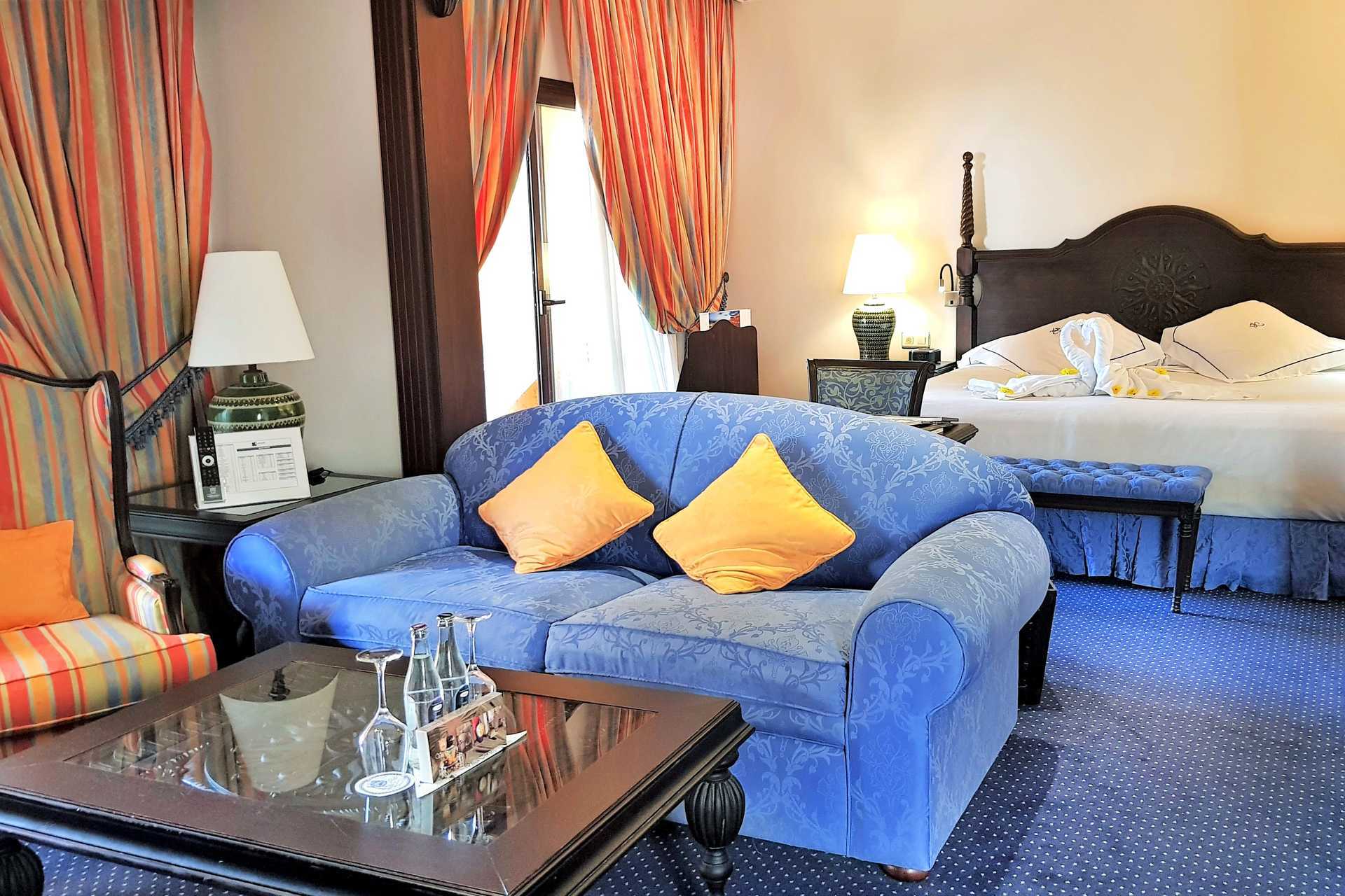 Juniorsvit med balkong eller terrass med havsutsikt. Sovrumsdel och en vardagsrumsdel med öppen planlösning. En dubbelsäng. Möjlighet till extrabädd i bäddsoffa. Wifi, luftkonditionering och deponering ingår. Minibar. Nespresso kaffemaskin. Heltäckningsmatta. Takfläkt. Tv med internationella kanaler och iHome klocka samt laddare för mobil. Badrockar och tofflor. Hårtork. Badrumsartiklar. Badrum med badkar eller dusch samt wc. Städning 7 ggr/vecka. Barn under två år räknas in i maxantalet personer i rummet.