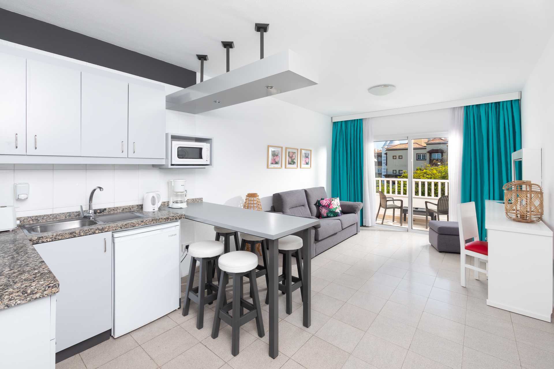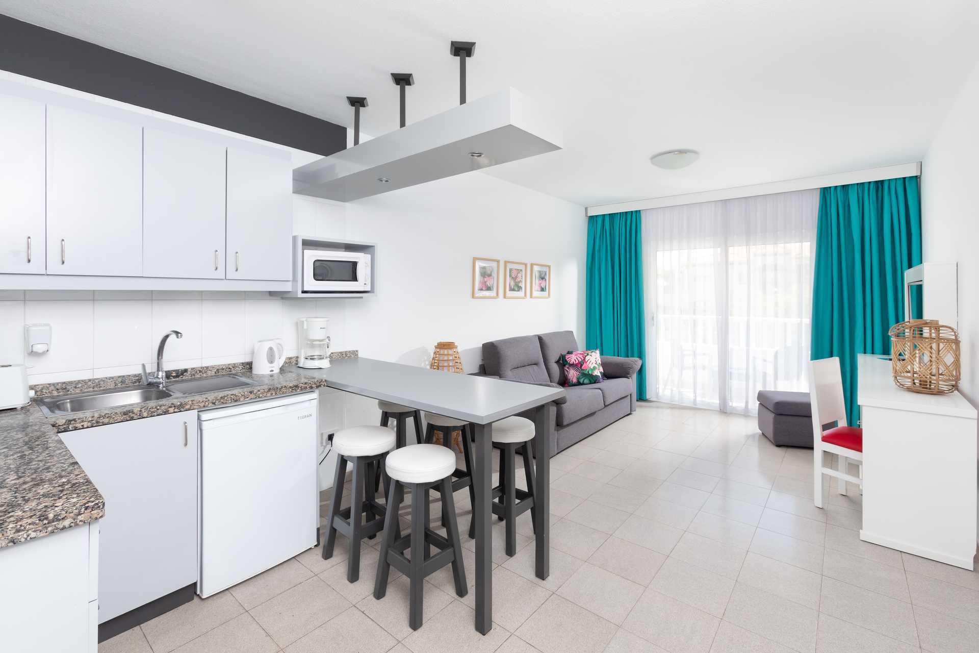 Tvårumslägenhet med balkong. Sovrum och kombinerat vardagsrum med minikök. En dubbelsäng och en dubbelsäng eller två enkelsängar. Möjlighet till extrabäddar i en bäddsoffa. Minikök med kokplattor, kylskåp, mikrovågsugn, brödrost. kaffebryggare och enkel köksutrustning. Matplats vid bardisk. Wifi ingår. Deponering mot deposition och avgift. Tv med internationella kanaler. Hårtork. Badrum med dusch och wc. Städning 5 ggr/vecka.